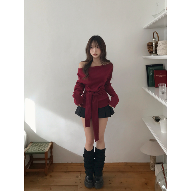 一字肩木耳邊綁帶上衣【4色入】 - 現貨