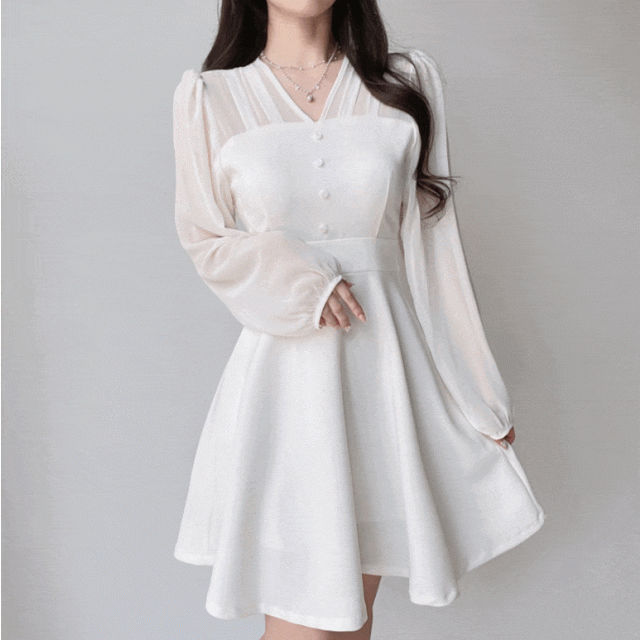 V領蝴蝶結泡泡袖連身裙【3色入】
