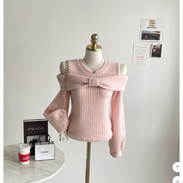 短款絲帶毛毛露肩上衣【3色入】
