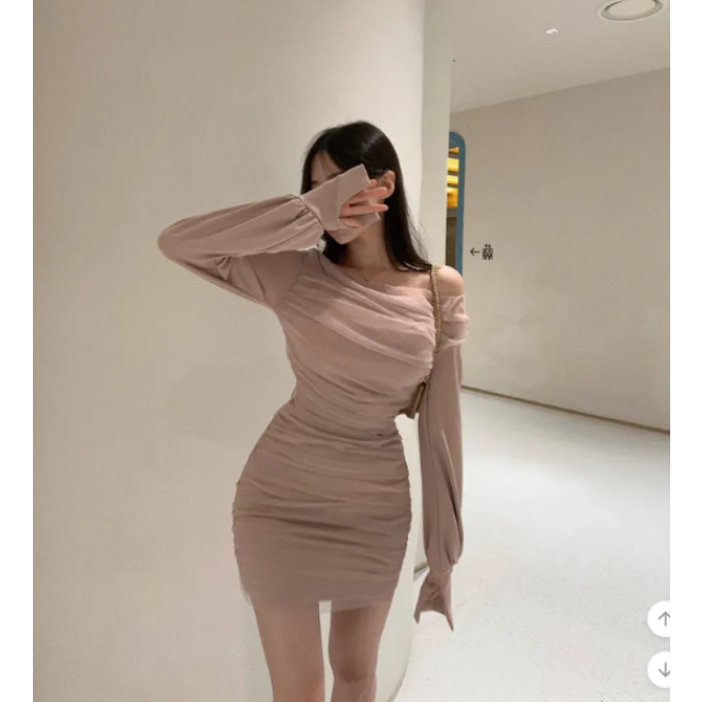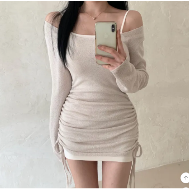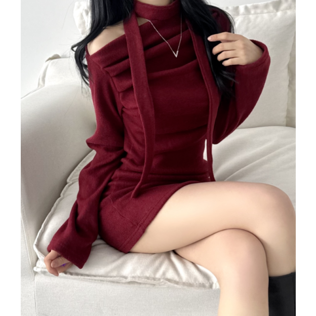 珍珠鈕單露肩褶皺連身裙【3色入】