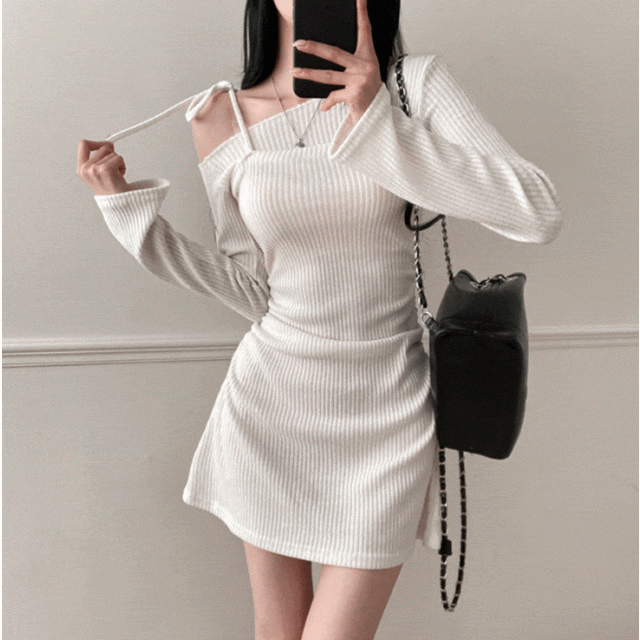 單露肩綁帶針織連身裙【買一送一】