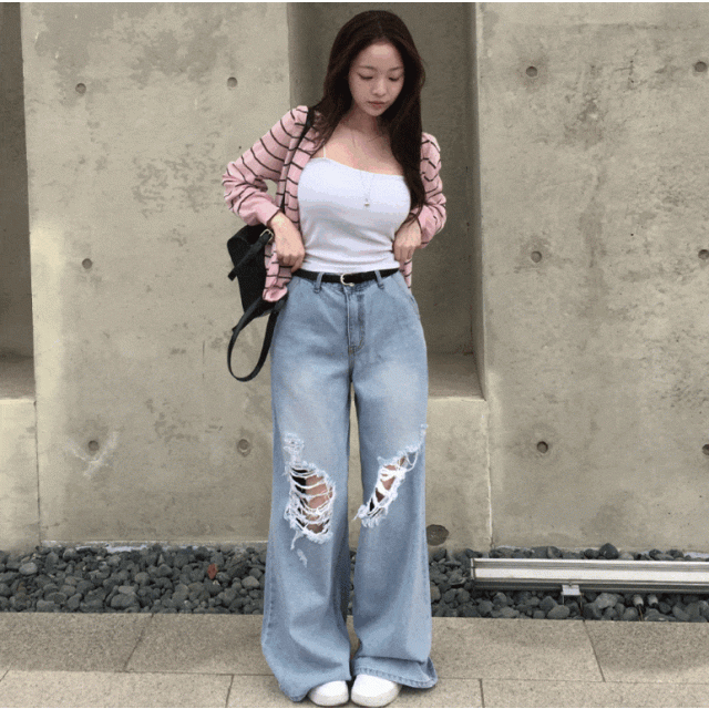 高腰水洗破洞寬版牛仔褲【S-XL】【4色入】
