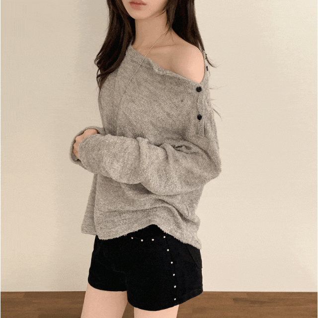 寬鬆單肩側釦長袖針織衫【3色入】 Copy