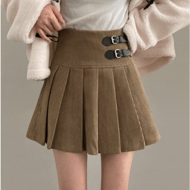 燈芯絨雙腰帶配飾百褶裙 - 現貨