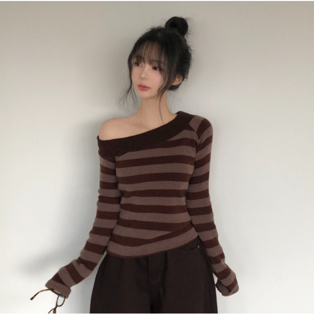 斜露肩條紋針織上衣【3色入】