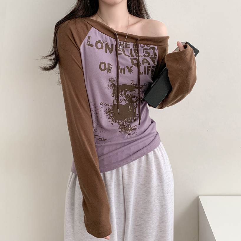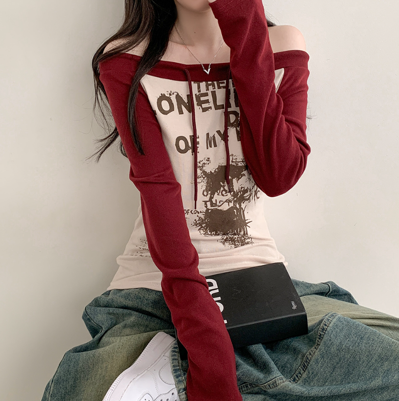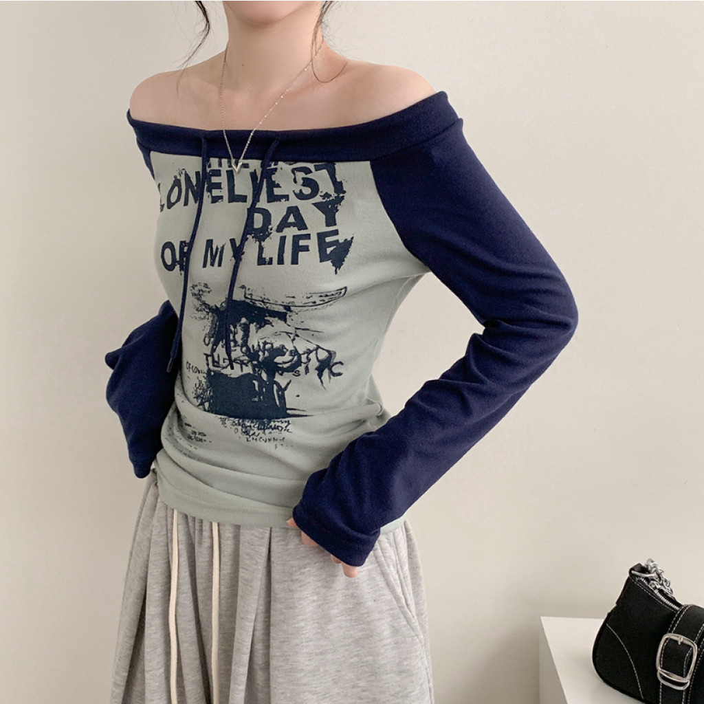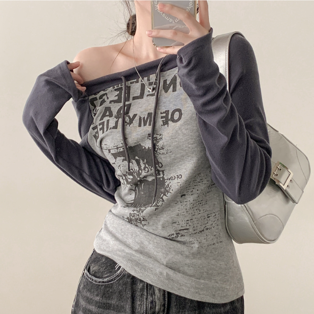 (•‾⌣‾•)拼接露肩長袖T恤❤️帶點Y2K風格💕