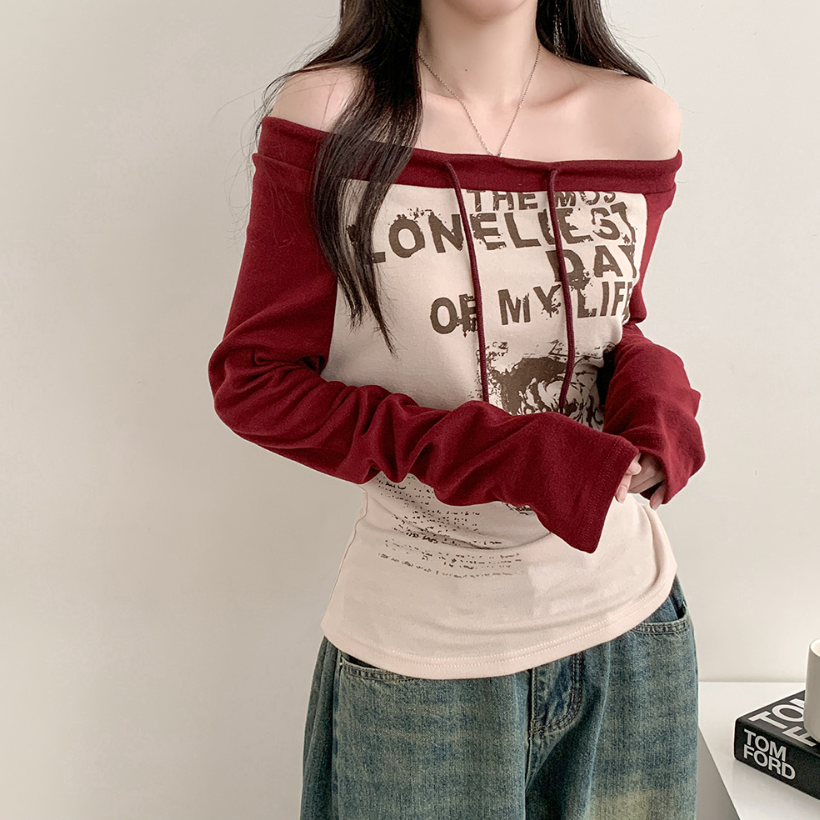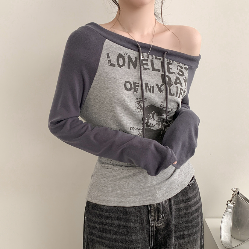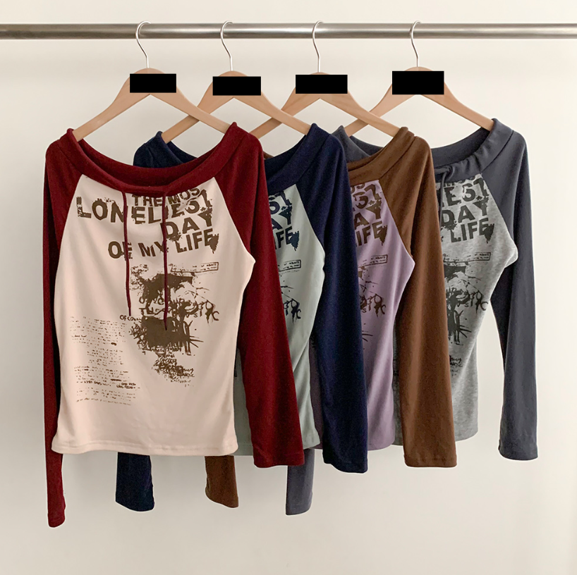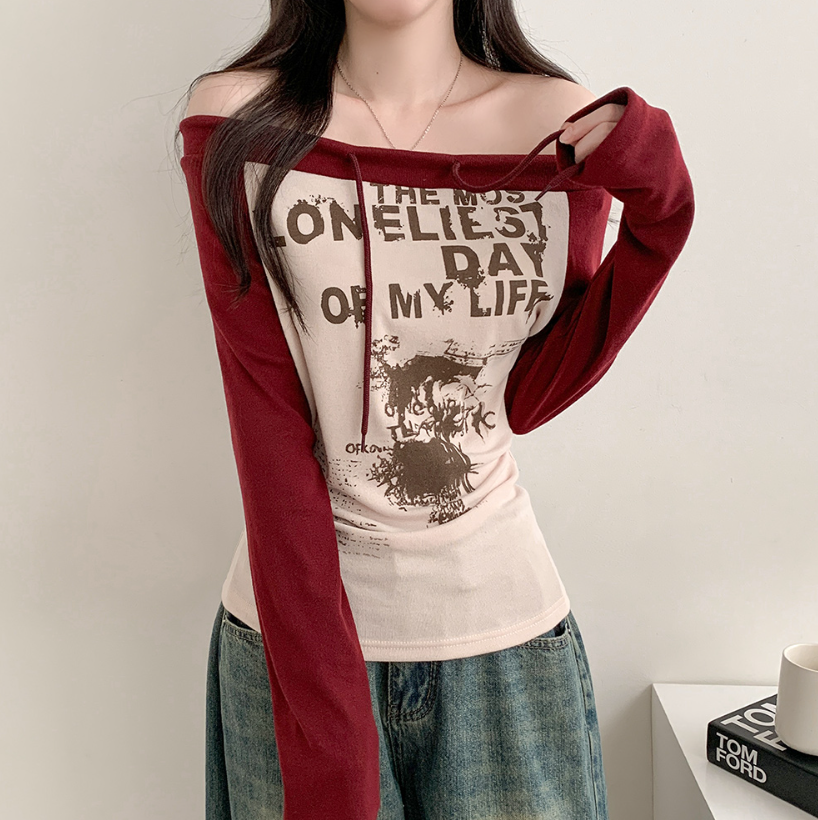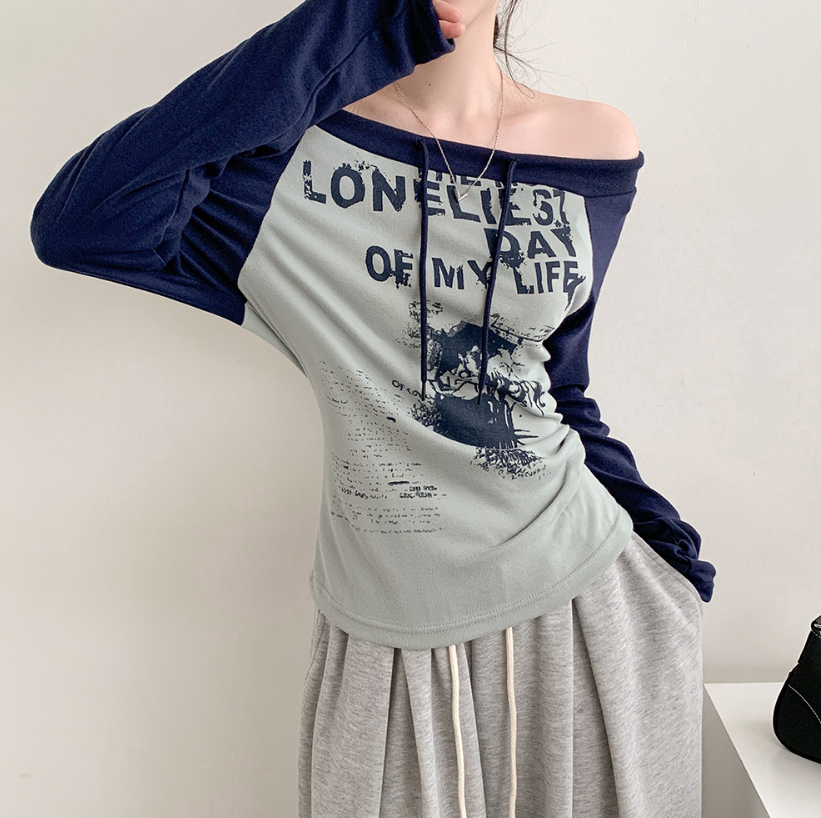 (•‾⌣‾•)拼接露肩長袖T恤❤️帶點Y2K風格💕