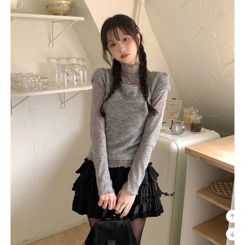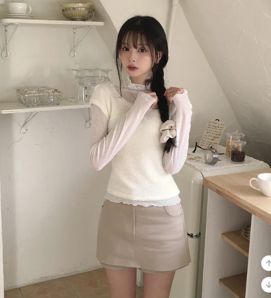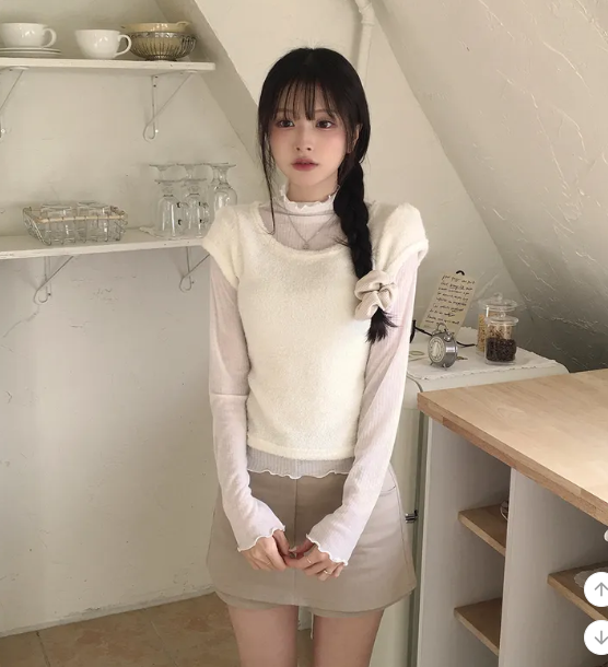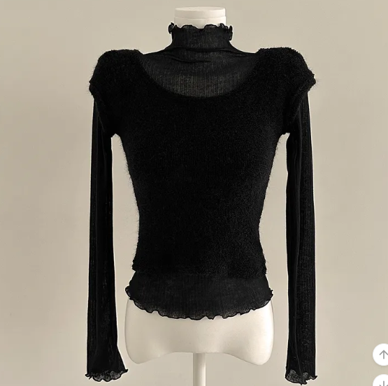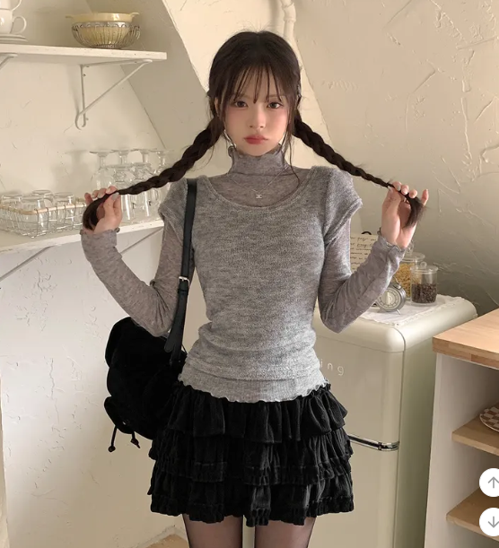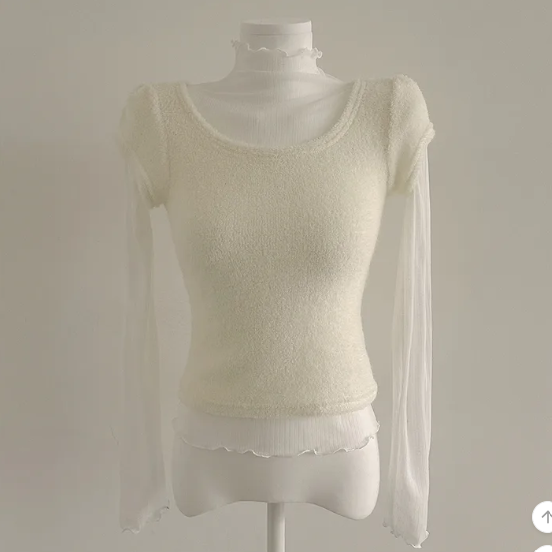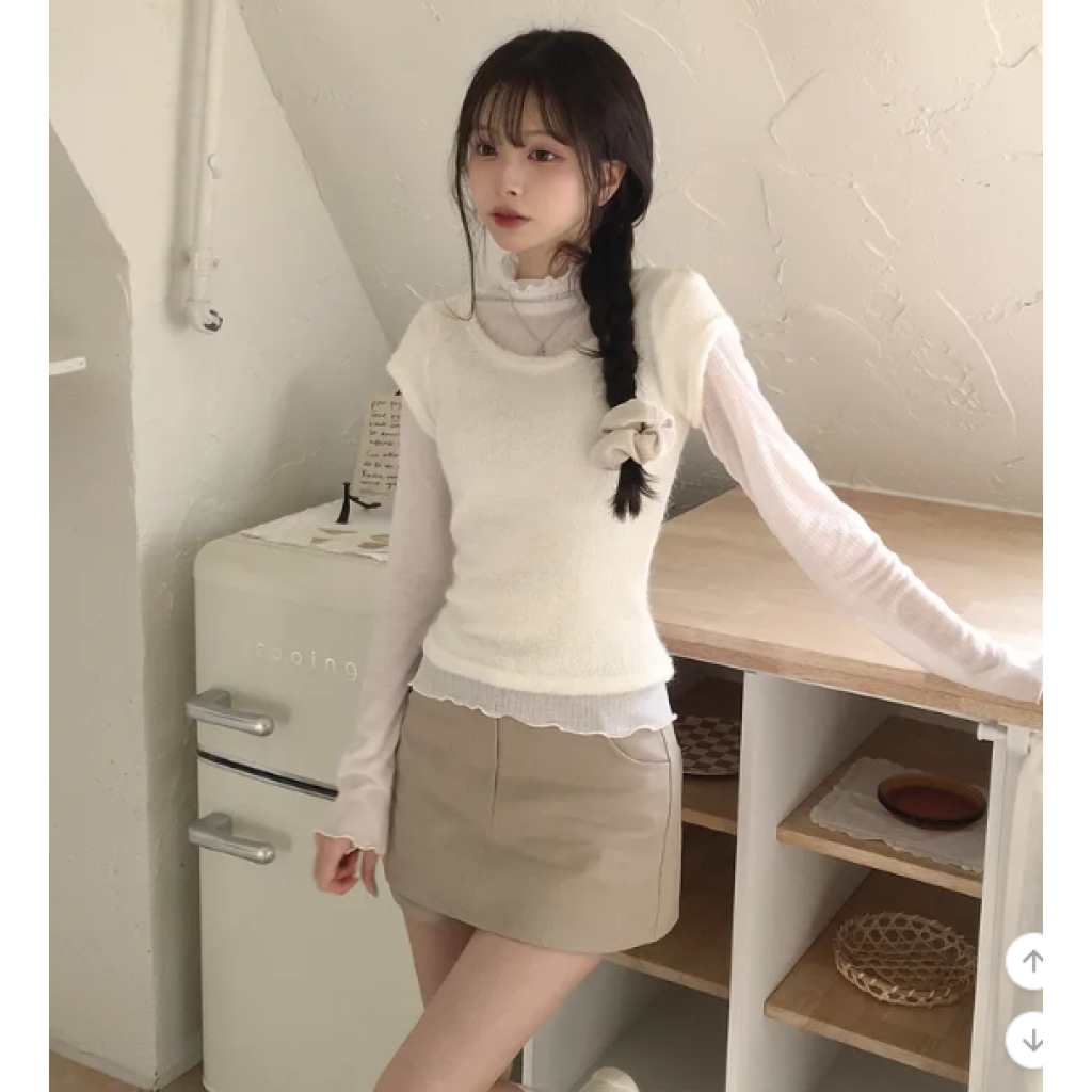 (•‾⌣‾•)一套包含2件❤️木耳邊半高領長袖加上毛絨短袖上衣💕一套著或者分開著都無問題