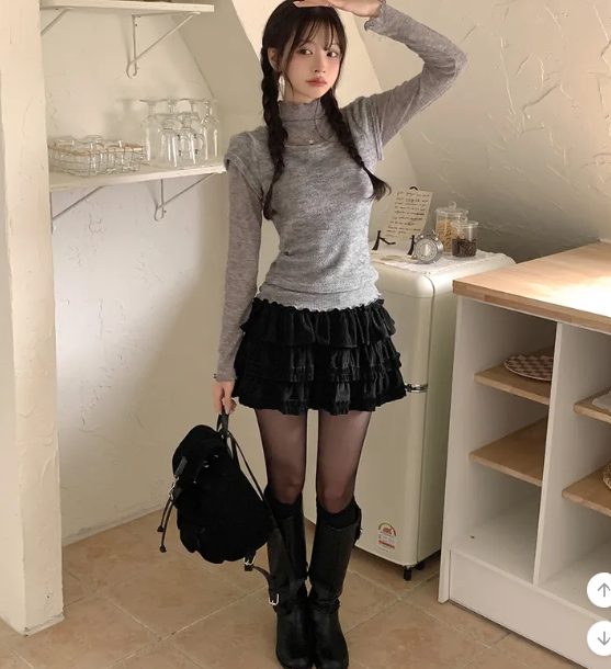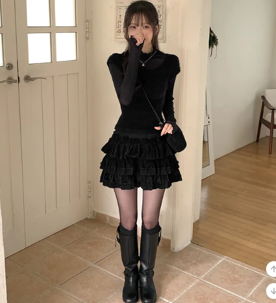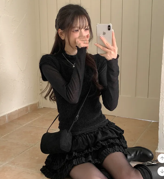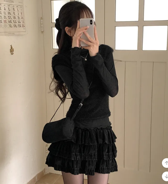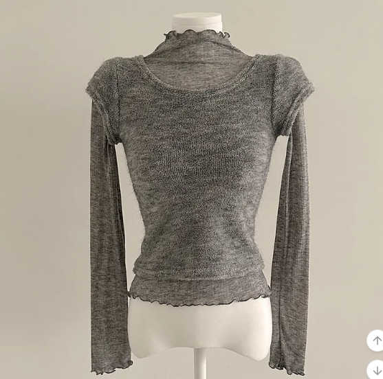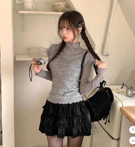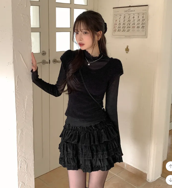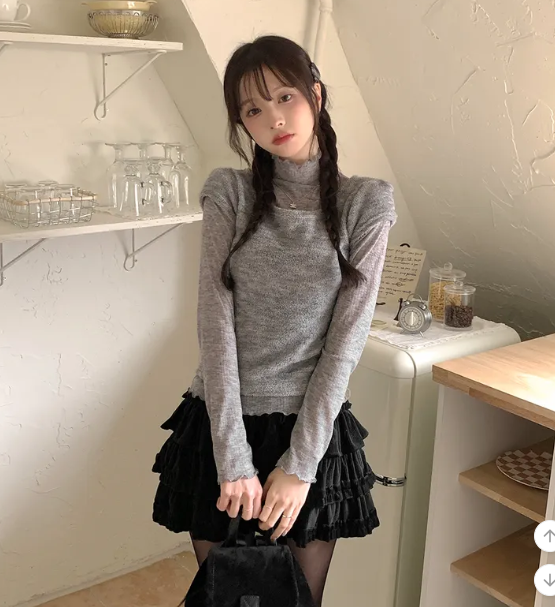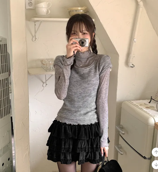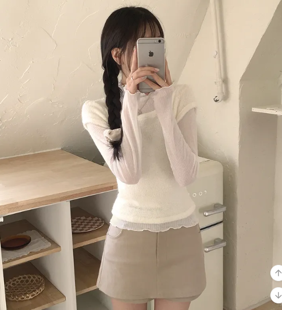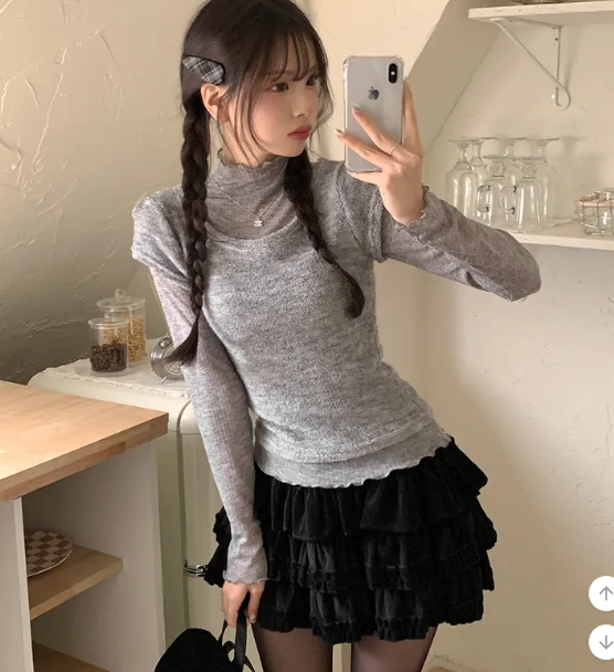 (•‾⌣‾•)一套包含2件❤️木耳邊半高領長袖加上毛絨短袖上衣💕一套著或者分開著都無問題