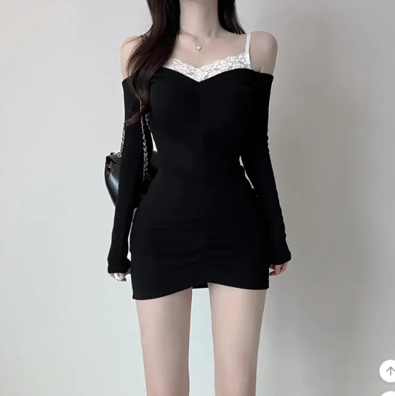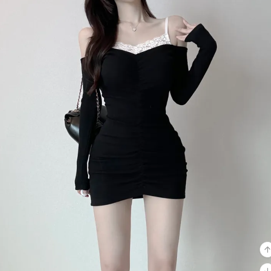 (•‾⌣‾•)蕾絲吊帶拼接連身裙💕褶皺設計可以修飾身形貼身款式又有點小性感❤️