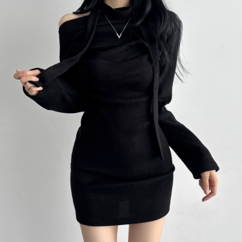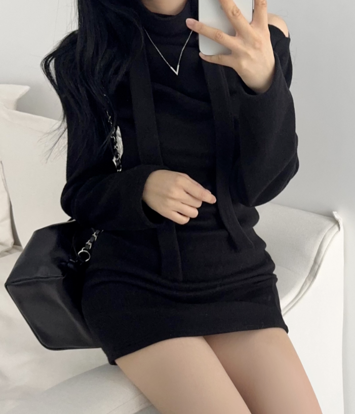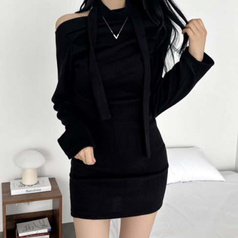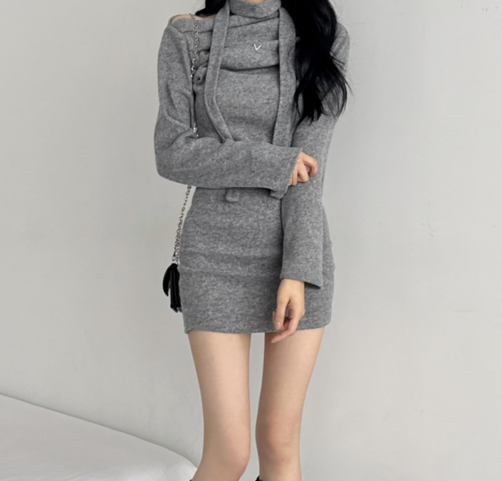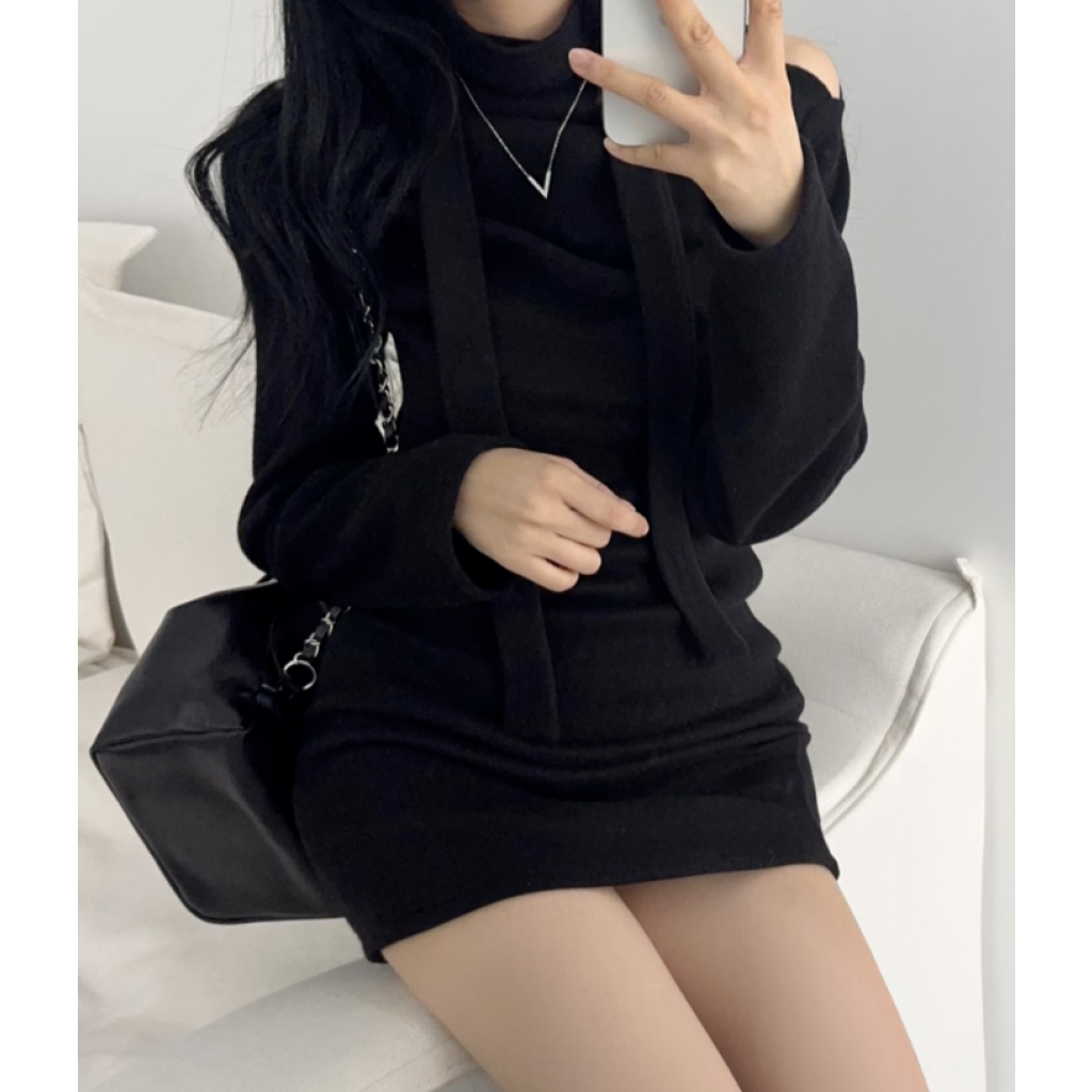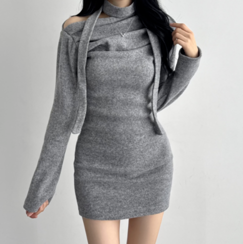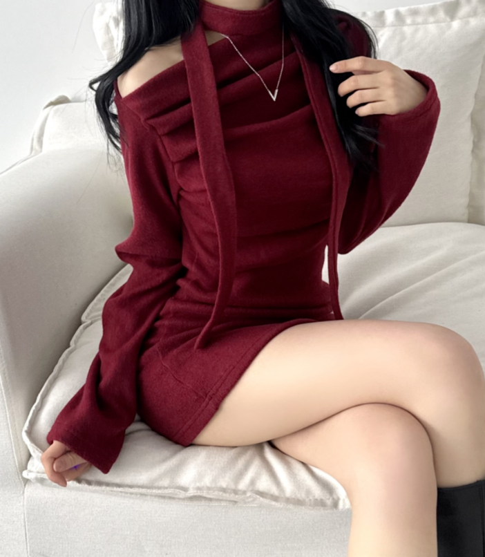 (•‾⌣‾•)褶皺多色連身裙💕露肩設計配上小圍巾簡約又好睇❤️