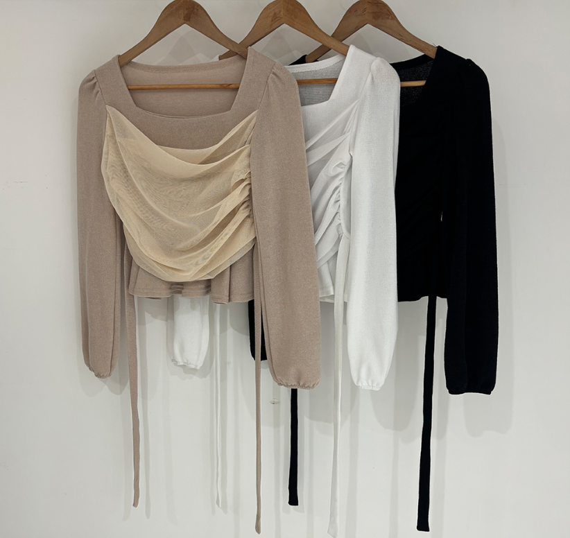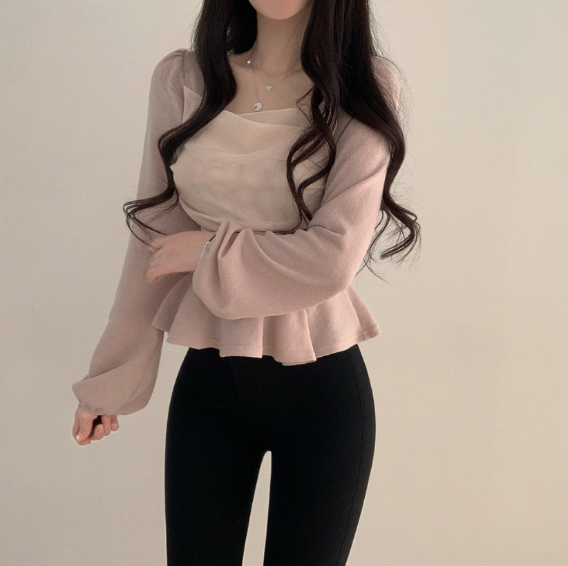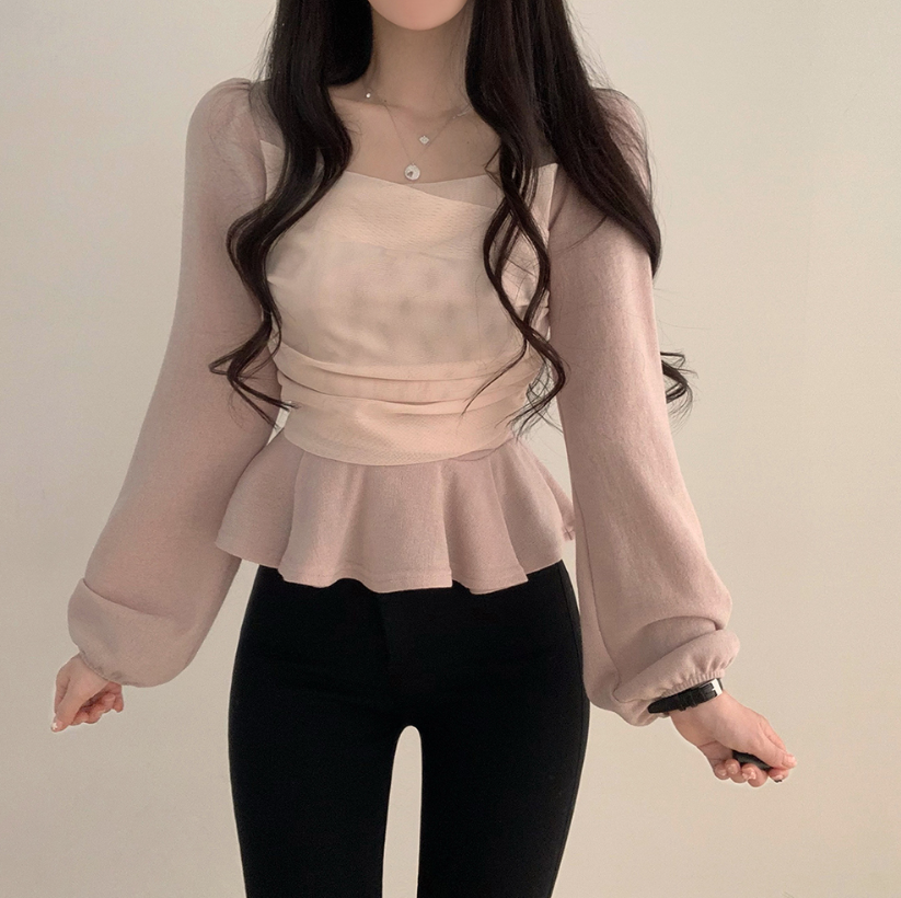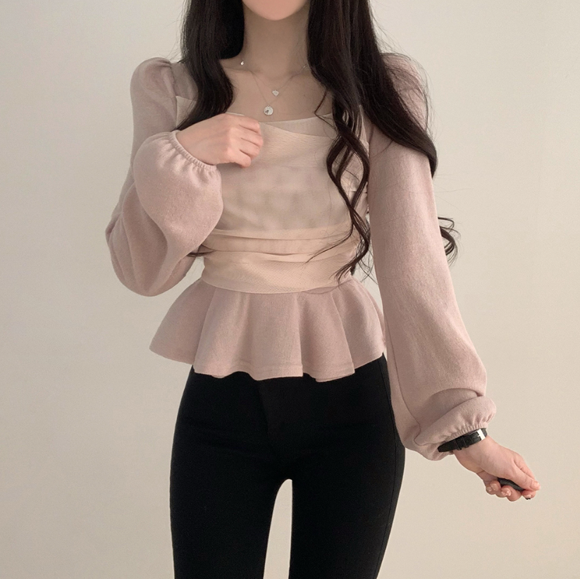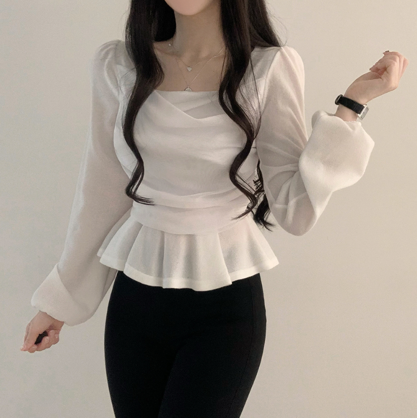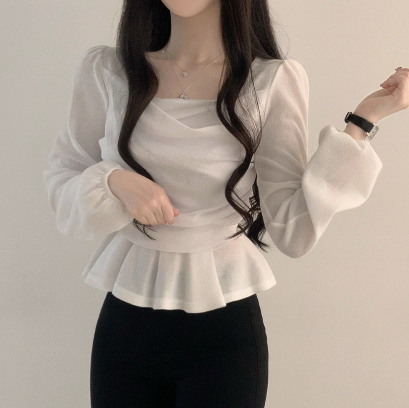 (•‾⌣‾•)泡泡袖拼接網紗上衣❤️可出街可上班穿著而且好容易襯衫💕
