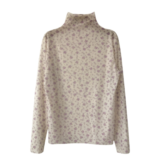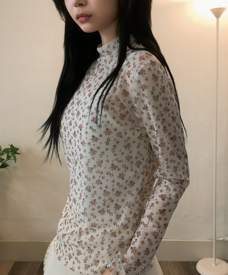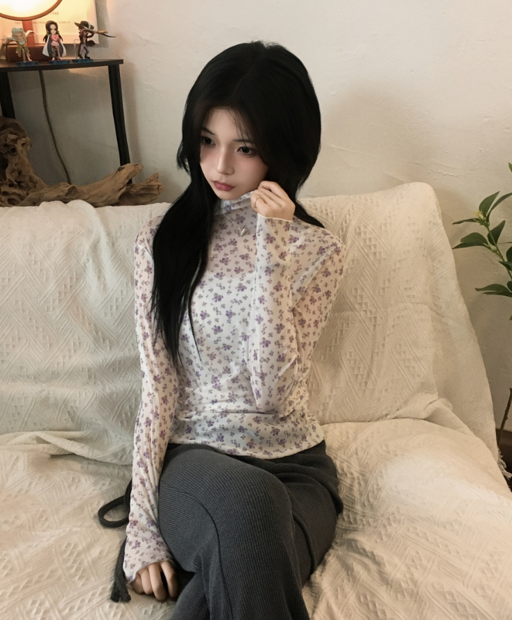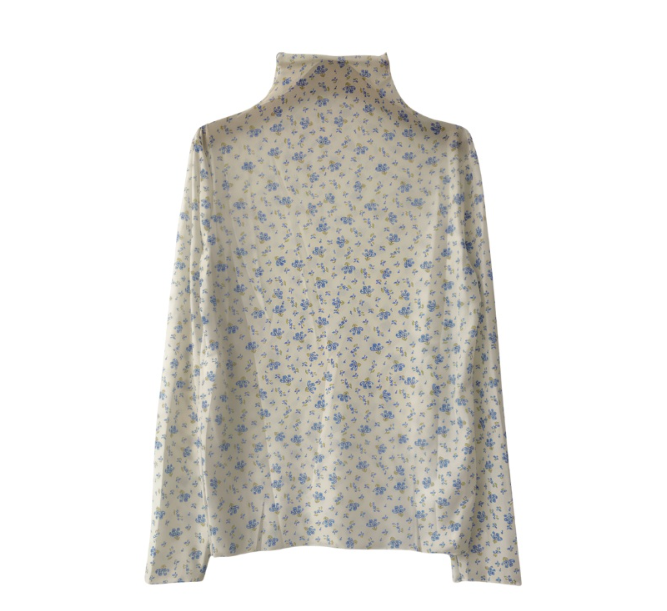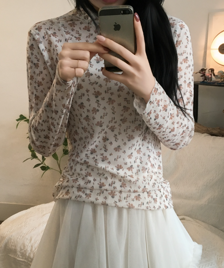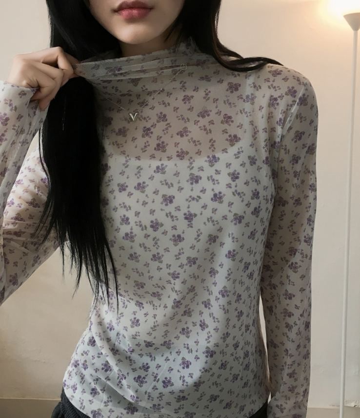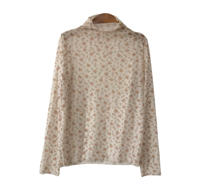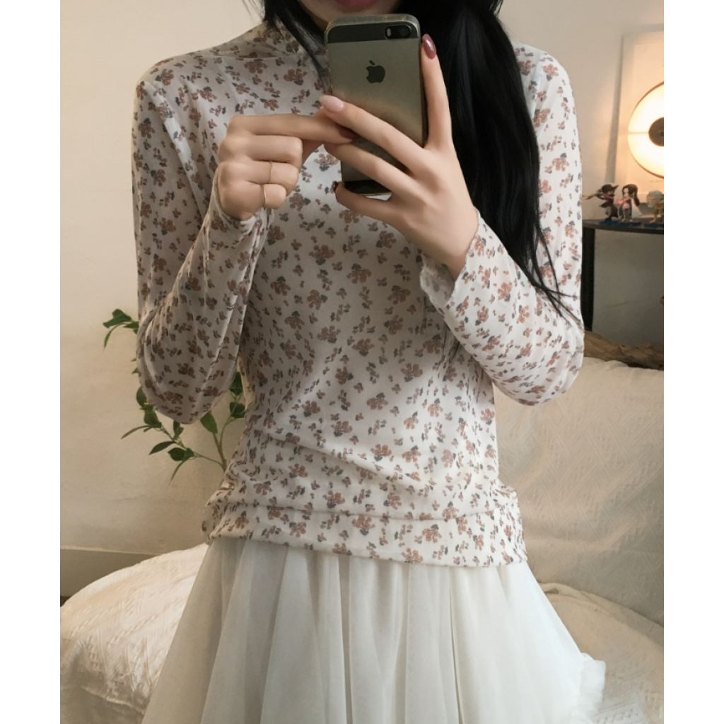 (•‾⌣‾•)碎花網紗打底T恤❤️半透肌理自帶仙氣💕高領設計顯臉小✨疊穿單穿都好正✨