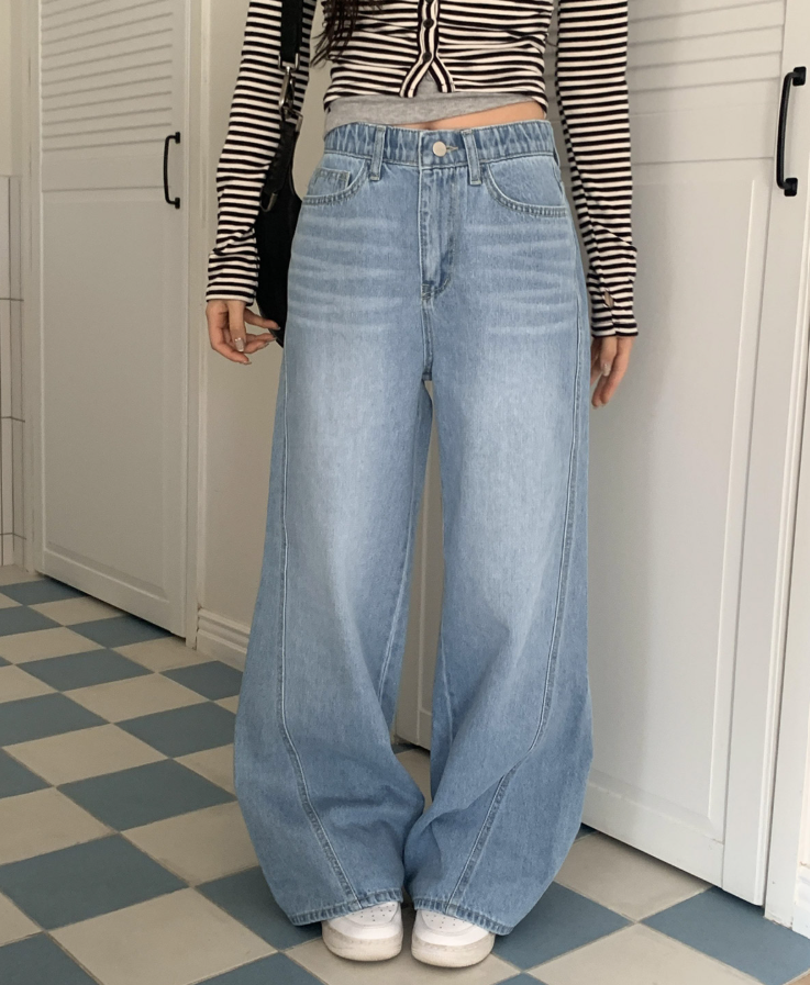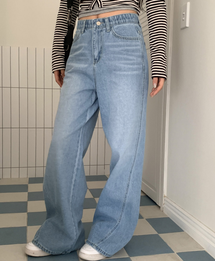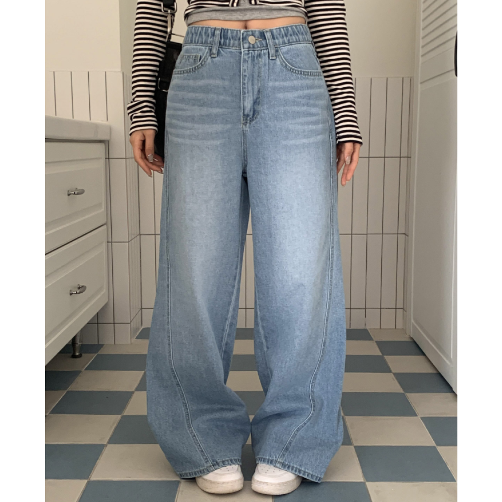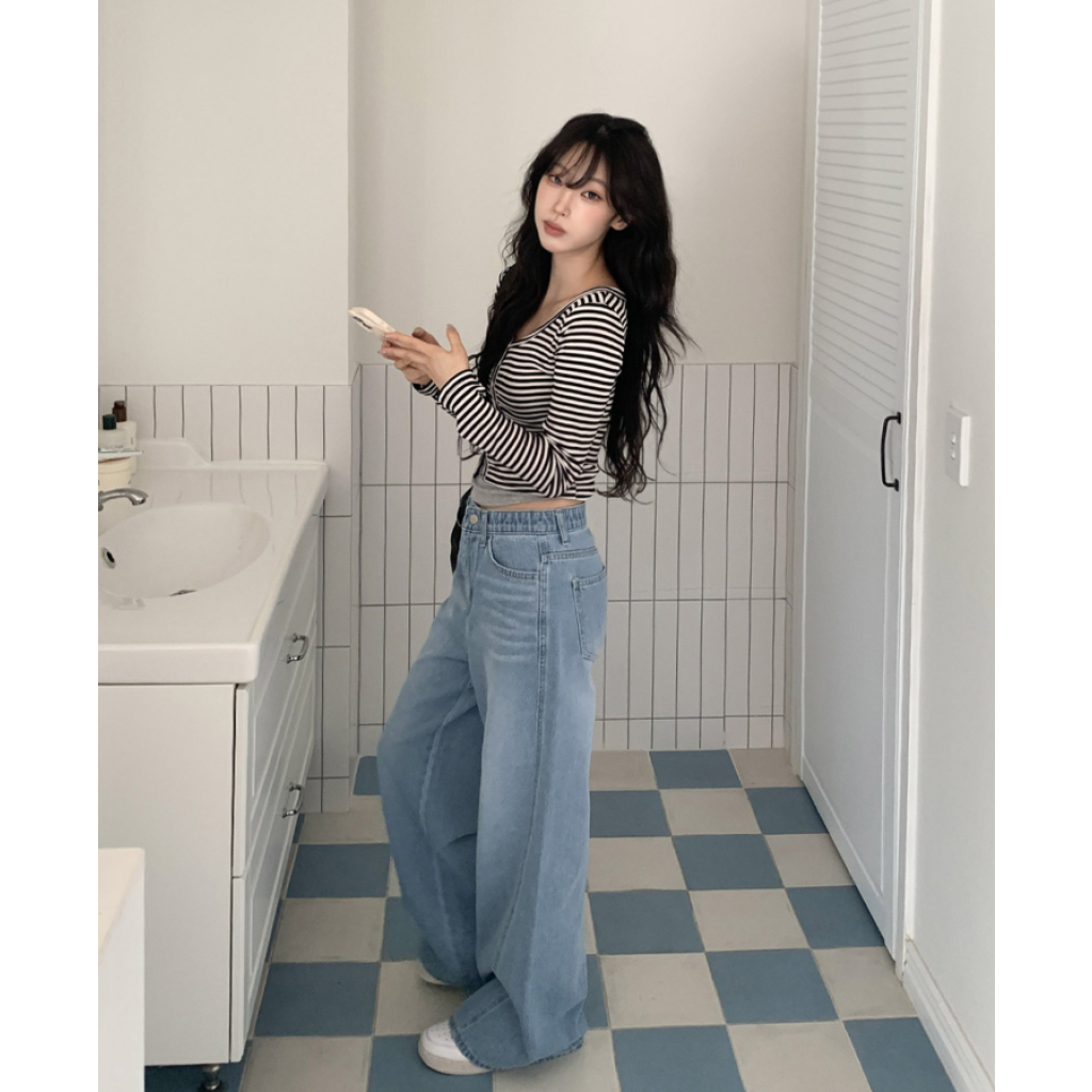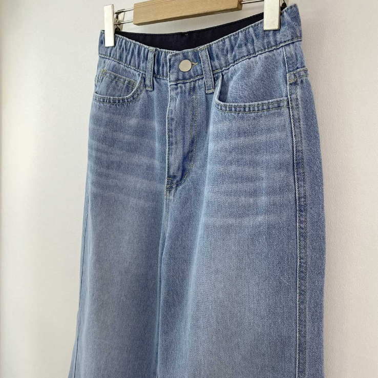 ヽ( ^ω^ ゞ )呢款淺藍闊腿牛仔褲有鬆弛感💕彈性腰頭舒適不勒側縫設計拉長比例❤️日常出街必備