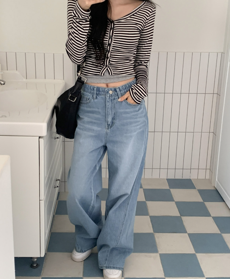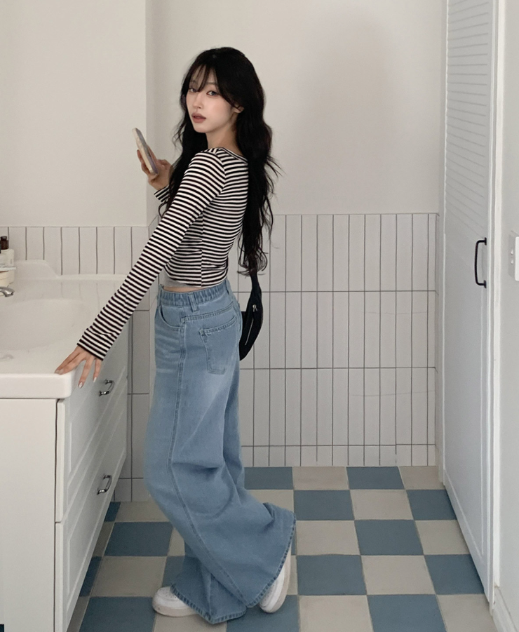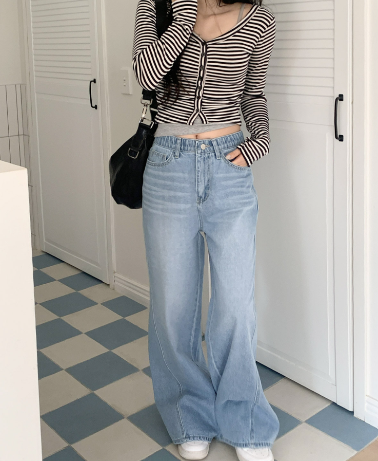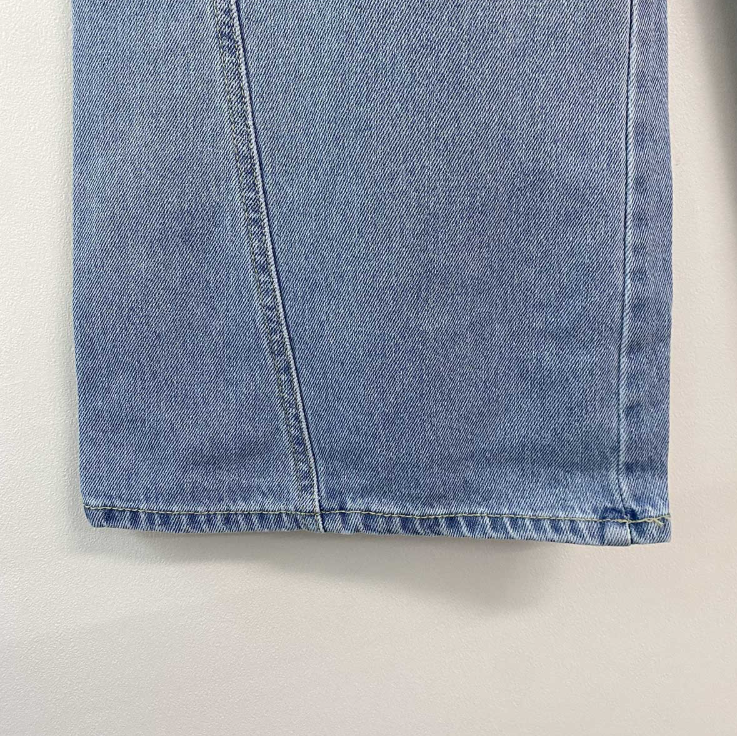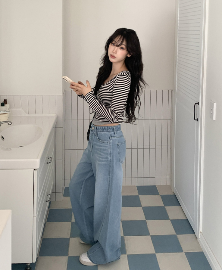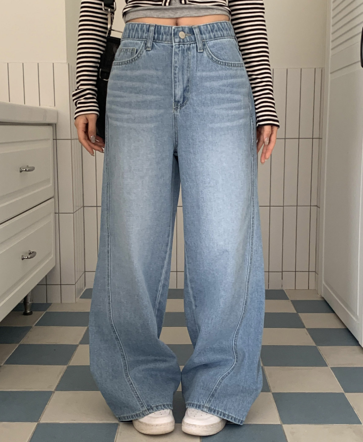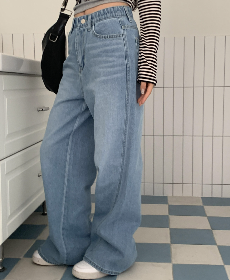 ヽ( ^ω^ ゞ )呢款淺藍闊腿牛仔褲有鬆弛感💕彈性腰頭舒適不勒側縫設計拉長比例❤️日常出街必備