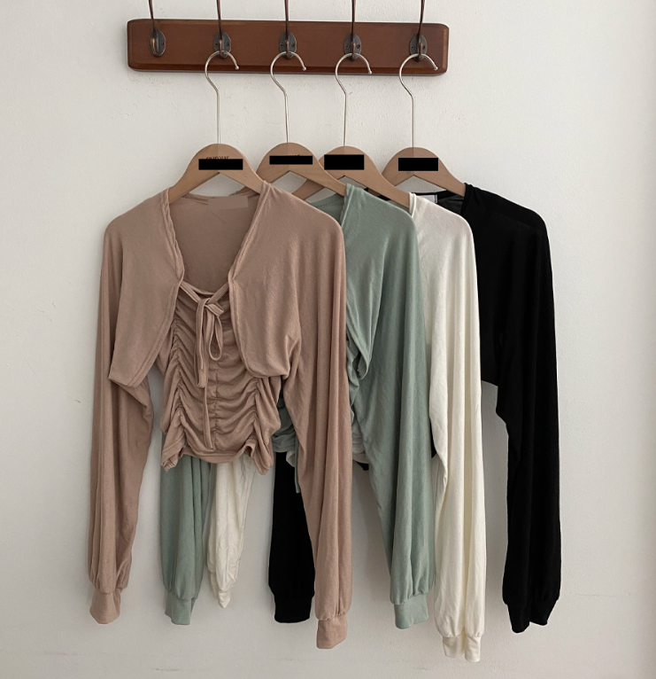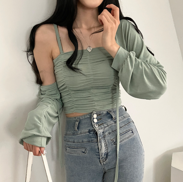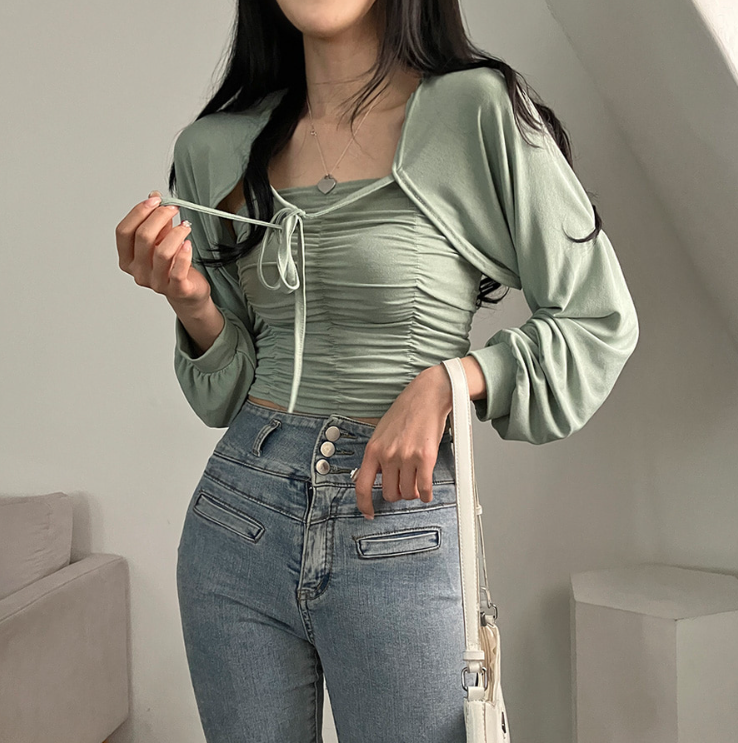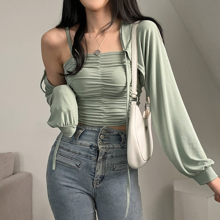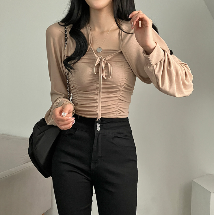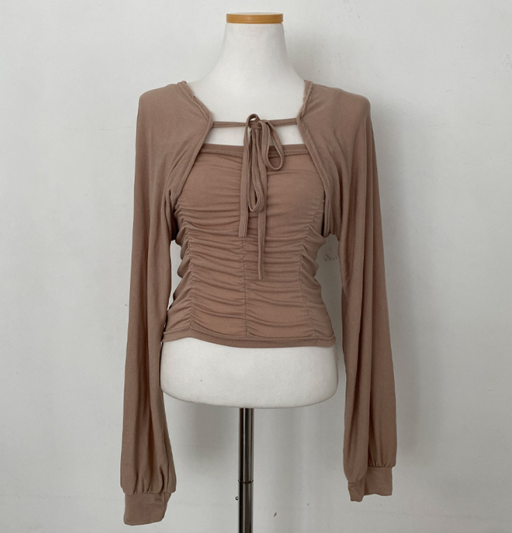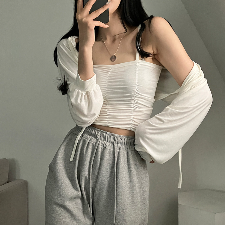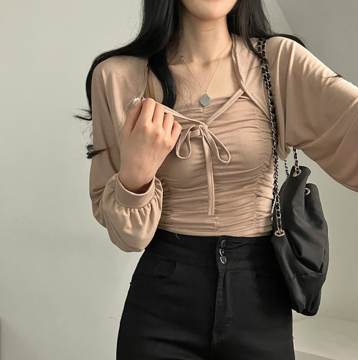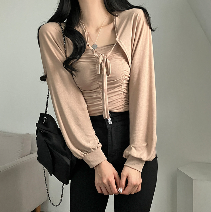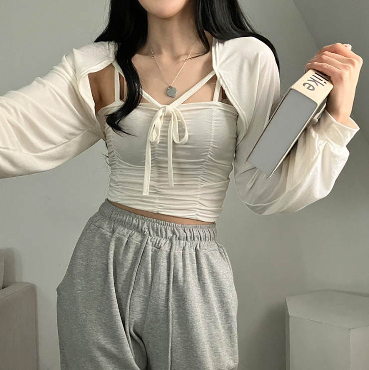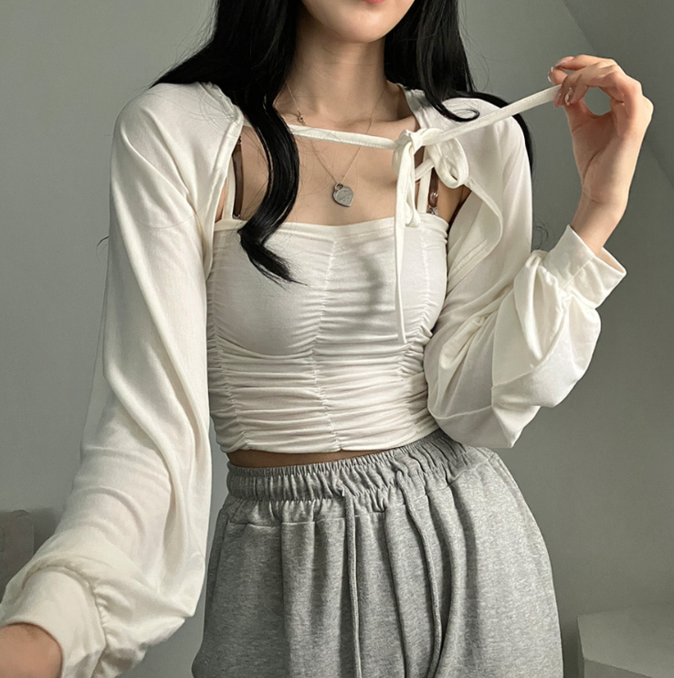 (•‾⌣‾•)柔軟透氣吊帶背心加外套💕褶皺設計顯瘦❤️綁帶點綴精緻感日常約會都適合✨