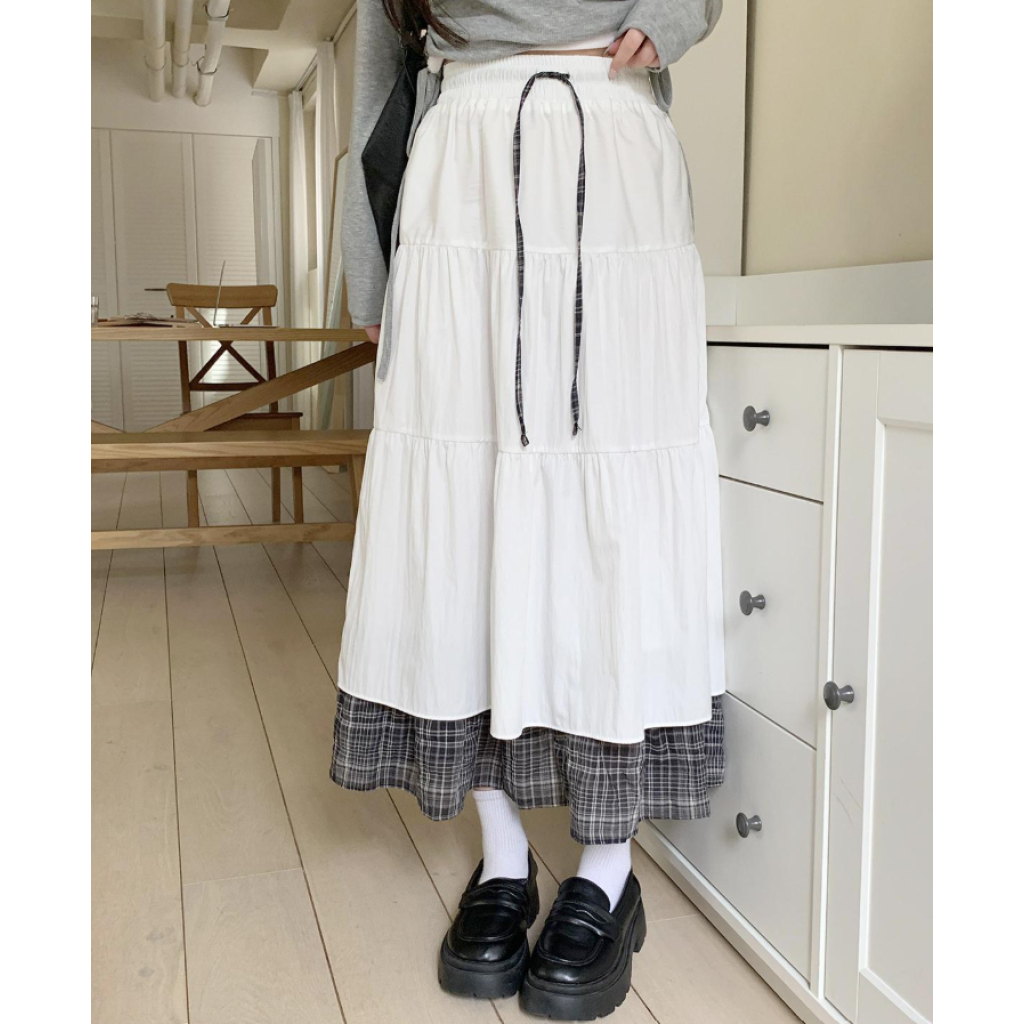 (•‾⌣‾•)假兩件拼接格紋半身長裙💕飄逸蛋糕裙擺視覺顯瘦❤️