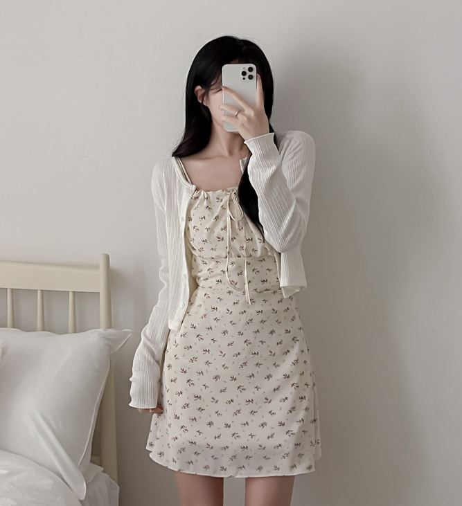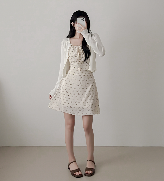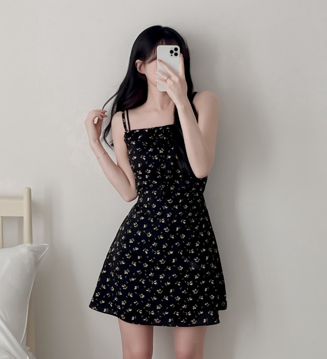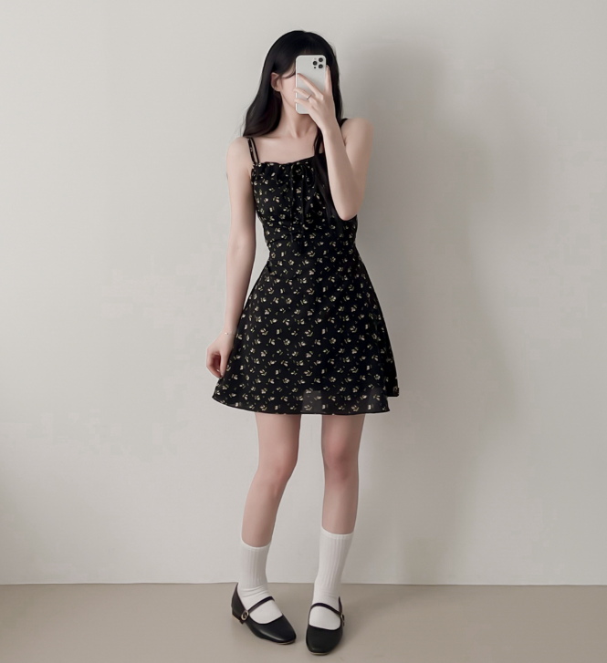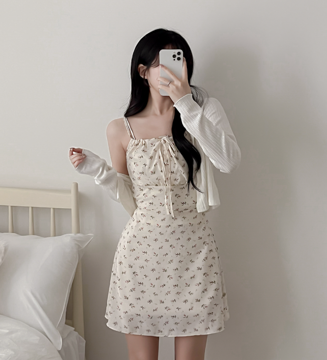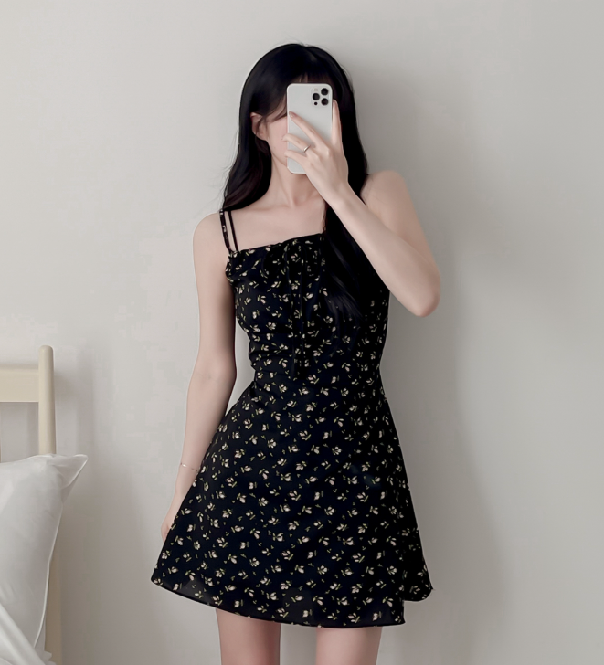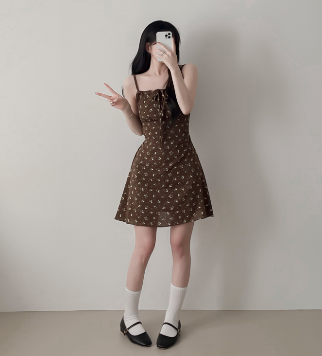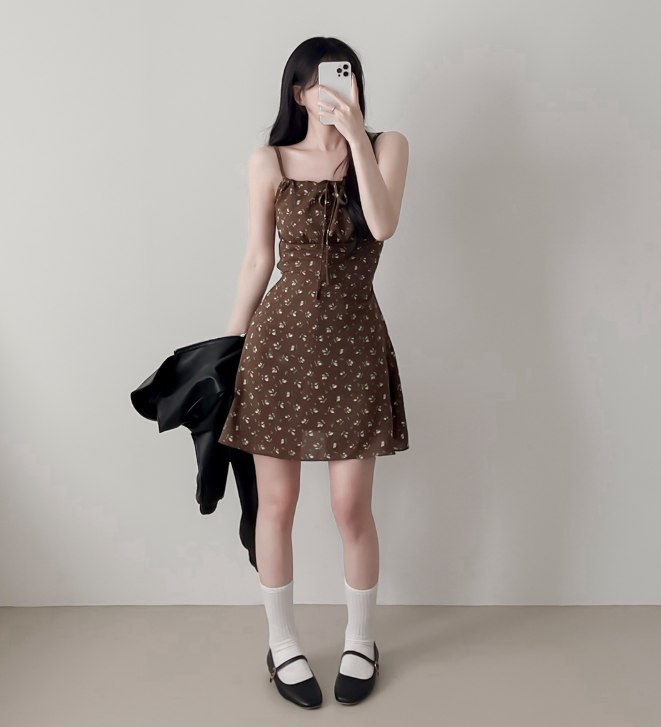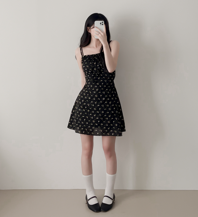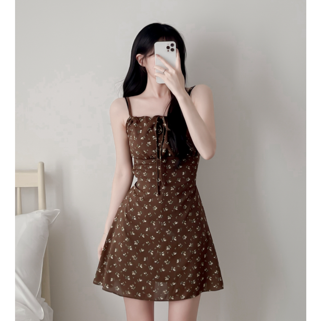 (•‾⌣‾•)復古碎花細肩帶連身裙❤️胸前綁帶設計甜美又性感💕
