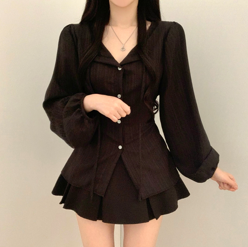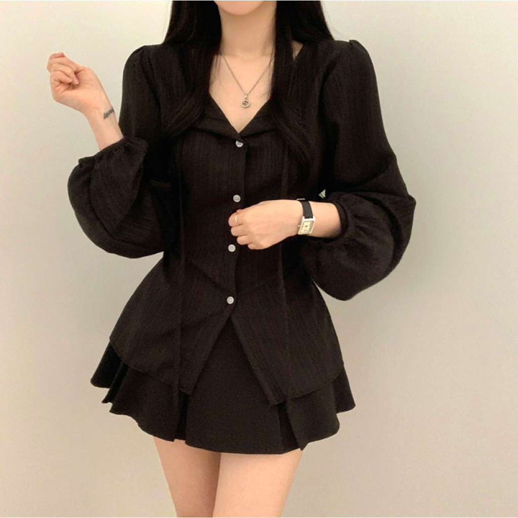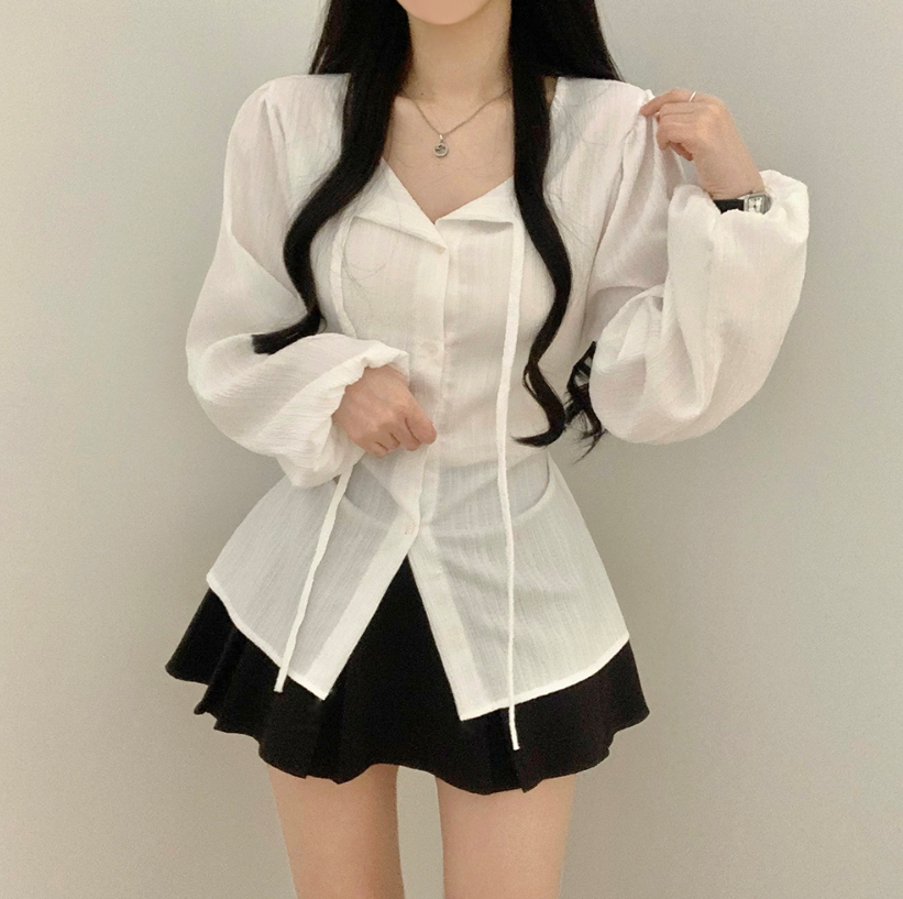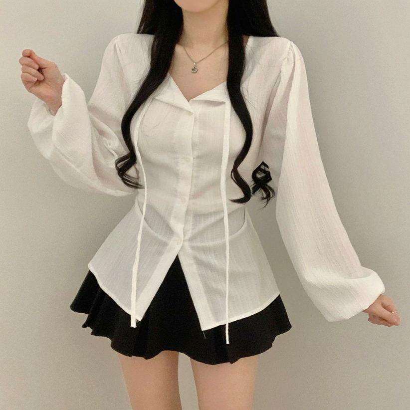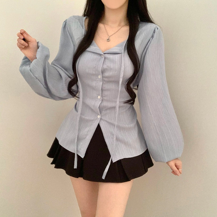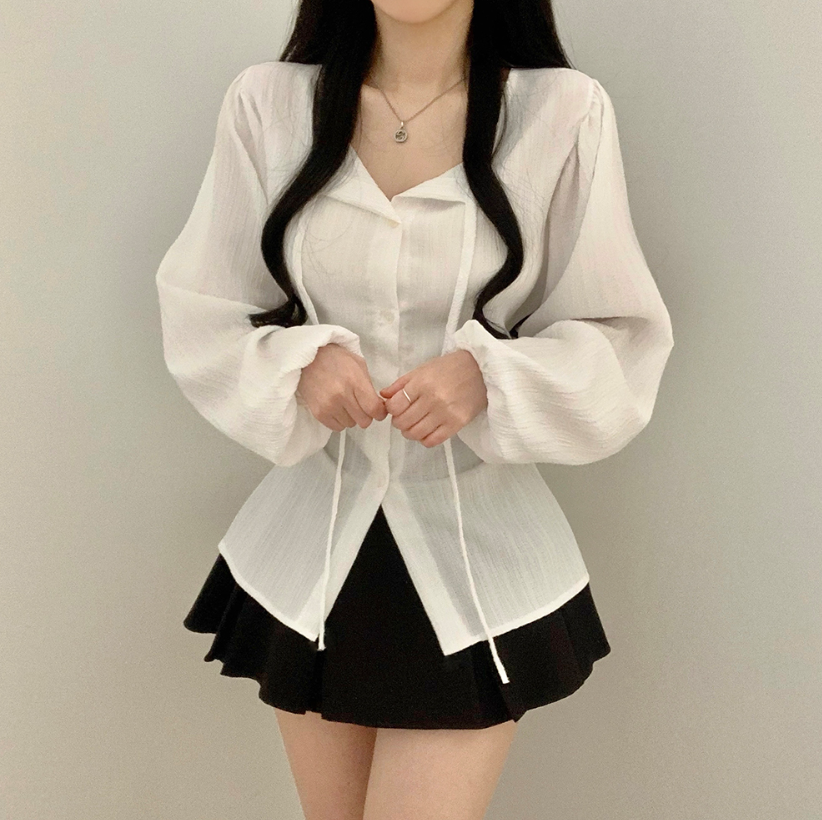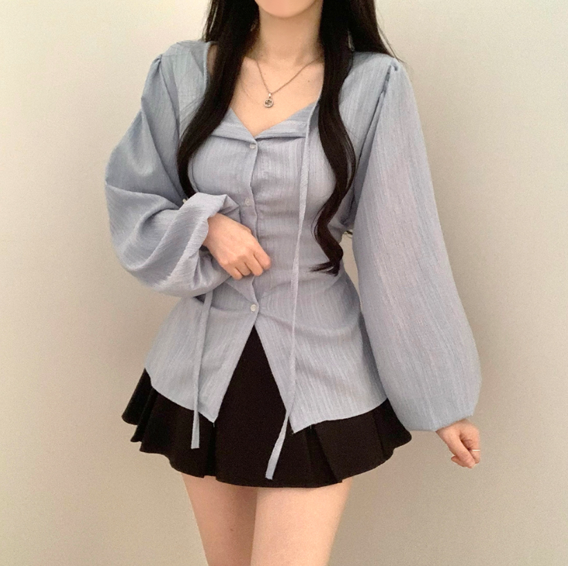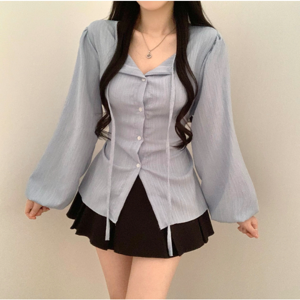 (•‾⌣‾•)溫柔感襯衫燈籠袖設計超浪漫💕獨特V領與收腰剪裁❤️完美勾勒纖細腰線