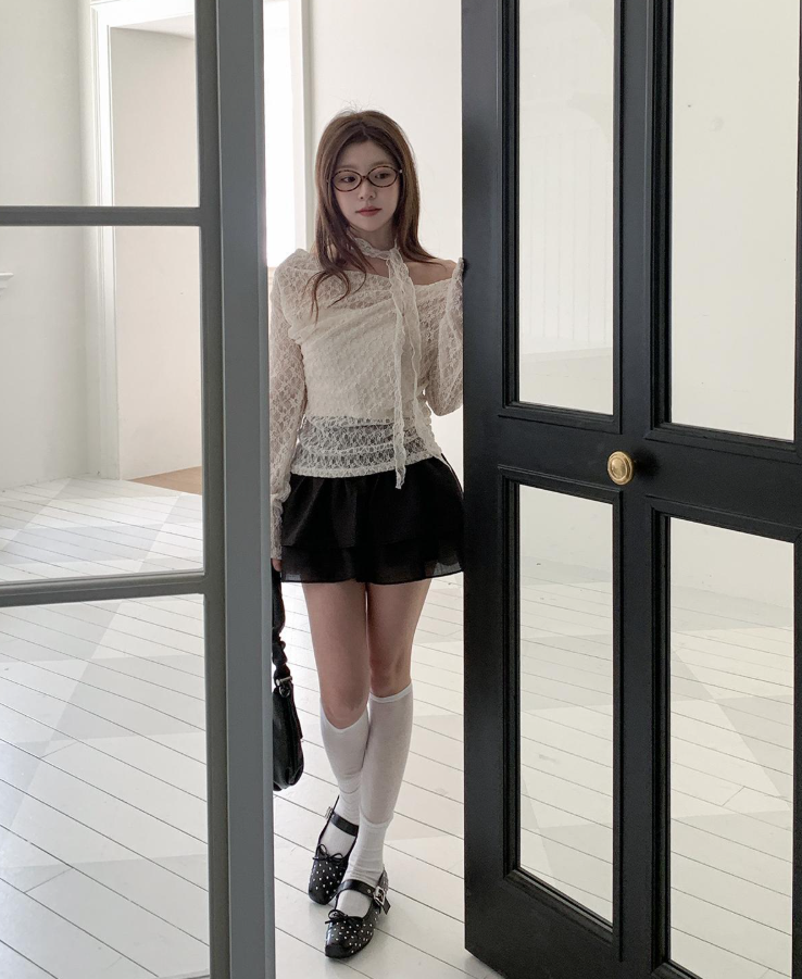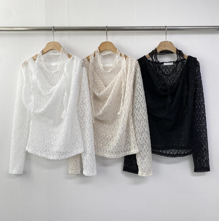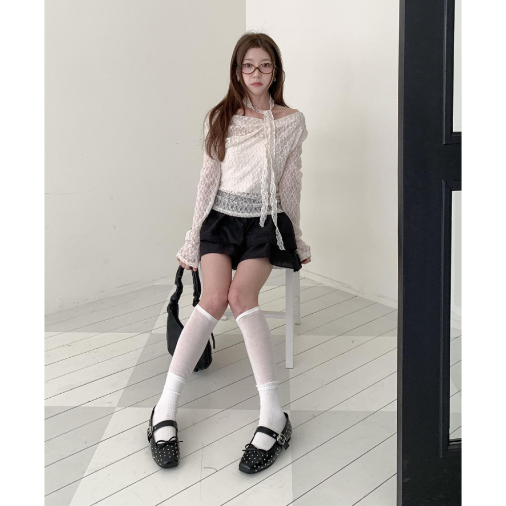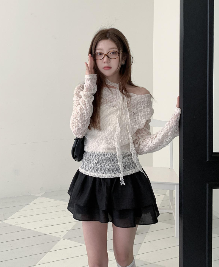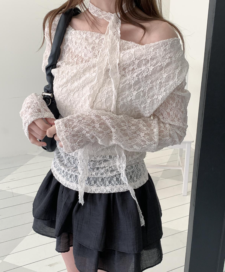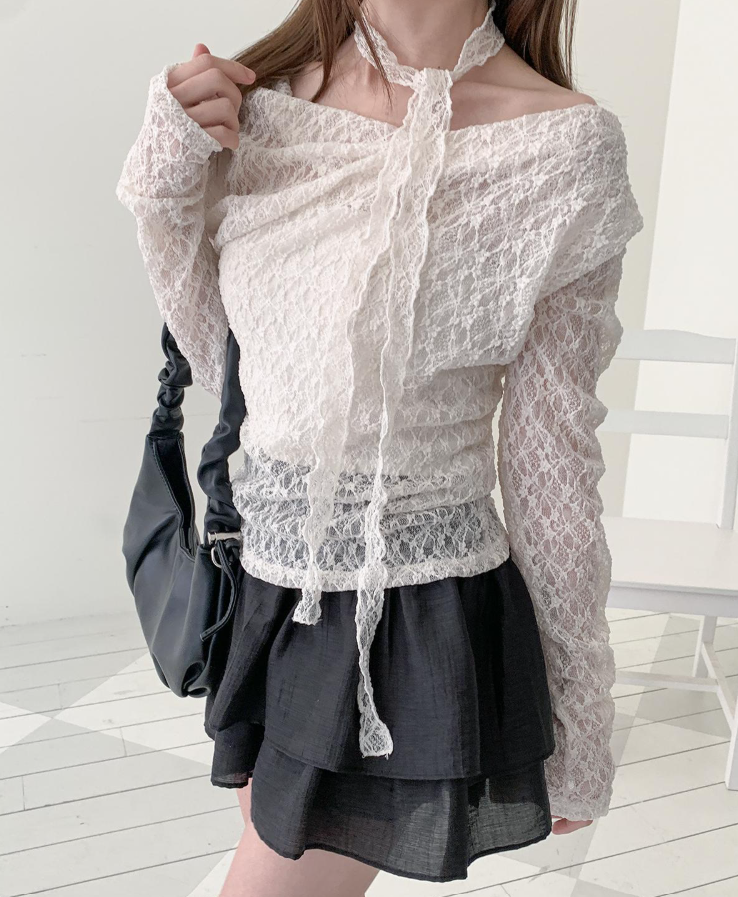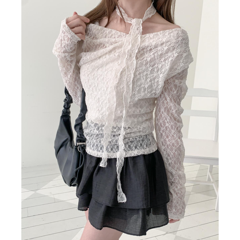 (•‾⌣‾•)褶皺一字領設計完美展現肩頸線條💕加上別緻既頸部綁帶❤️純慾氛圍感拉滿
