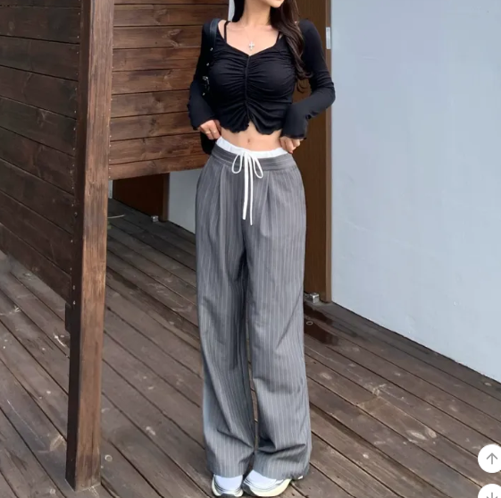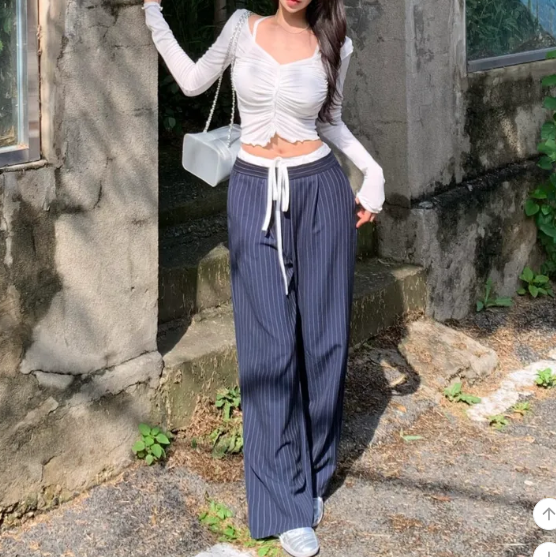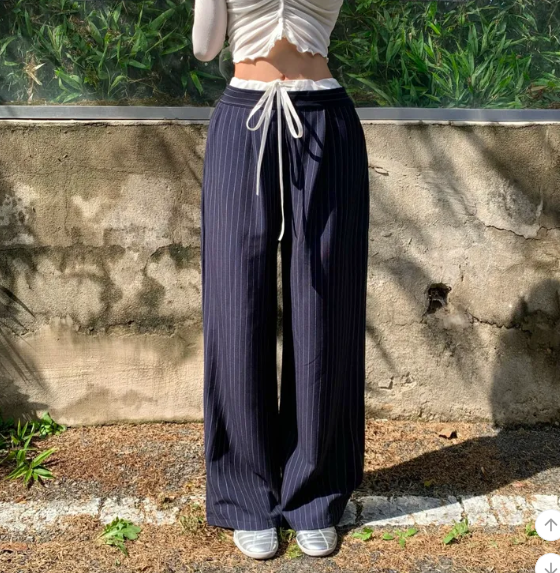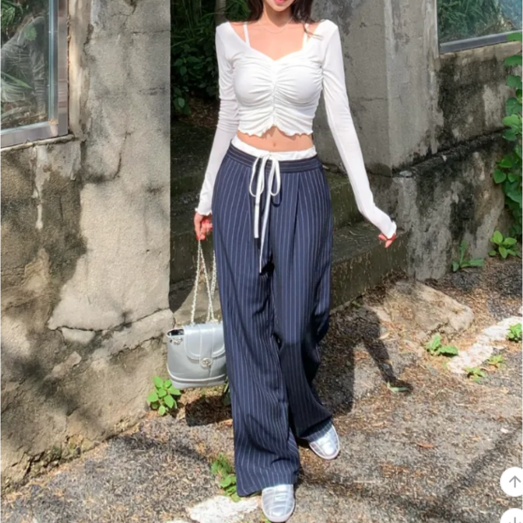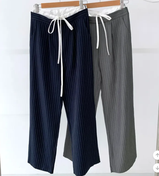 ヽ( ^ω^ ゞ )經典直條紋完美拉長腿部線條💕高腰寬褲版型遮一遮肉肉❤️