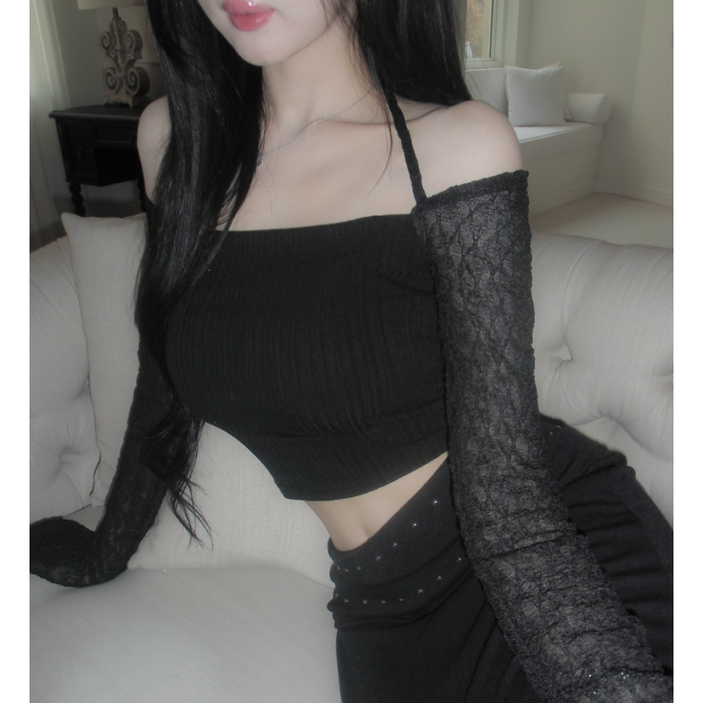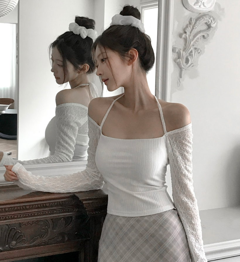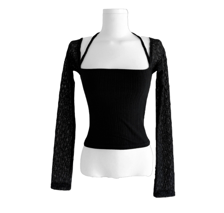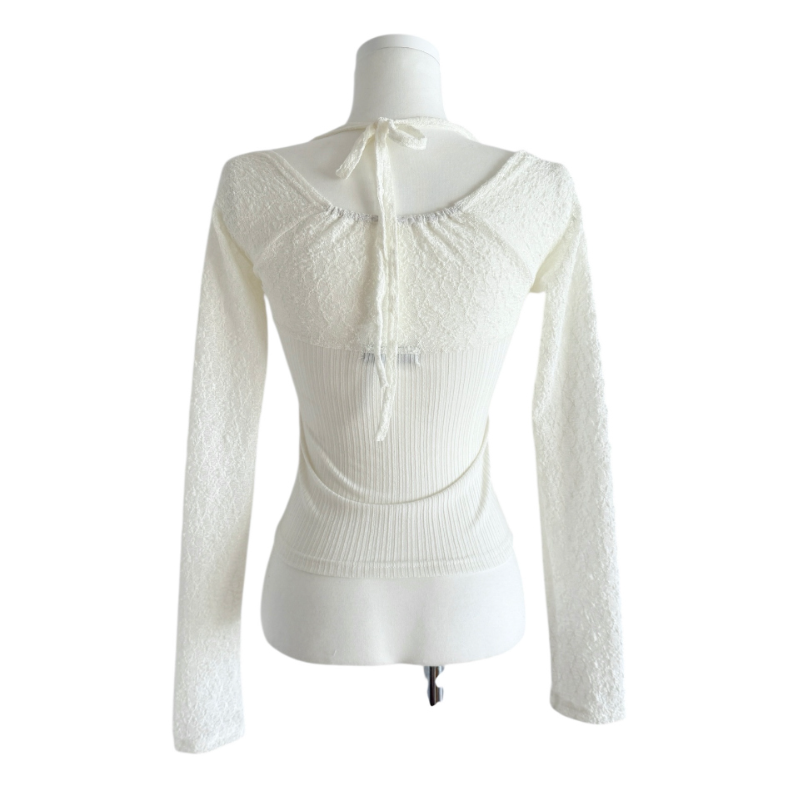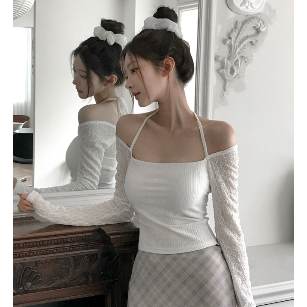 (•‾⌣‾•)氣質掛頸露肩設計❤️拼接蕾絲透膚長袖💕若隱若現有點小性感