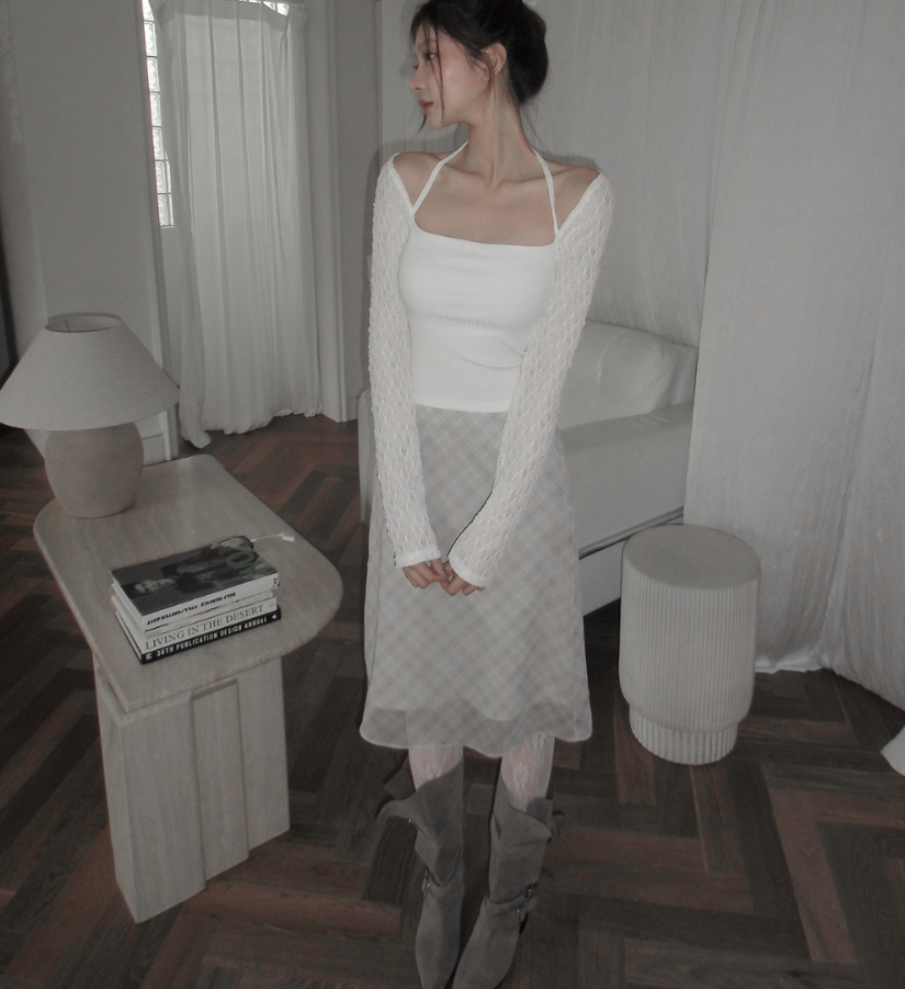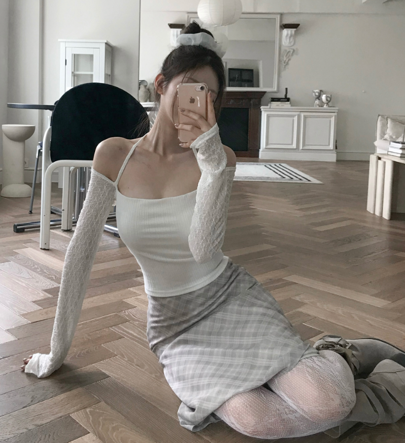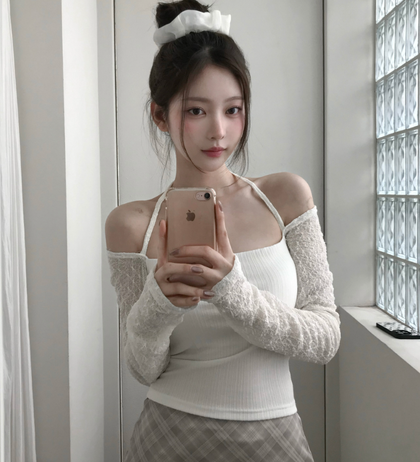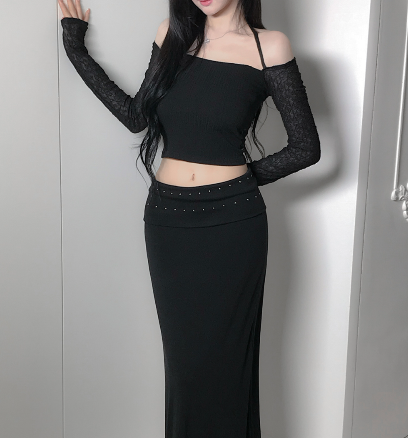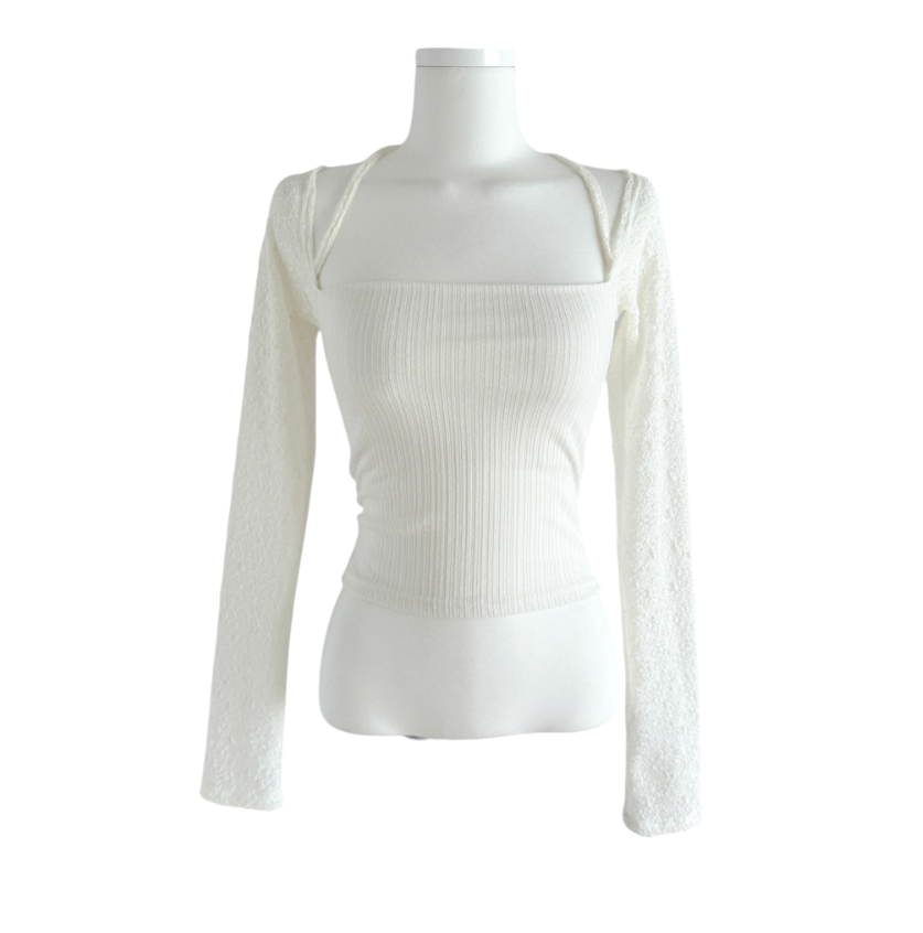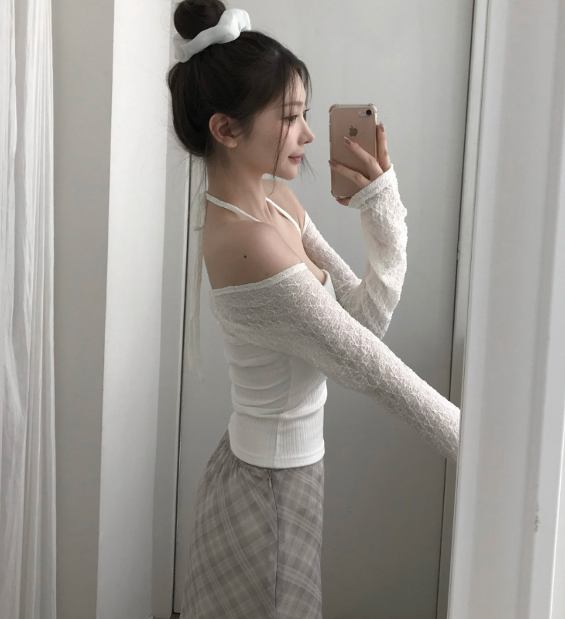 (•‾⌣‾•)氣質掛頸露肩設計❤️拼接蕾絲透膚長袖💕若隱若現有點小性感