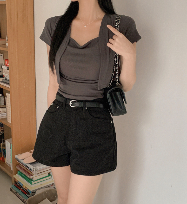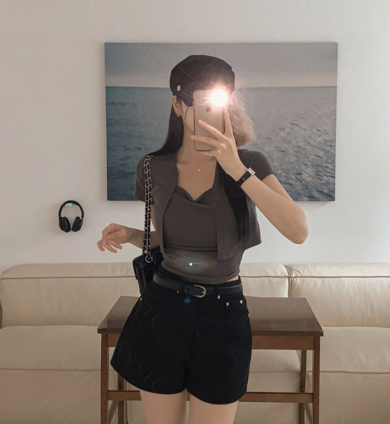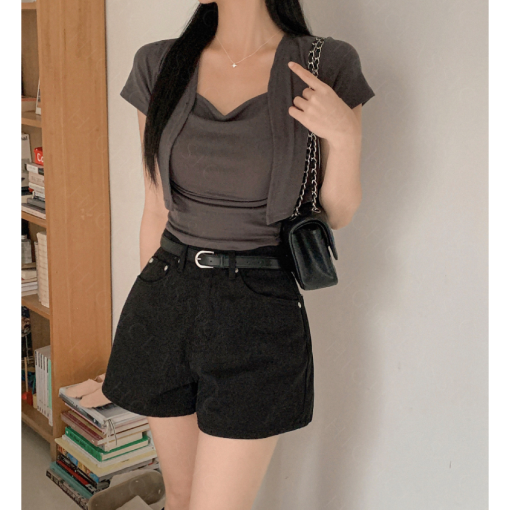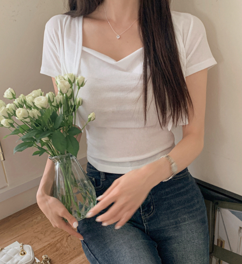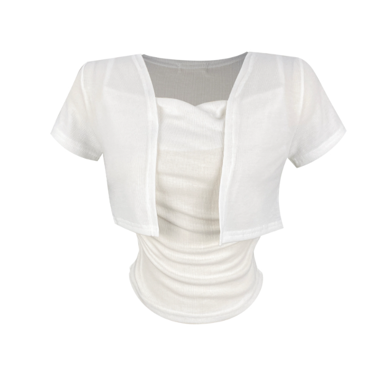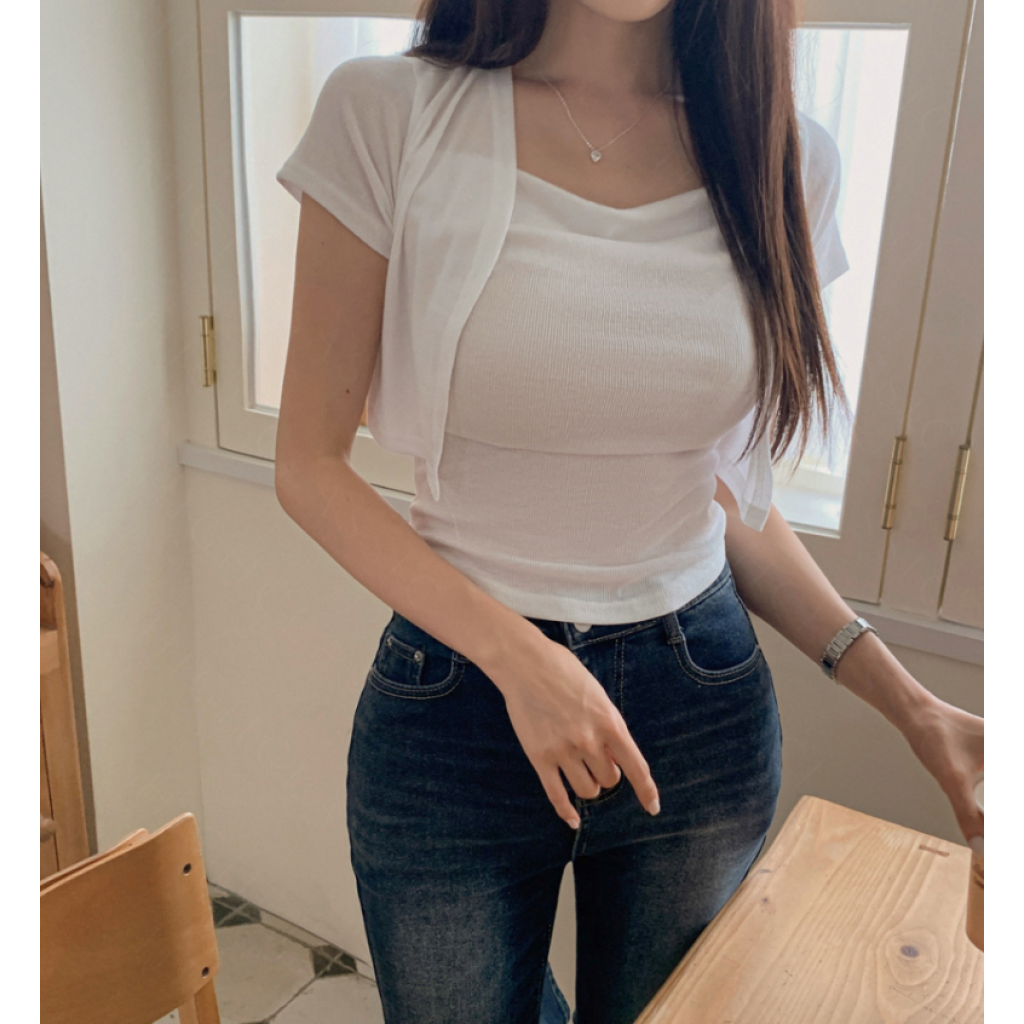 (•‾⌣‾•)溫柔知性風格❤️氣質垂墜領兩件式上衣💕短版外套疊穿出層次