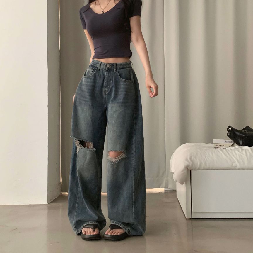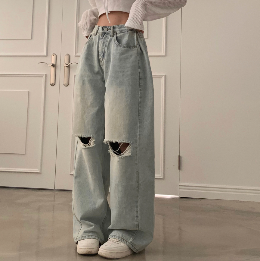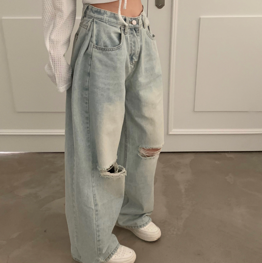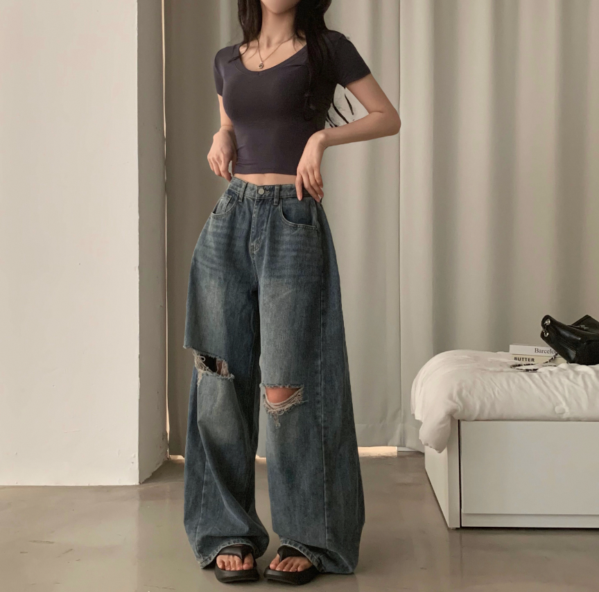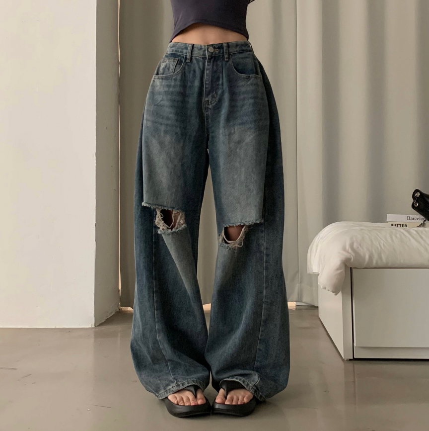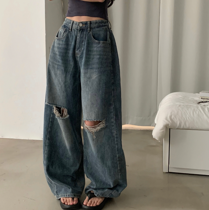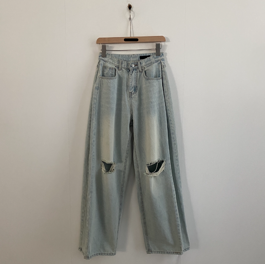 闊腿破洞牛仔褲