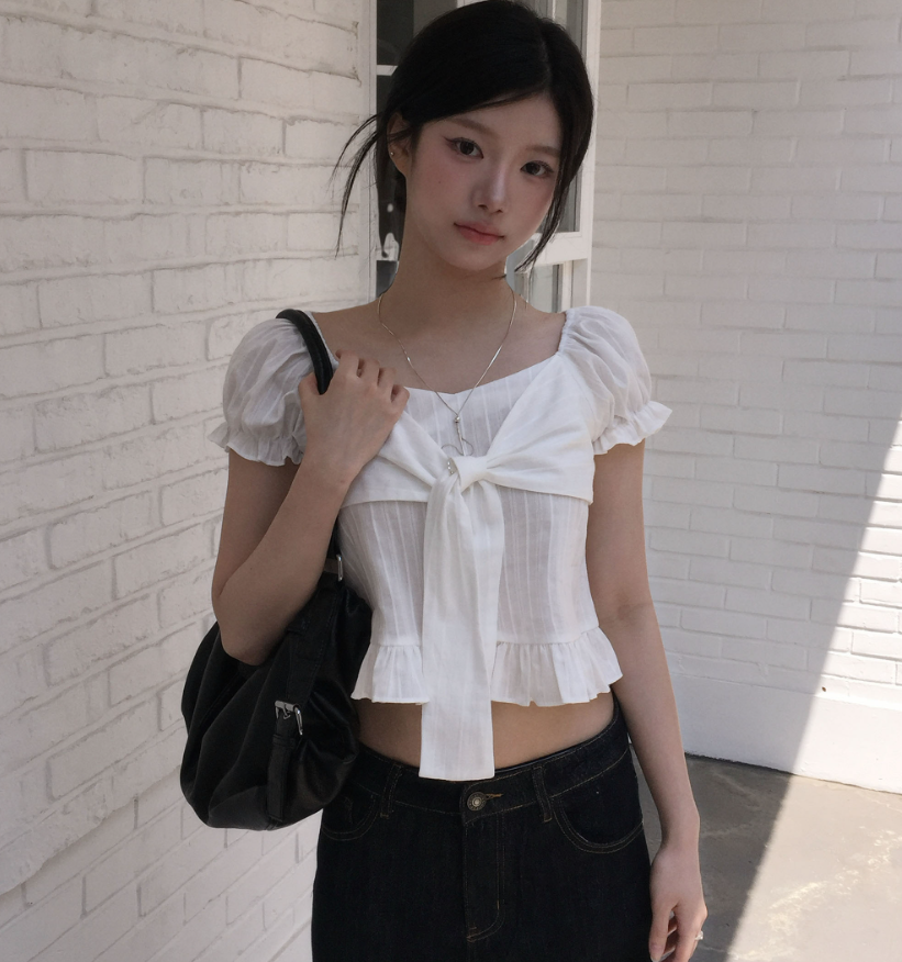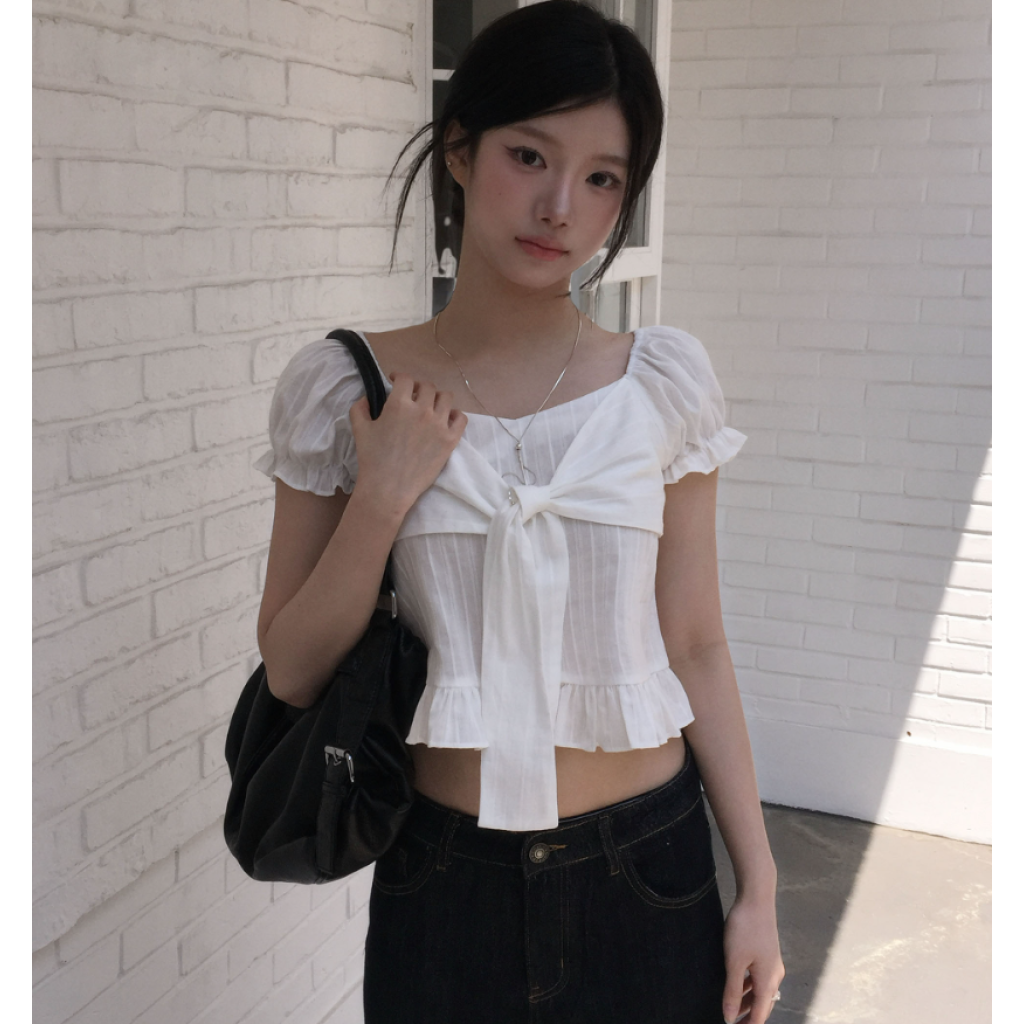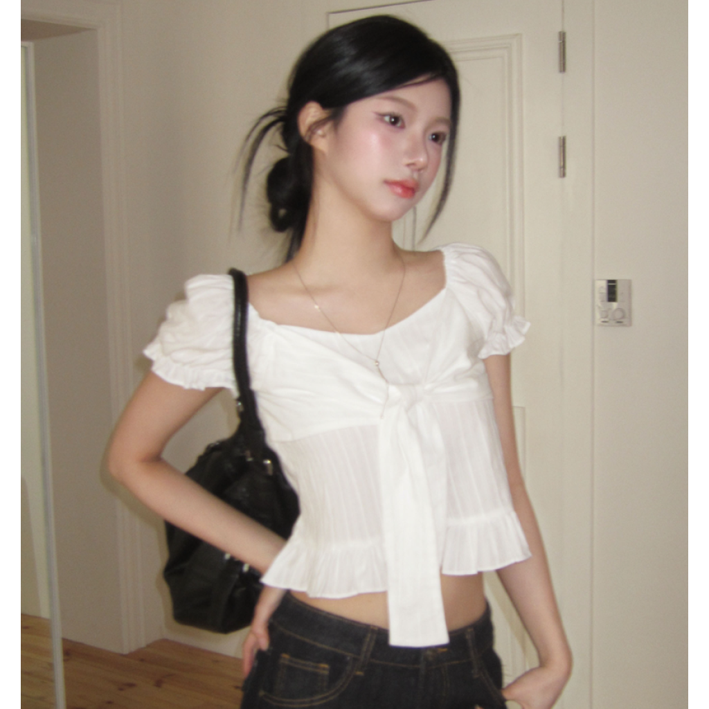 (•‾⌣‾•)方領結合甜美蝴蝶結綁帶💕短版剪裁完美修飾比例❤️