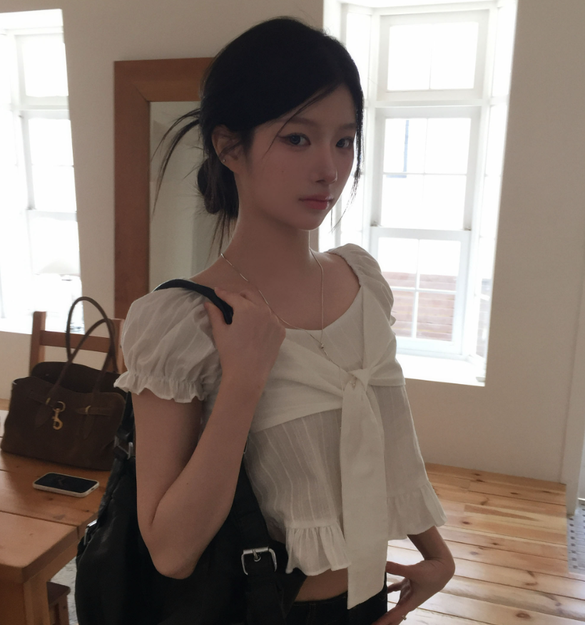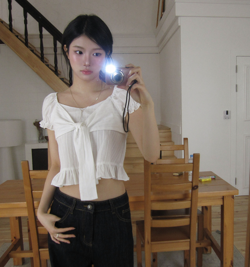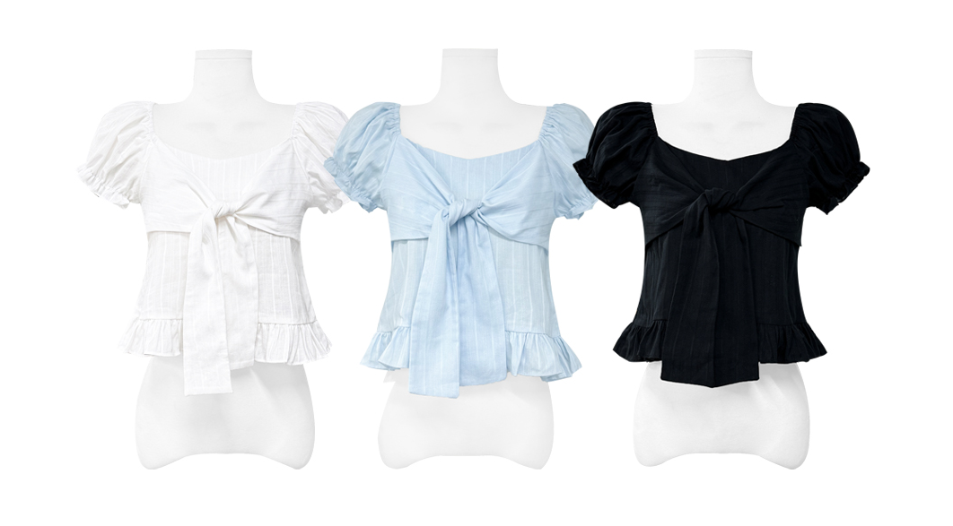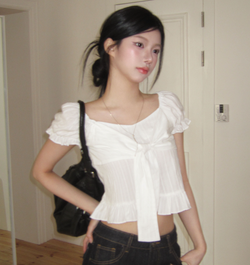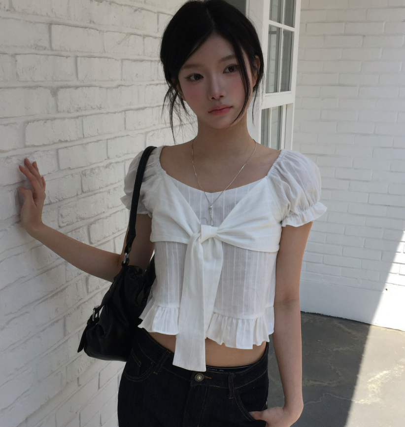 (•‾⌣‾•)方領結合甜美蝴蝶結綁帶💕短版剪裁完美修飾比例❤️