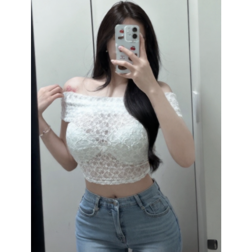 (•‾⌣‾•)一字領蕾絲上衣面料若隱若現❤️貼身短版剪裁性感迷人💕
