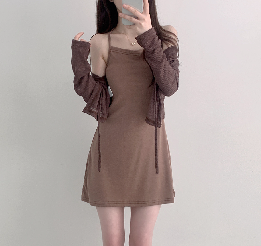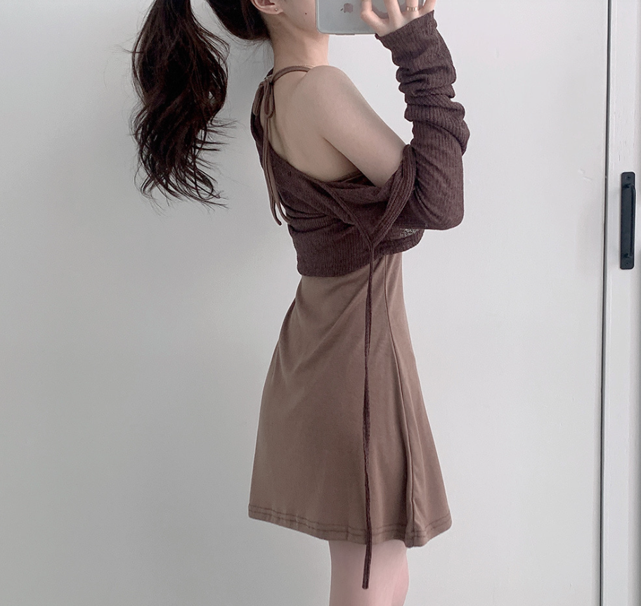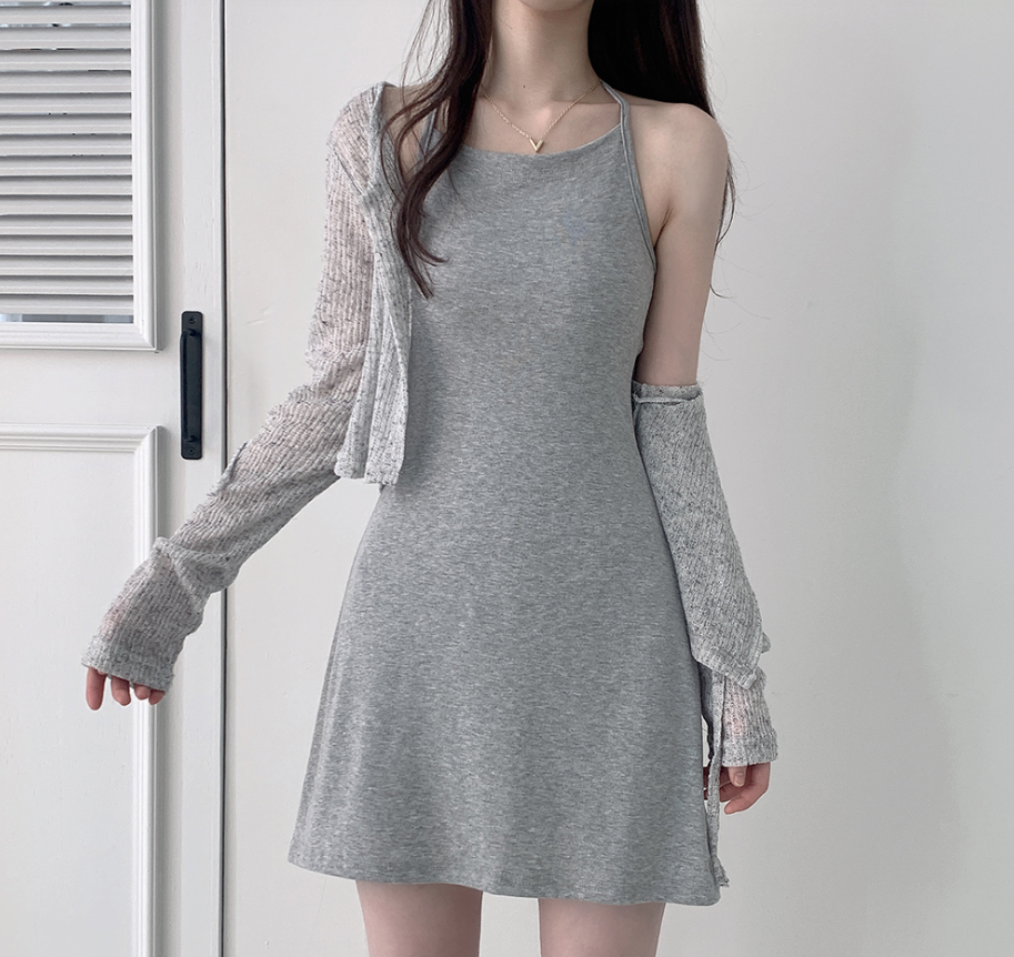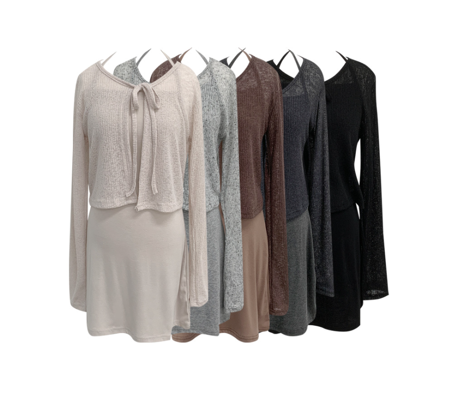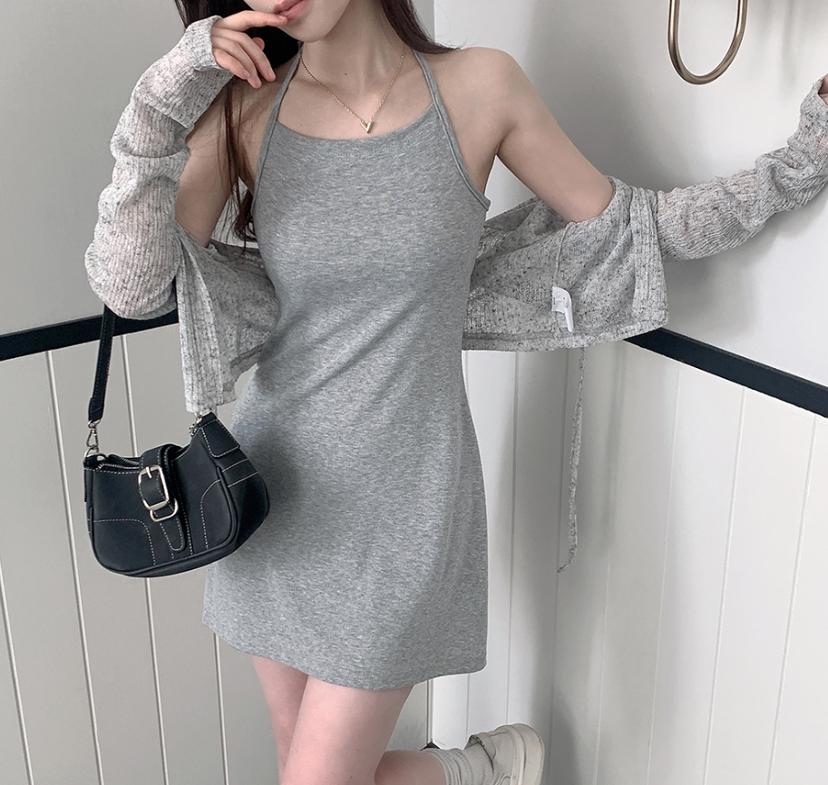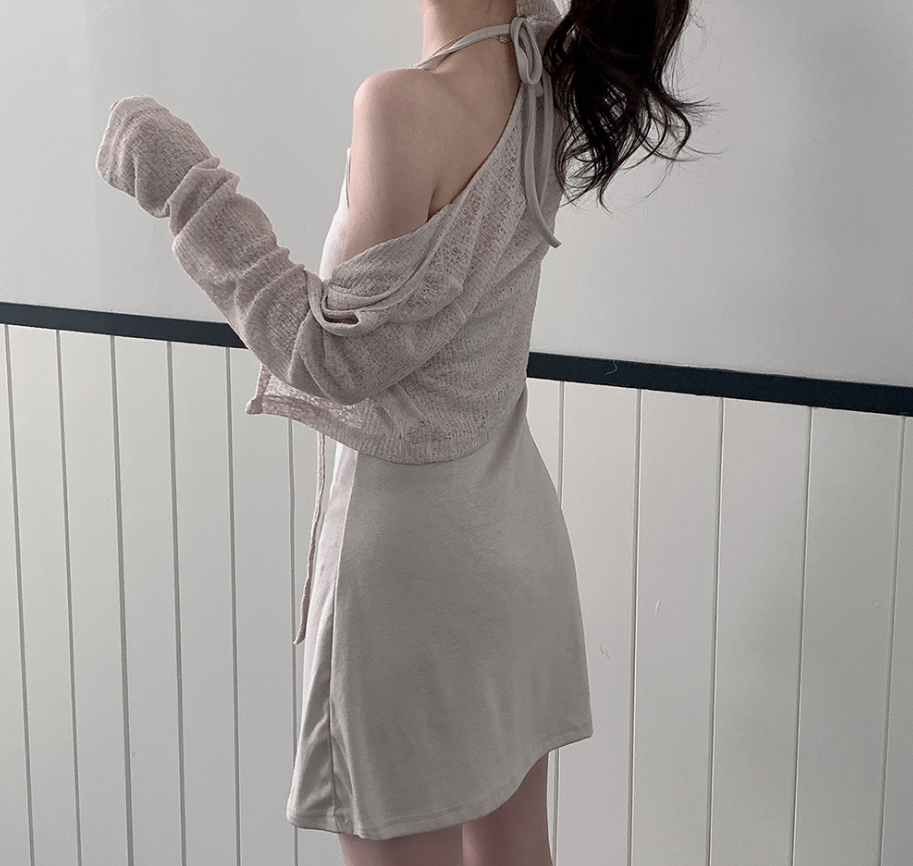露背掛頸連身裙配綁帶針織外套【5色入】