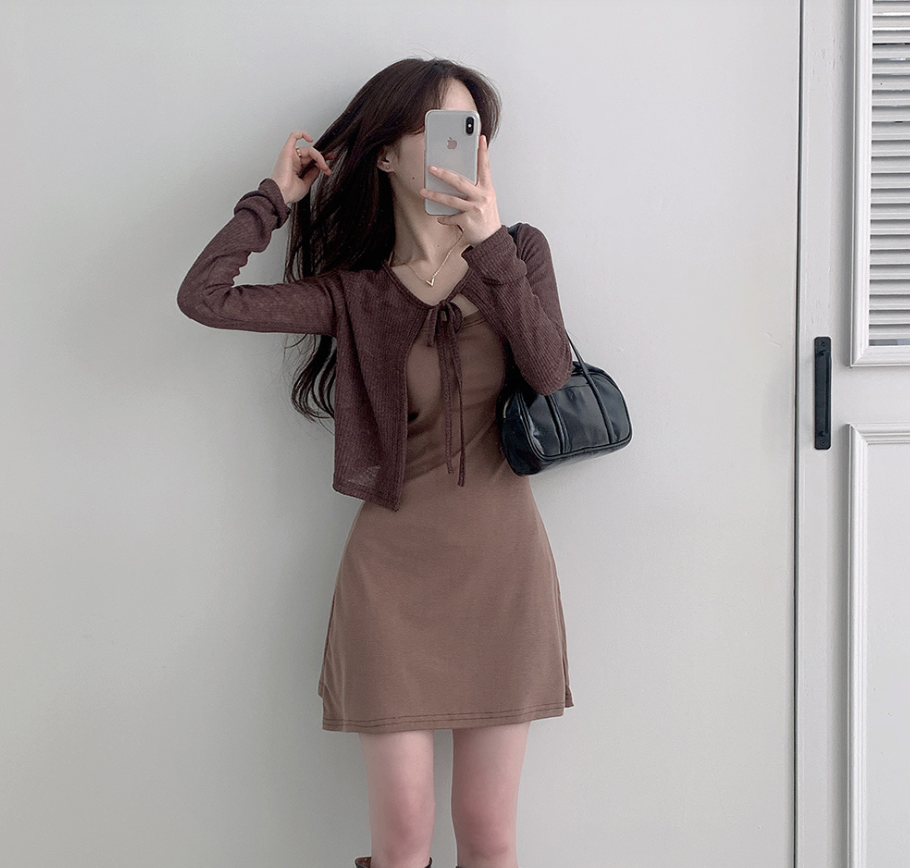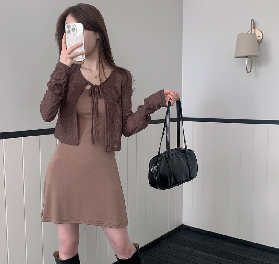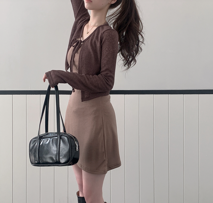 (•‾⌣‾•)短版外套配同色A字裙💕設計簡約富有層次感❤️詮釋溫柔慵懶韓系風格