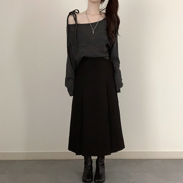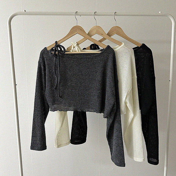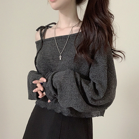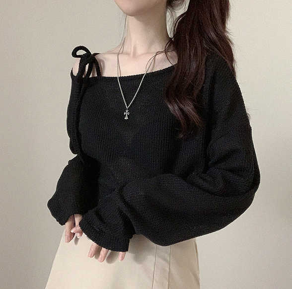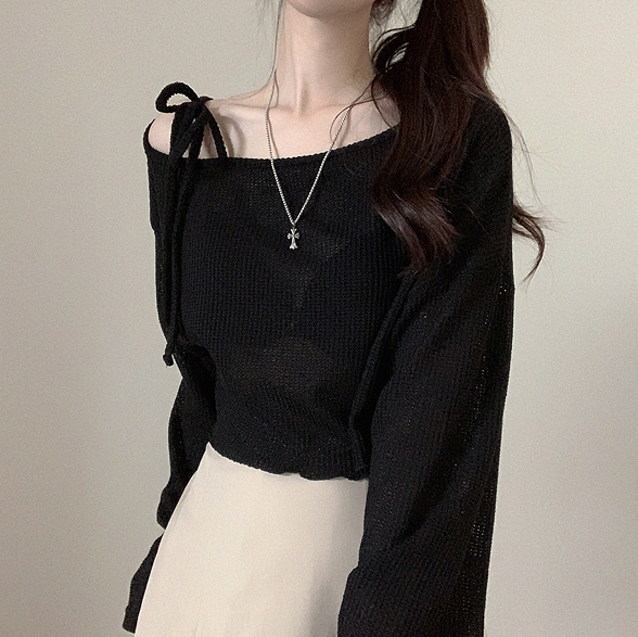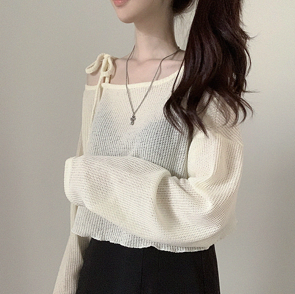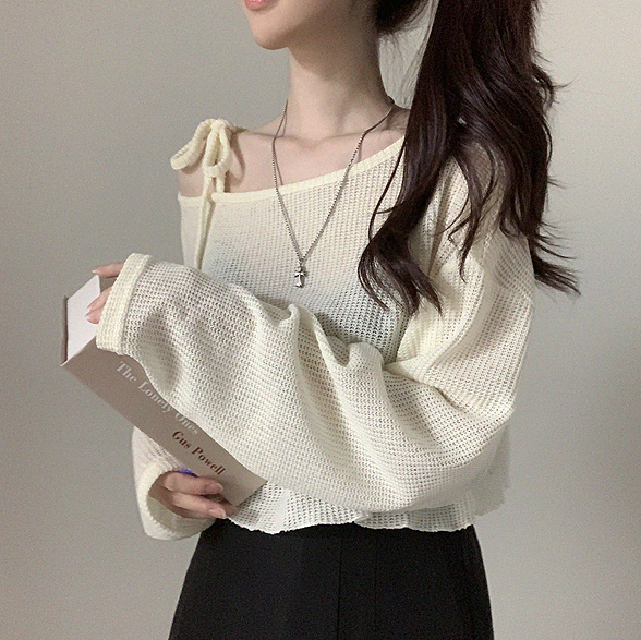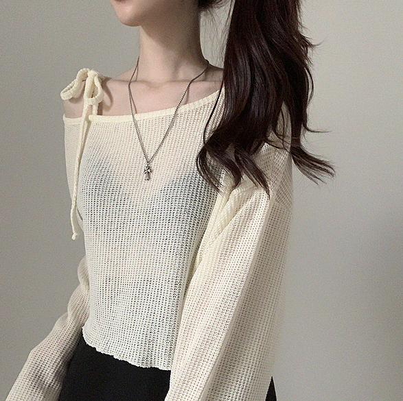 斜露肩綁帶透薄上衣