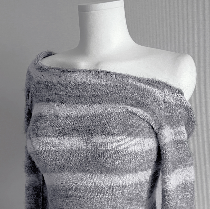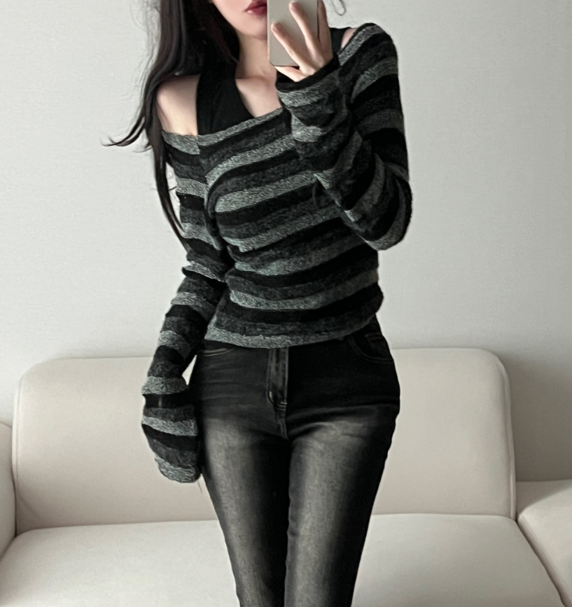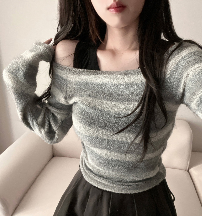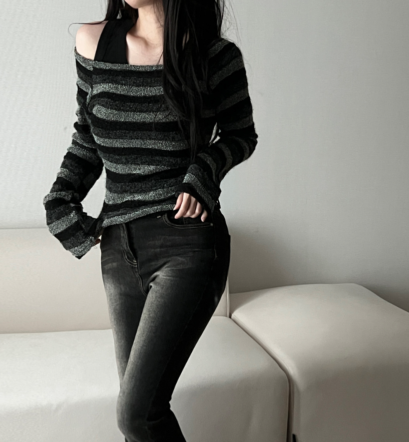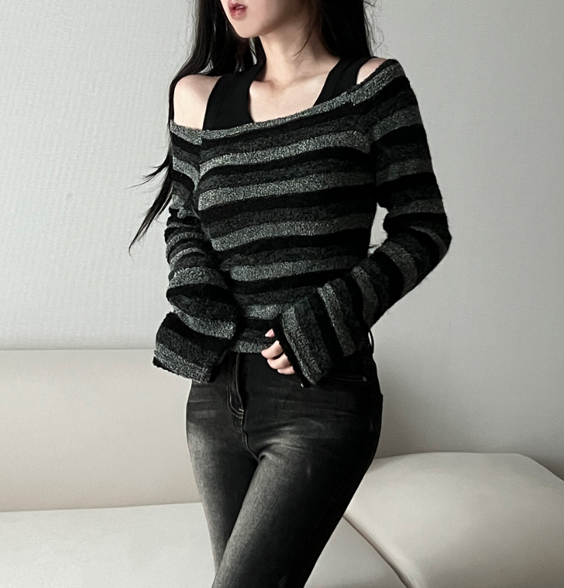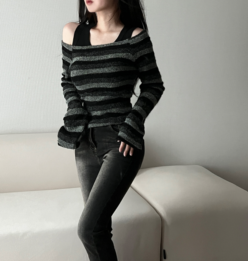 復古條紋露肩針織衫 - 現貨