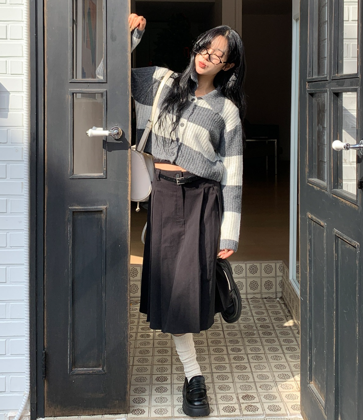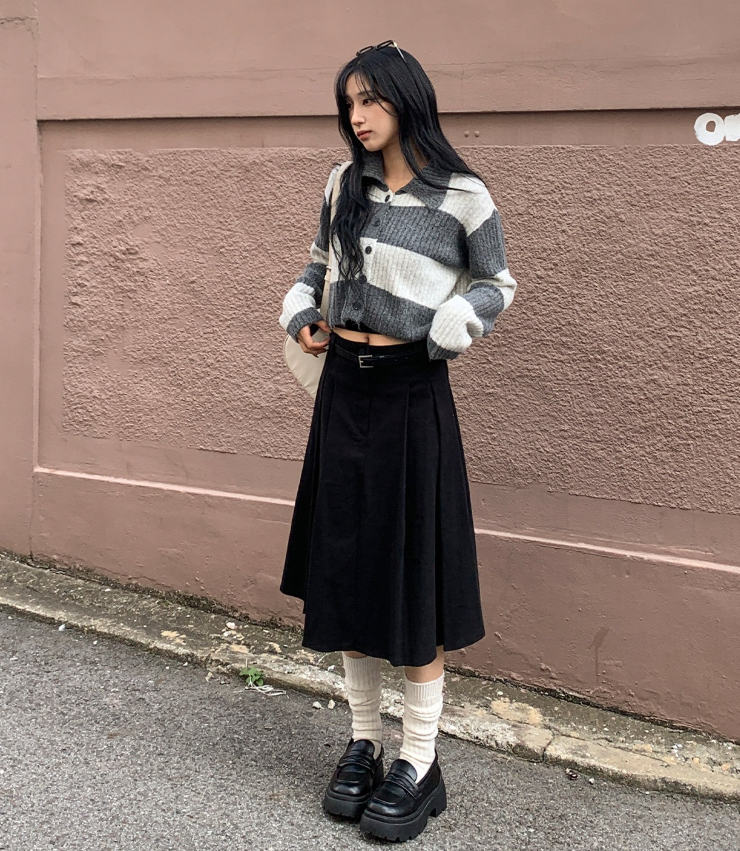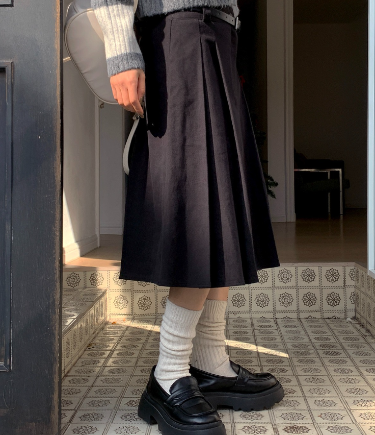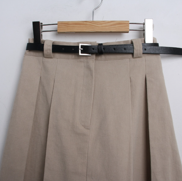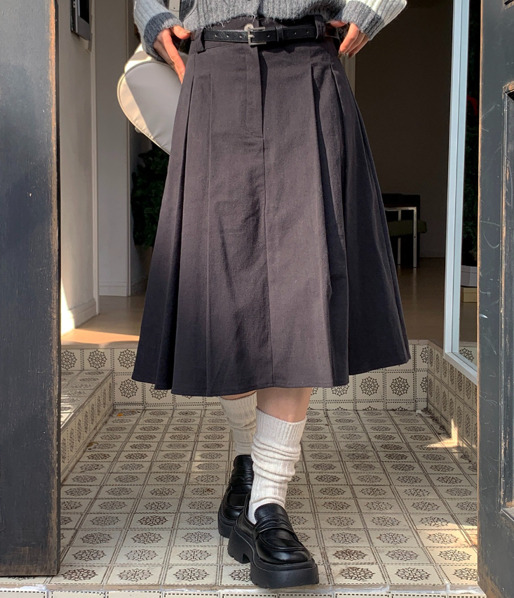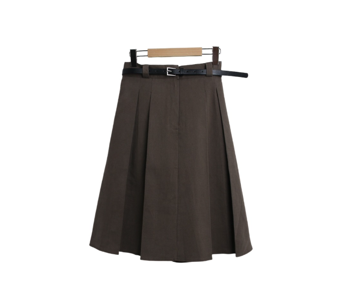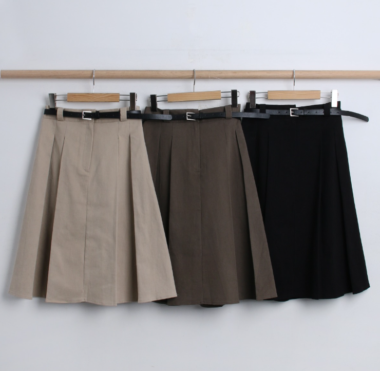 百褶中長裙連腰帶