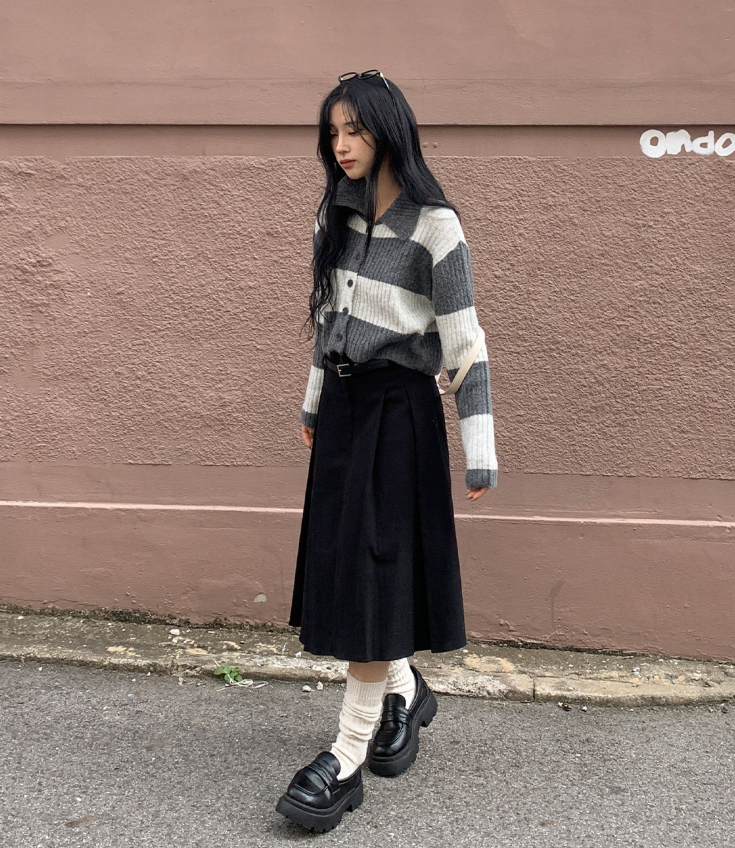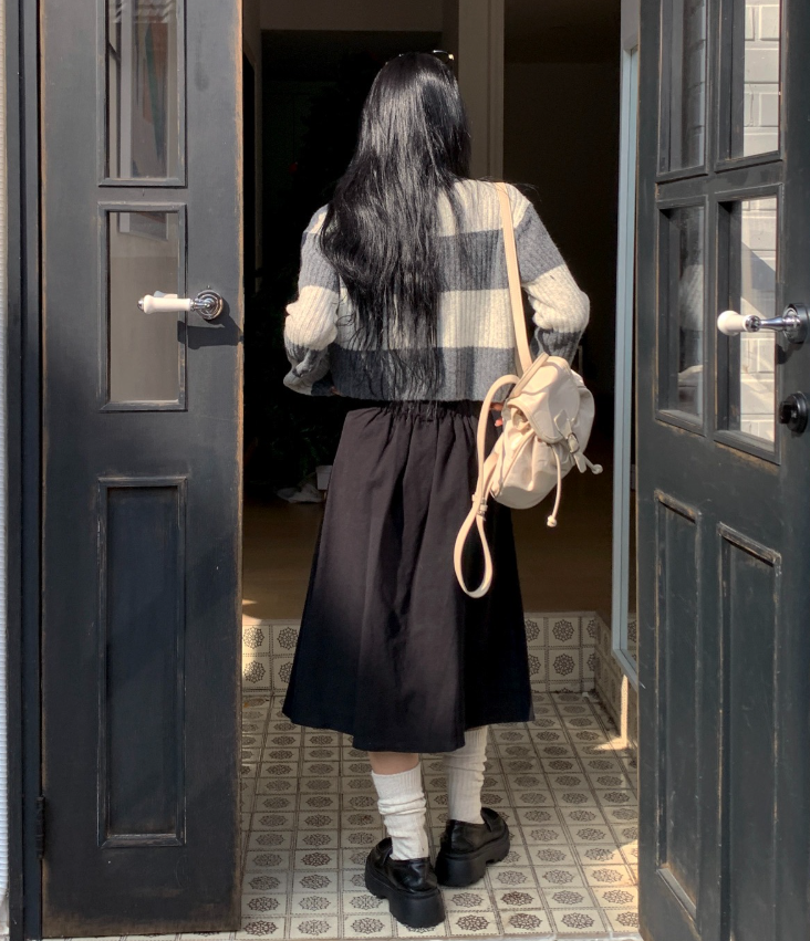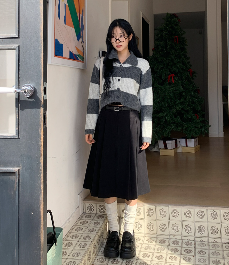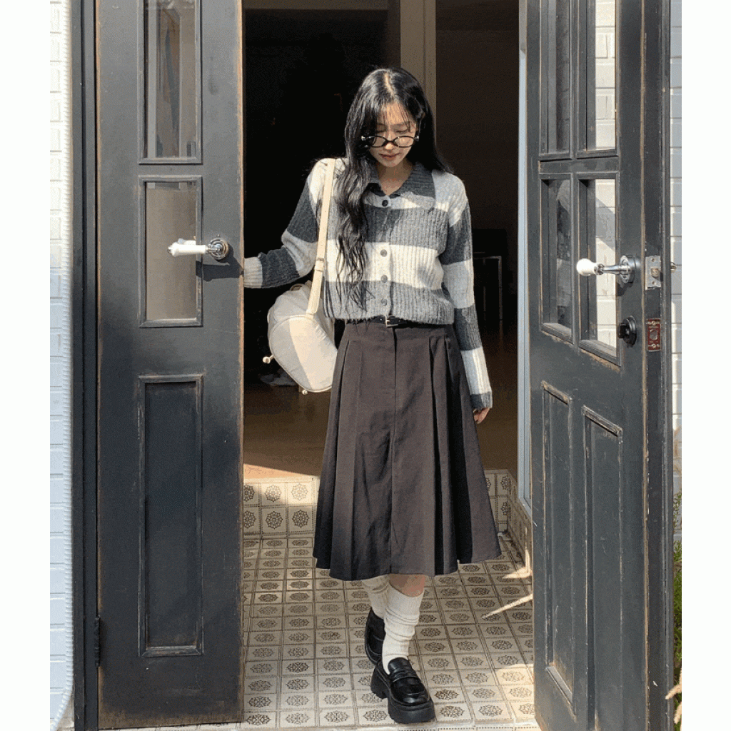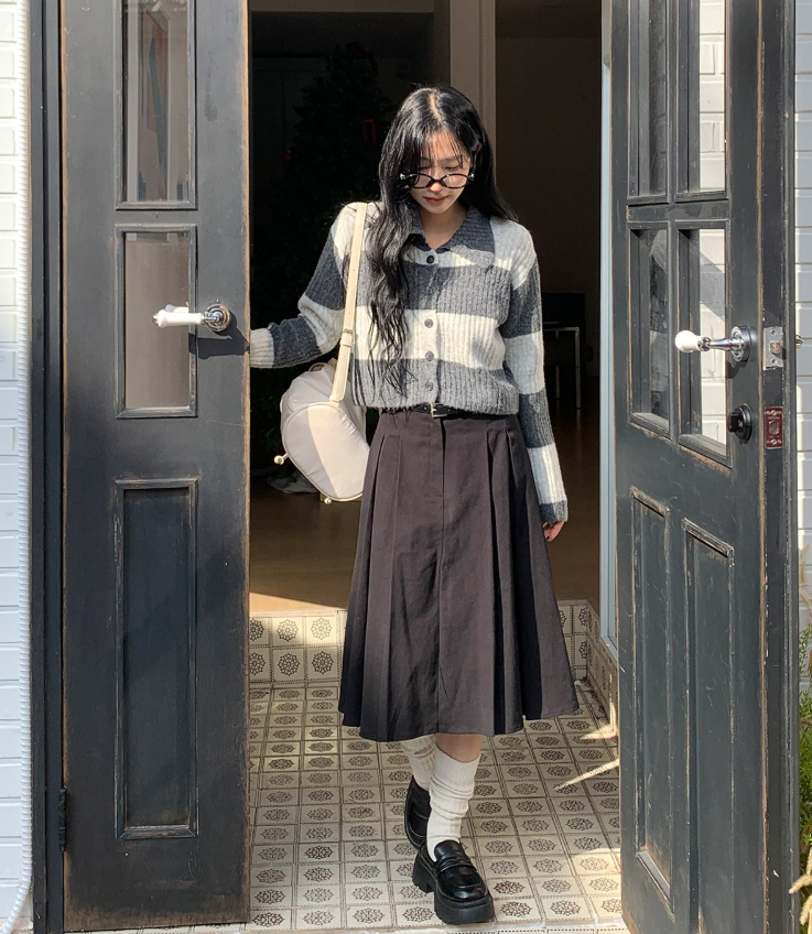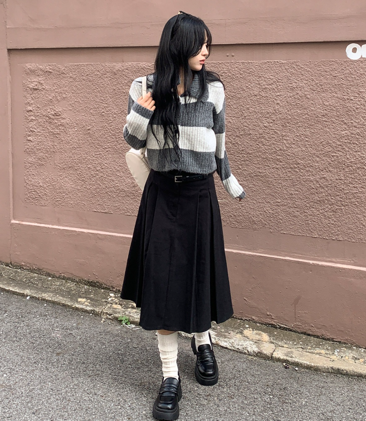 百褶中長裙連腰帶