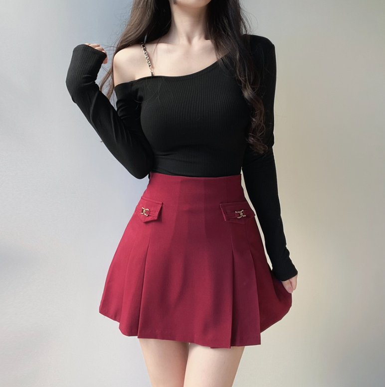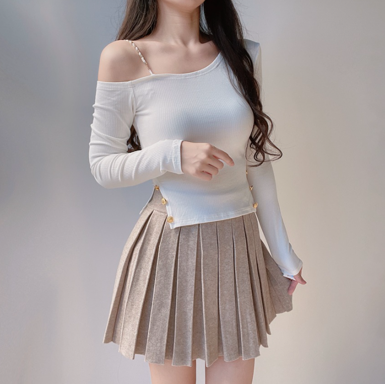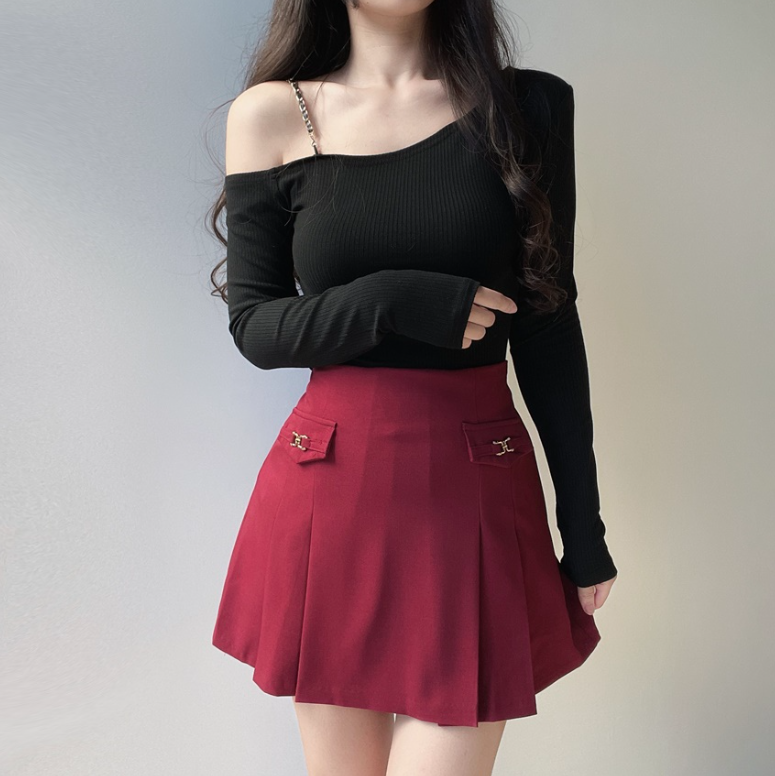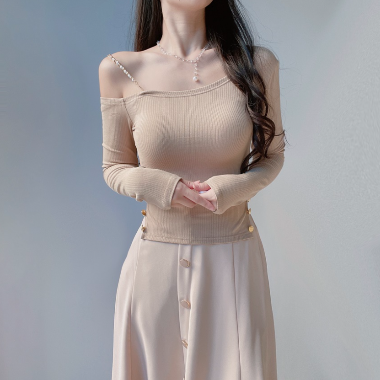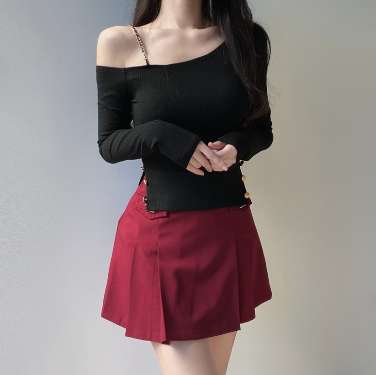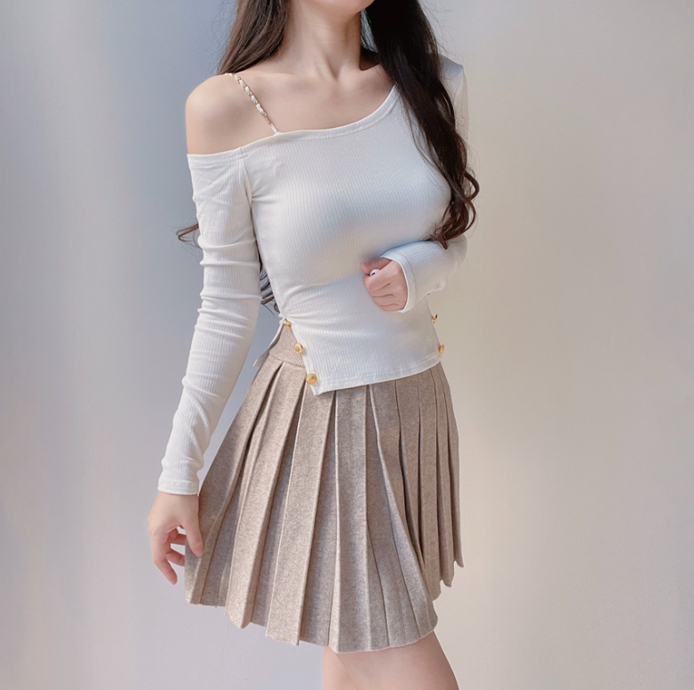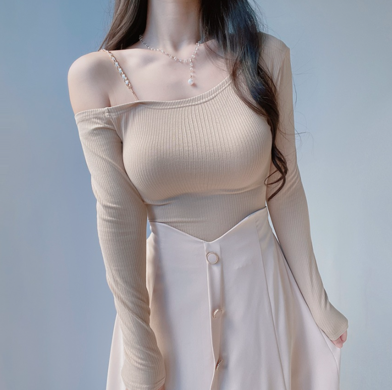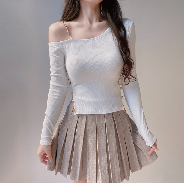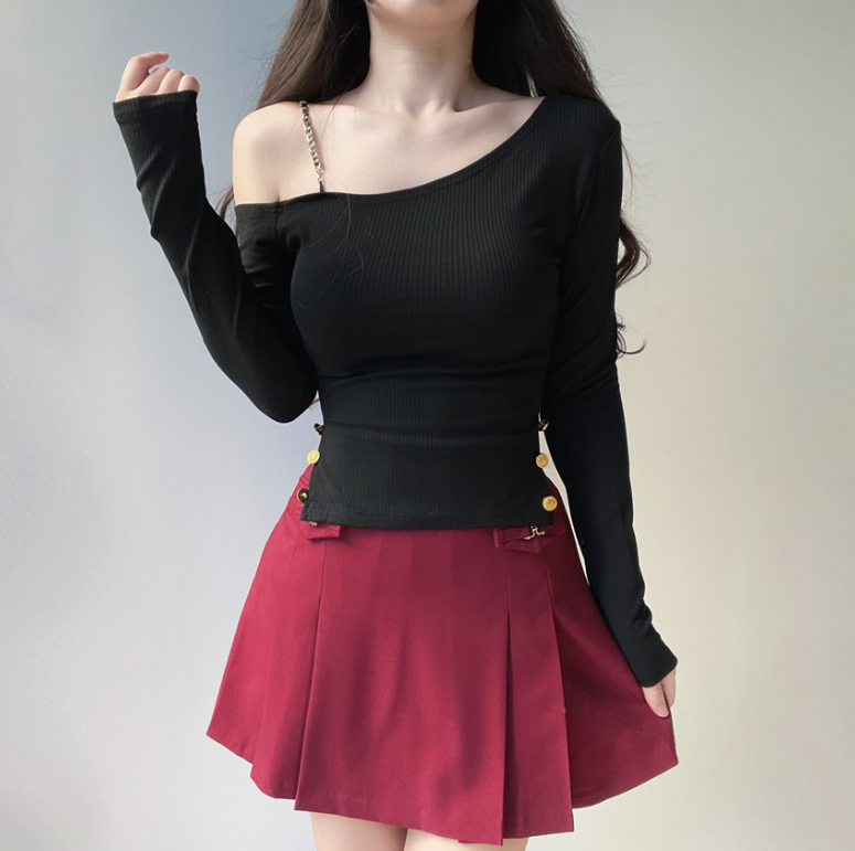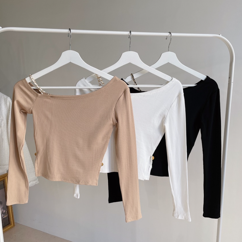 (●ˇ∀ˇ●)單邊露肩位置有金鏈點綴好特別❤️貼身設計好顯身材簡單低調💕