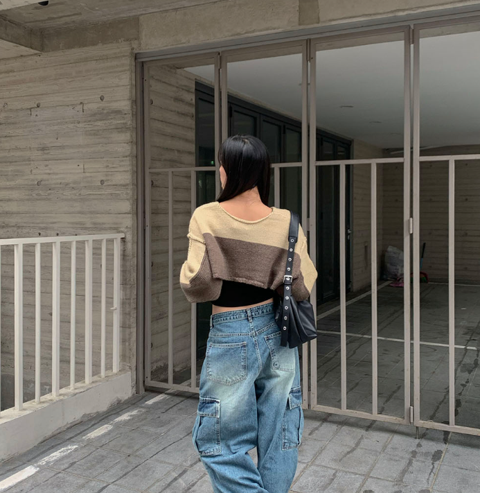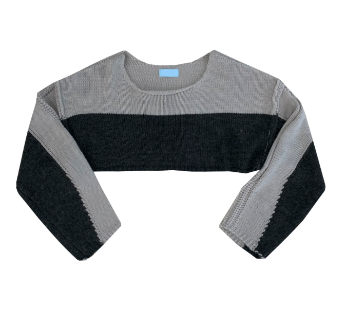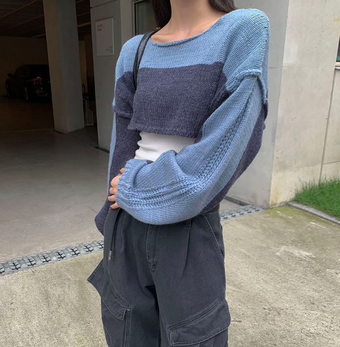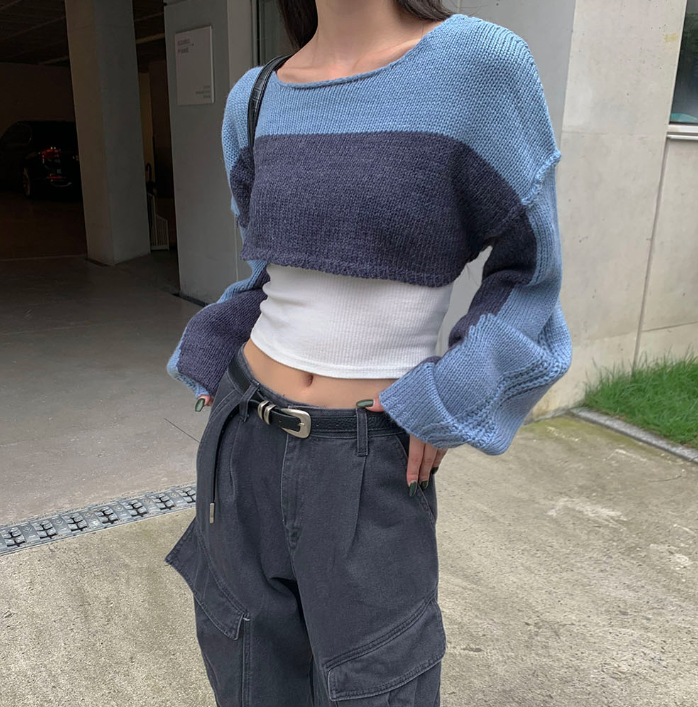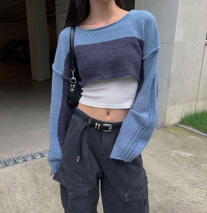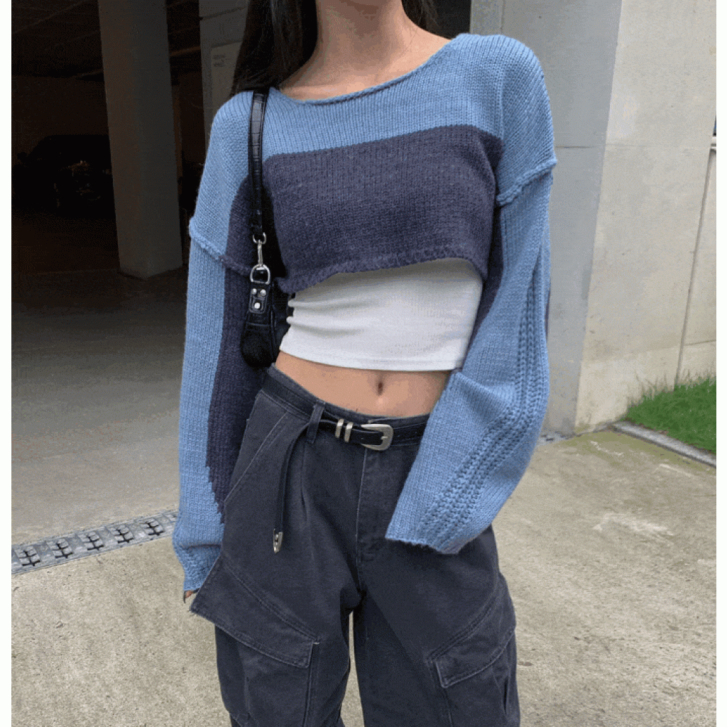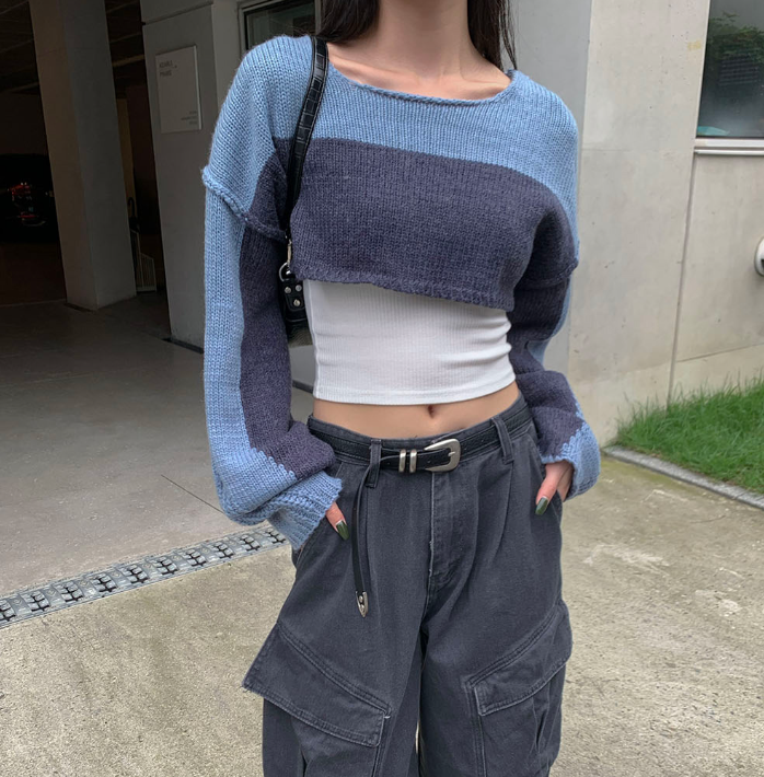 (•‾⌣‾•)拼色短款針織上衣❤️有點Y2K風格💕