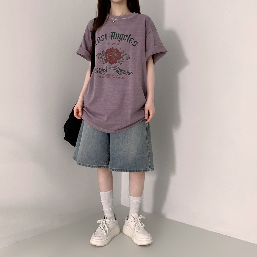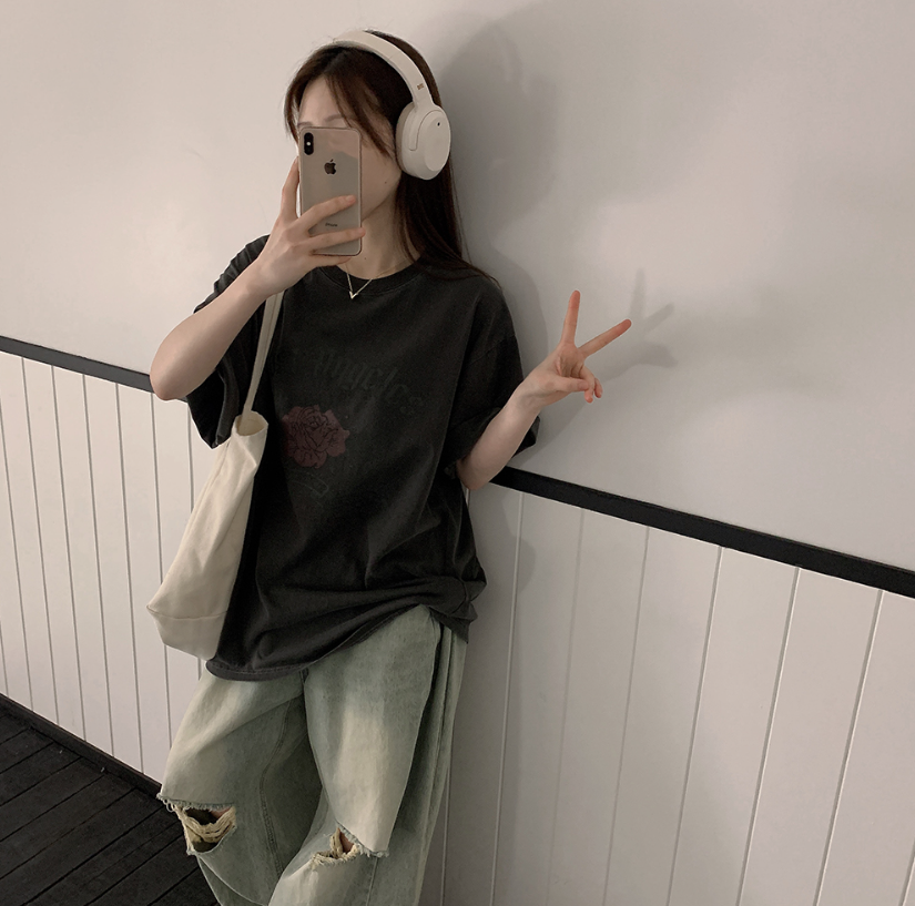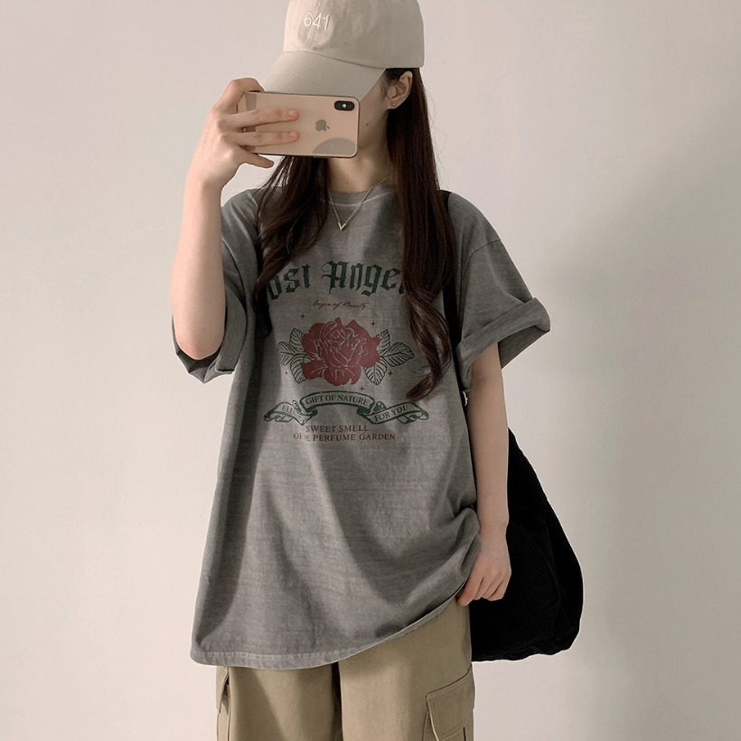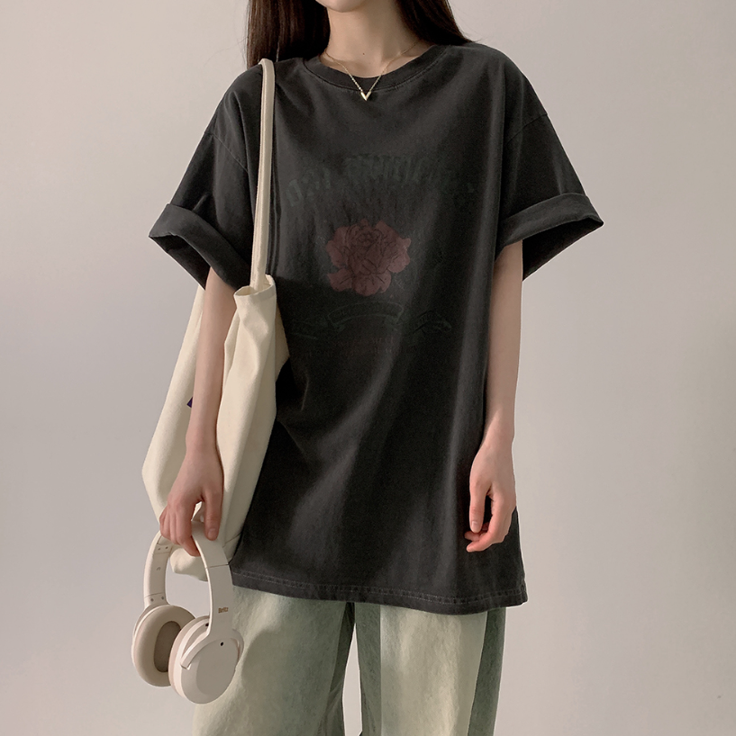 寬鬆玫瑰圖案T恤【男女可穿】【情侶裝】