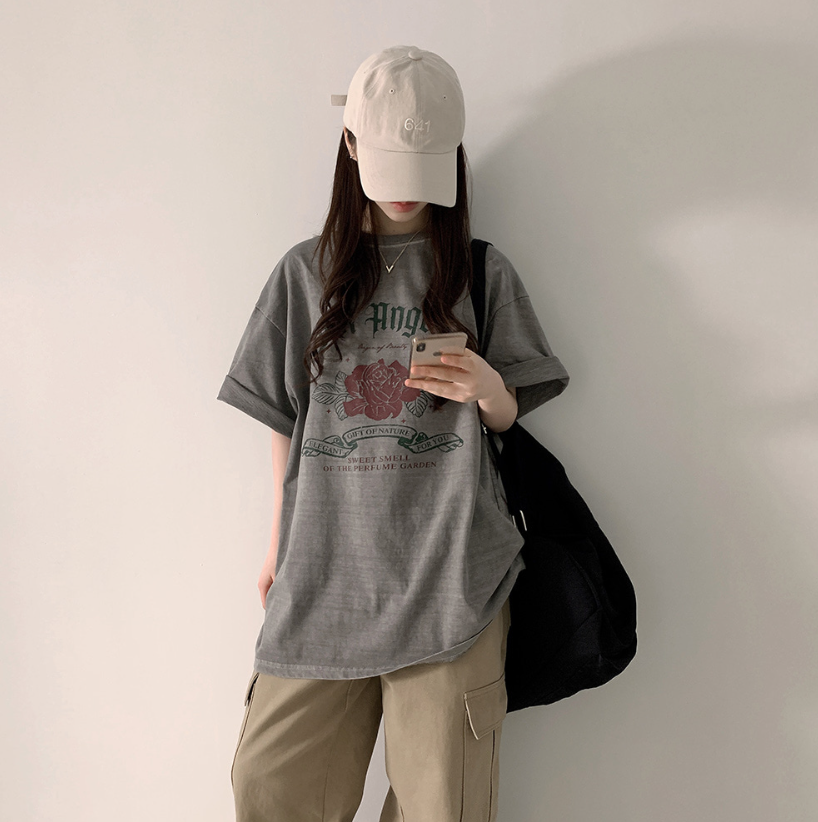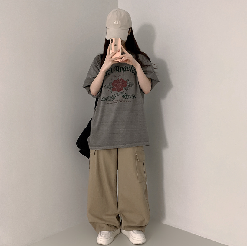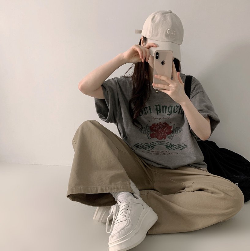 (•‾⌣‾•)寬鬆玫瑰圖案短袖💕中意中性型格風既你就最適合啦❤️