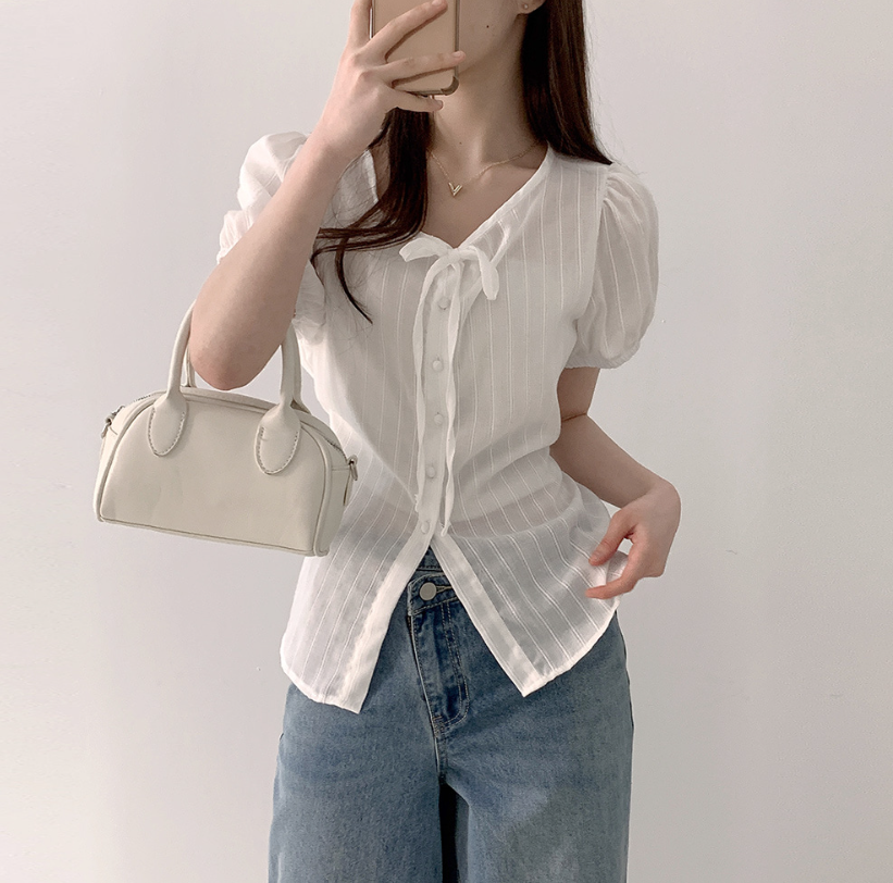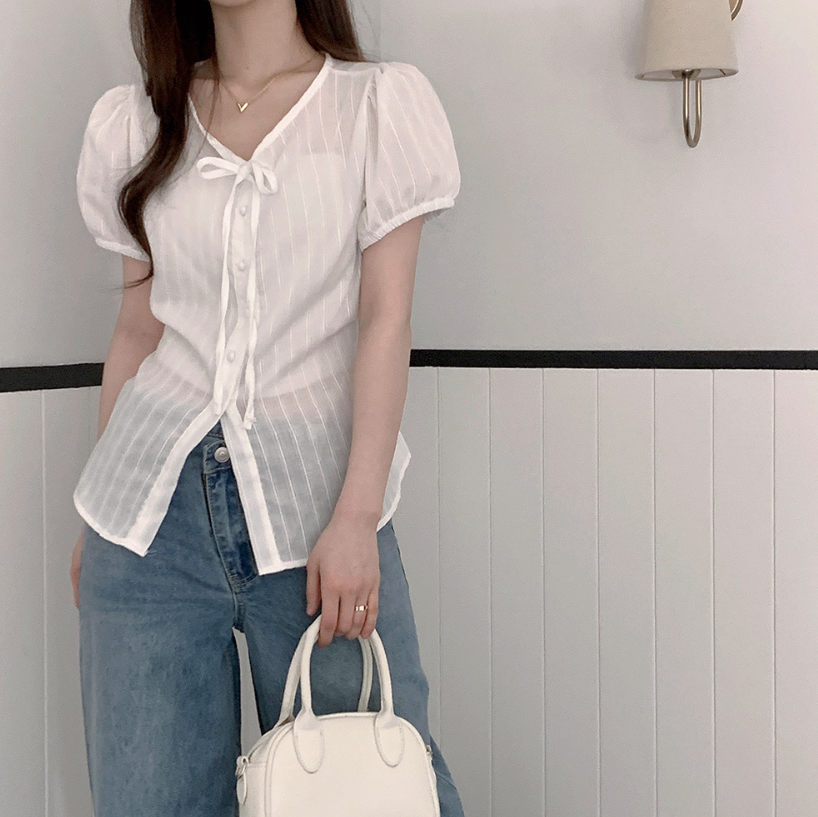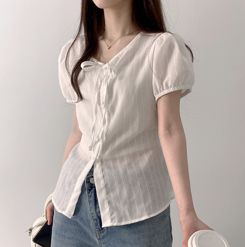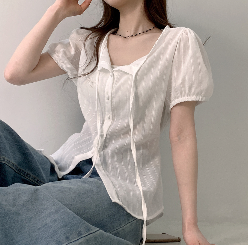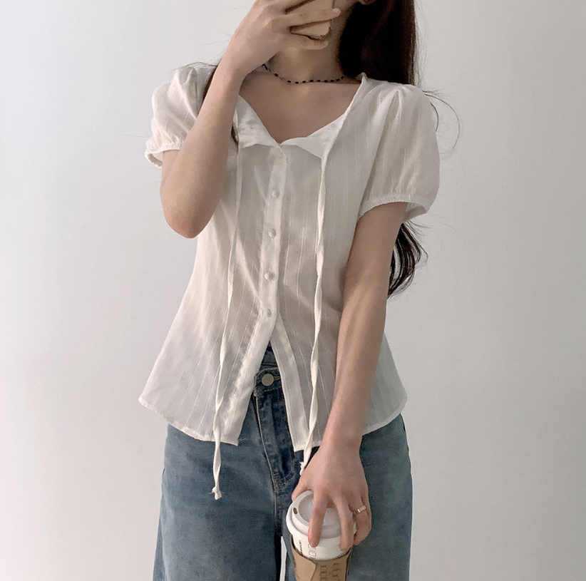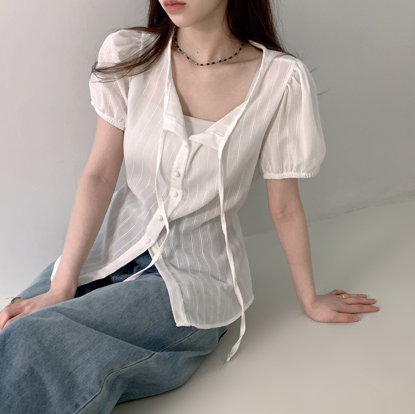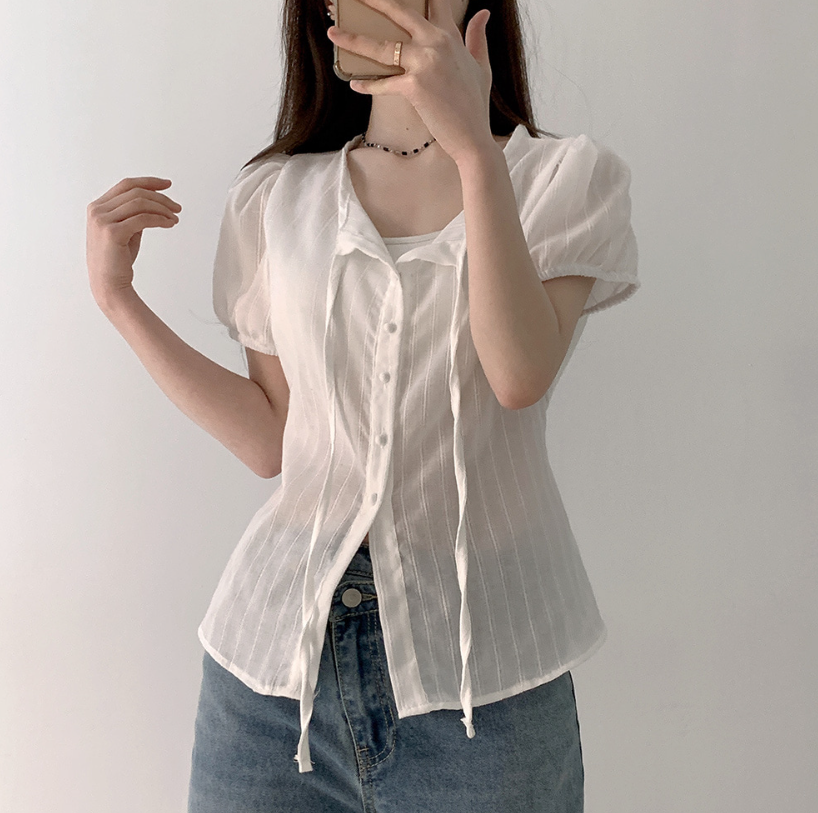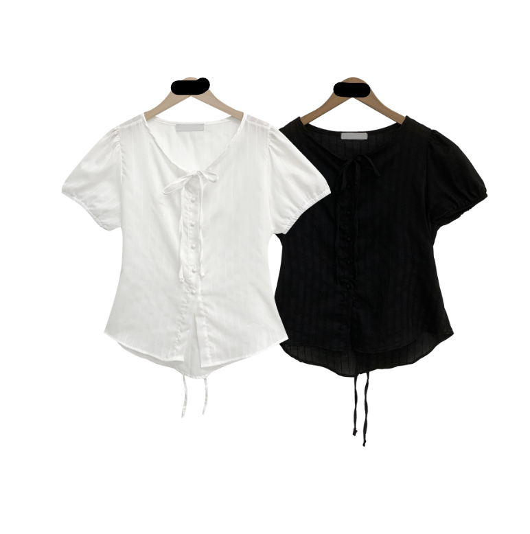 (•‾⌣‾•)小清新既透薄上衣💕綁帶設計可以自由調節腰位更顯身材❤️
