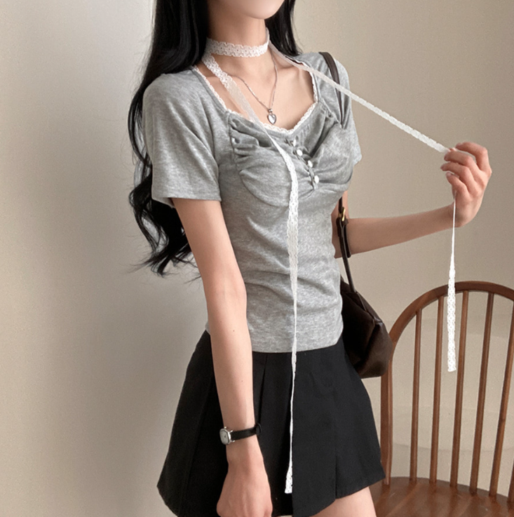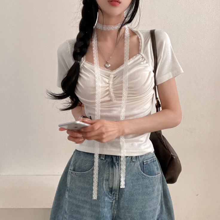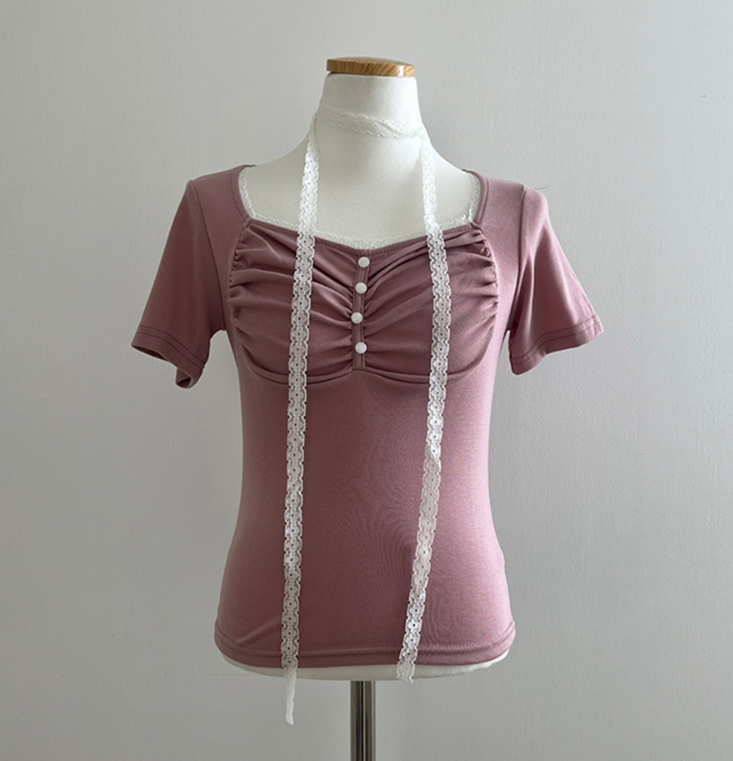 (•‾⌣‾•)領位皺皺設計更顯胸型美感💕比普通T恤更有特色❤️配上小蕾絲美觀又獨特