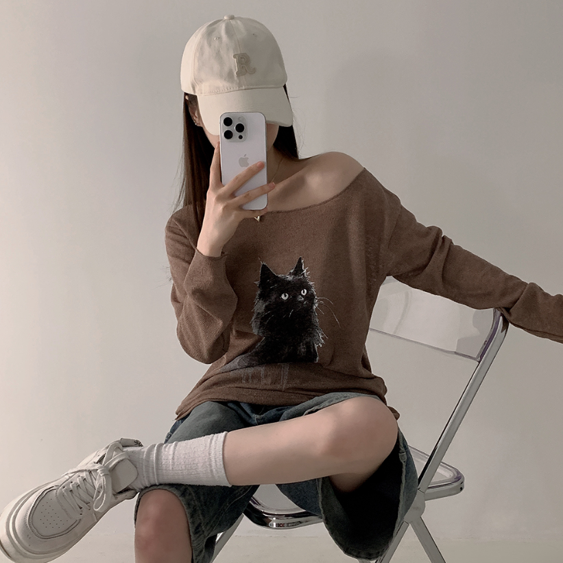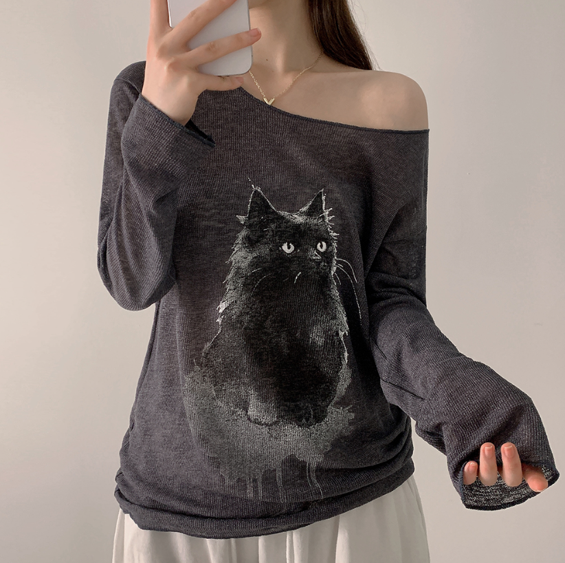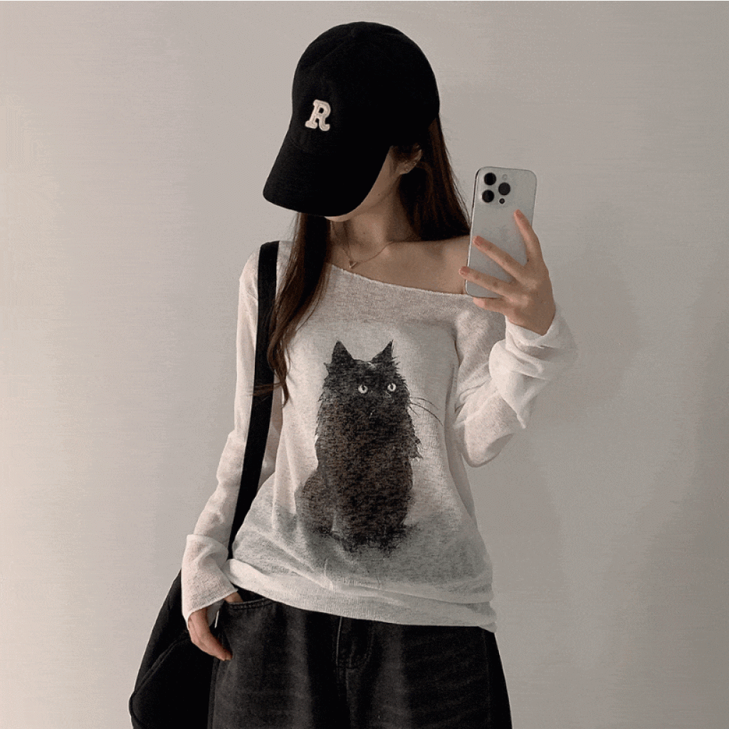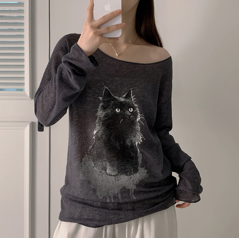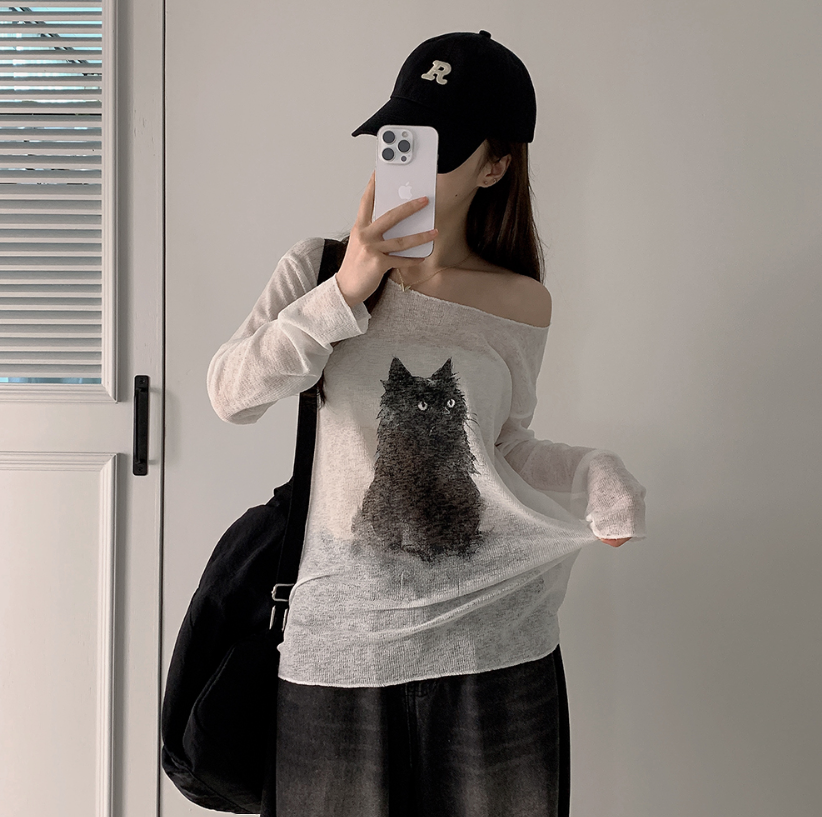 (•‾⌣‾•)露肩透薄貓貓針織上衣❤️有點可愛又Y2K風格下身可以配搭裙或褲都無問題💕