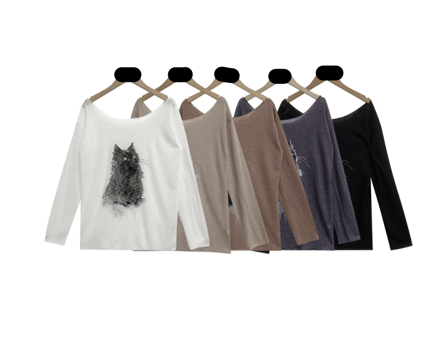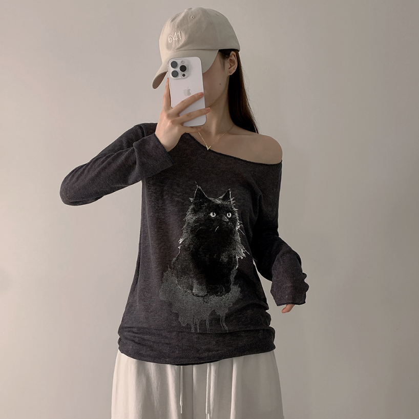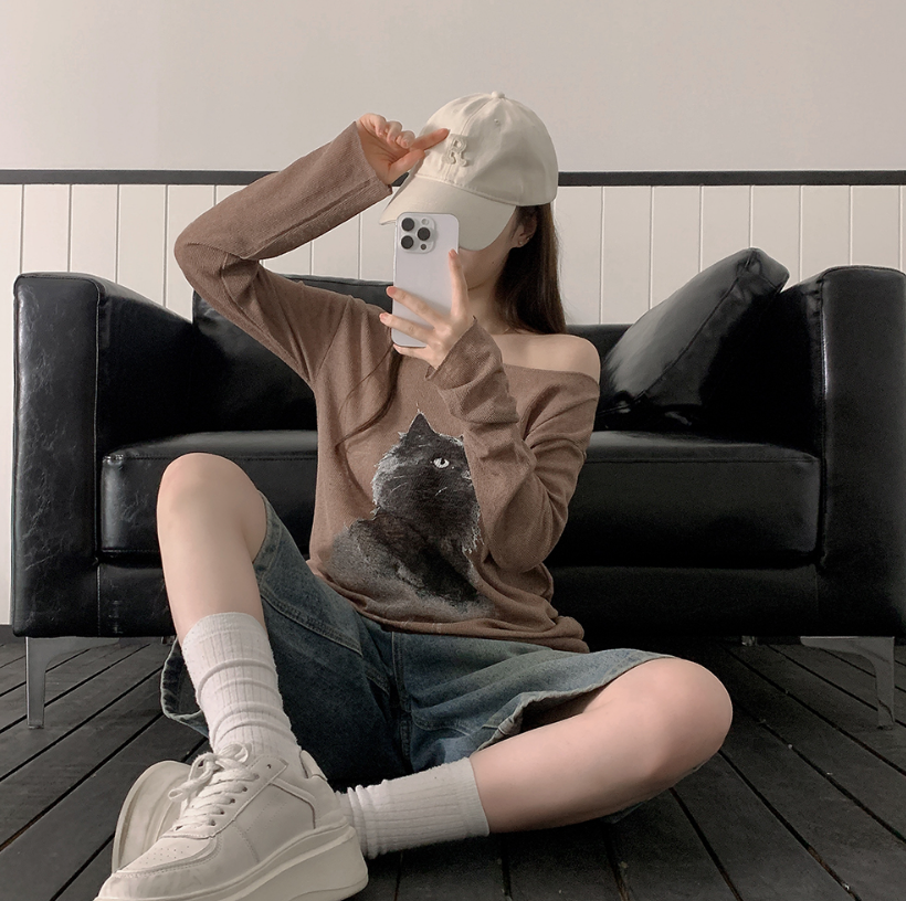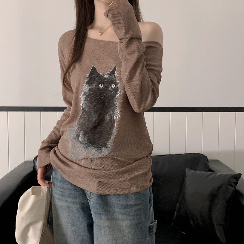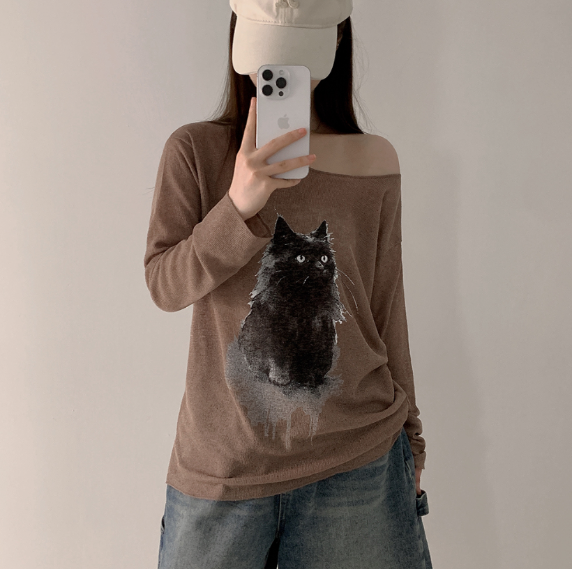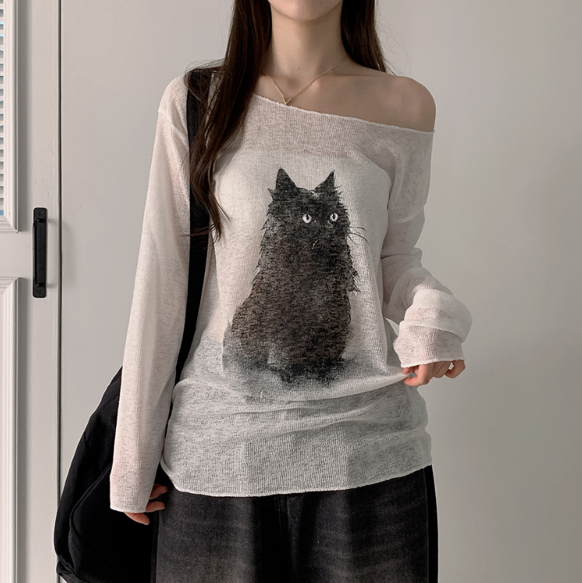 (•‾⌣‾•)露肩透薄貓貓針織上衣❤️有點可愛又Y2K風格下身可以配搭裙或褲都無問題💕