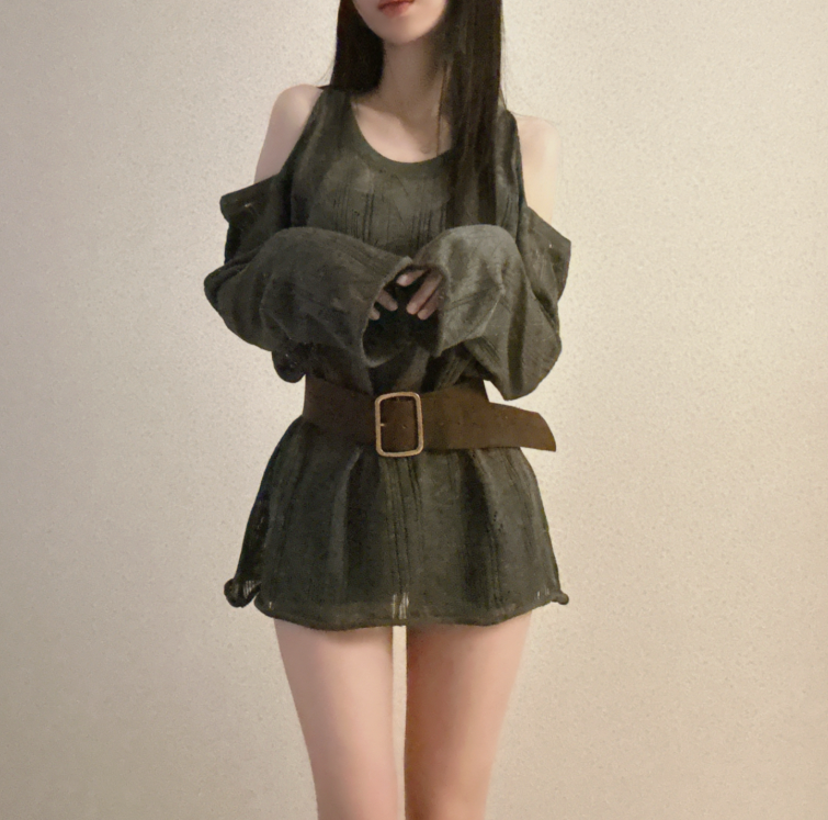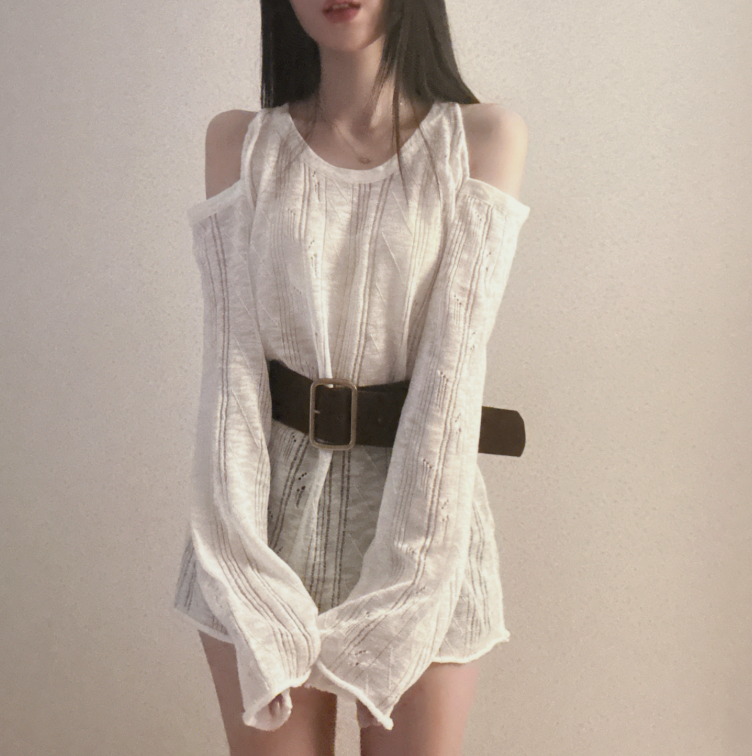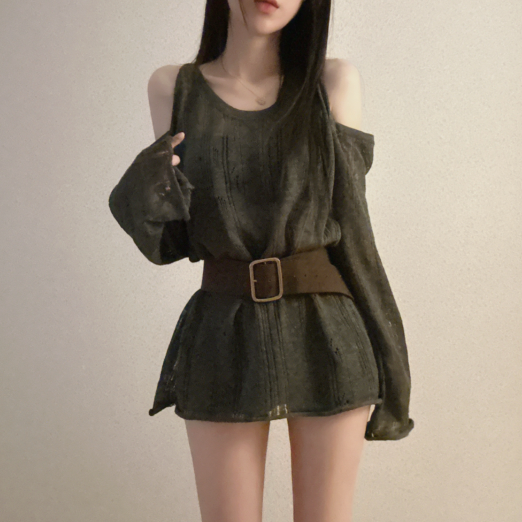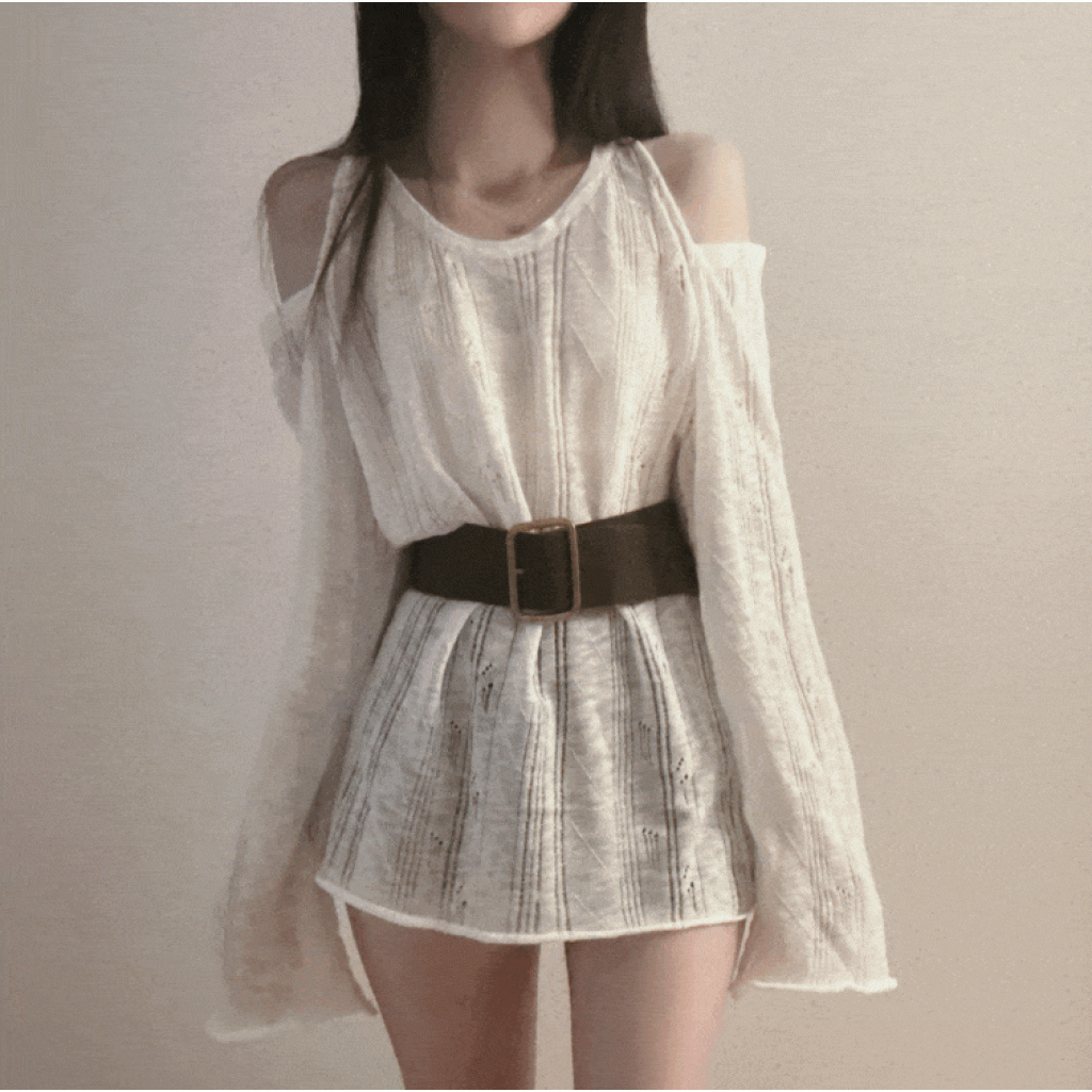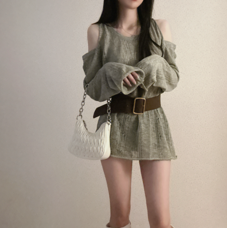 (•‾⌣‾•)露肩寬鬆針織❤️套裝配上粗腰帶可以修飾腰線💕