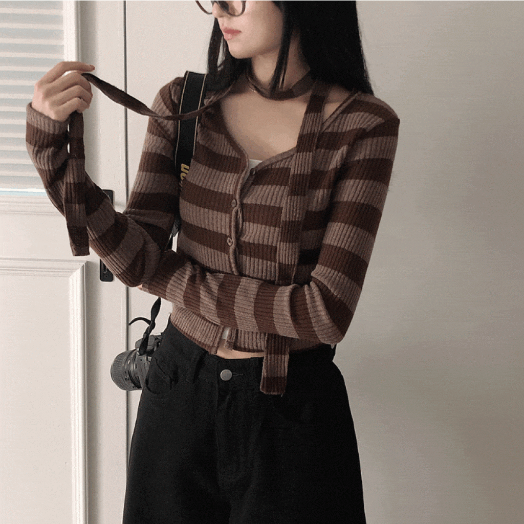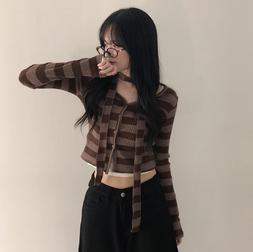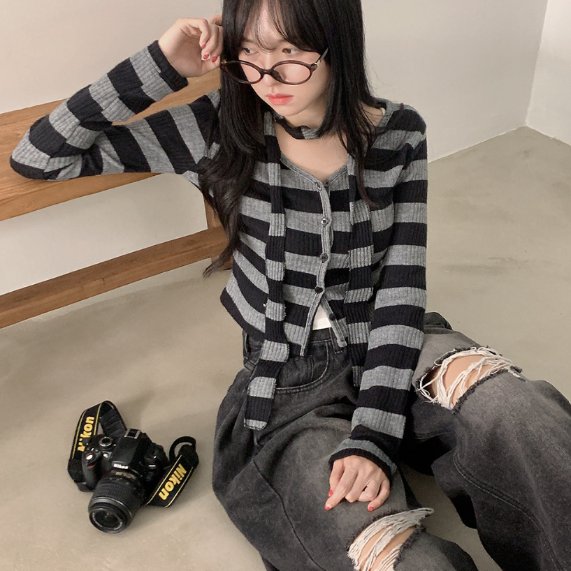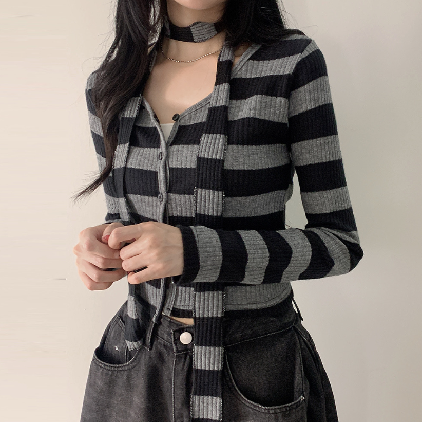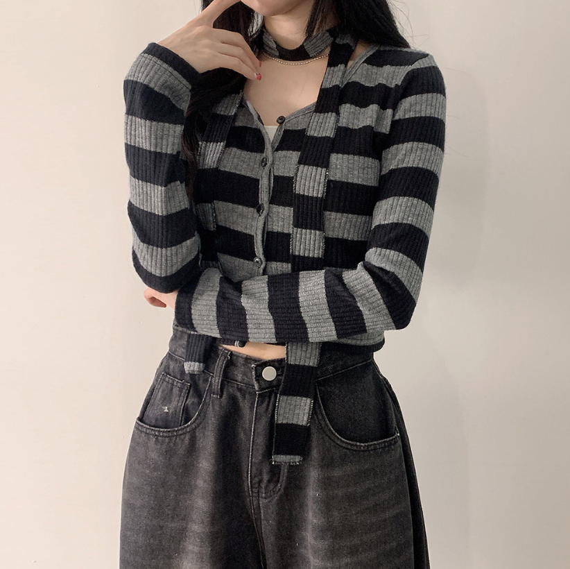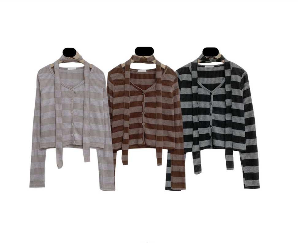 間條短版外套配圍巾套裝【3色入】 - 現貨