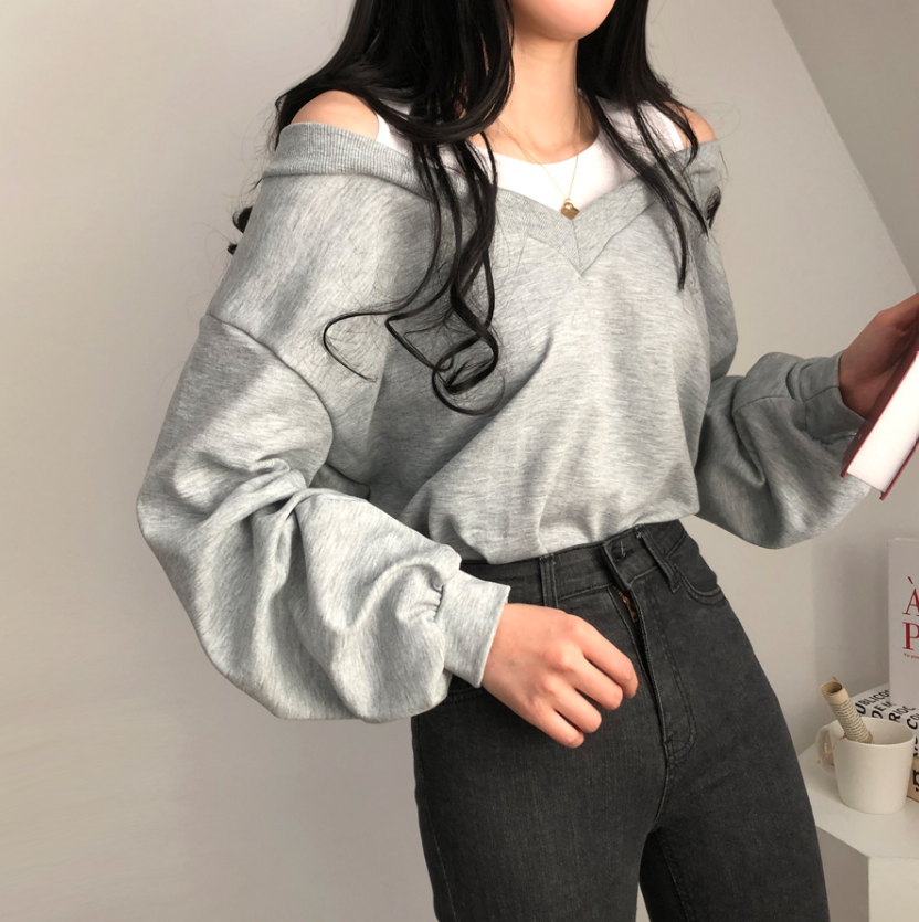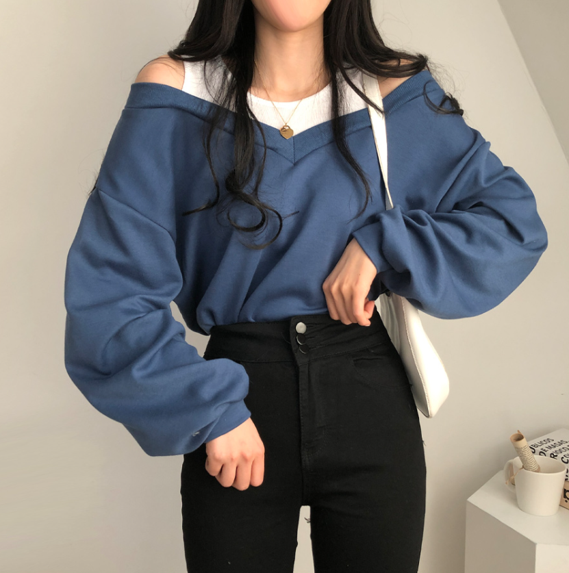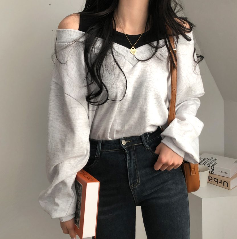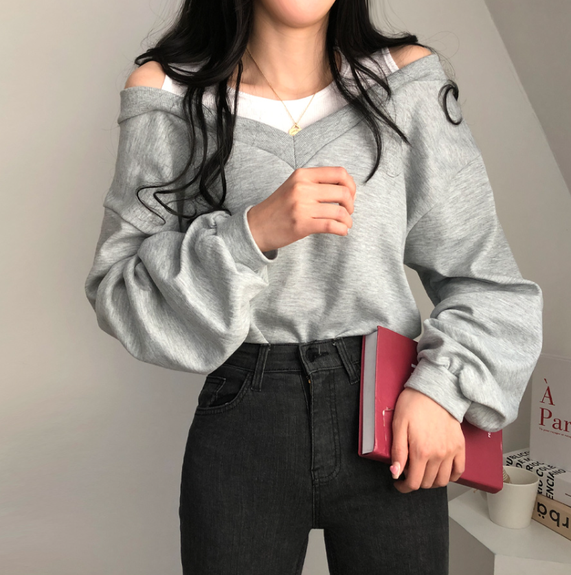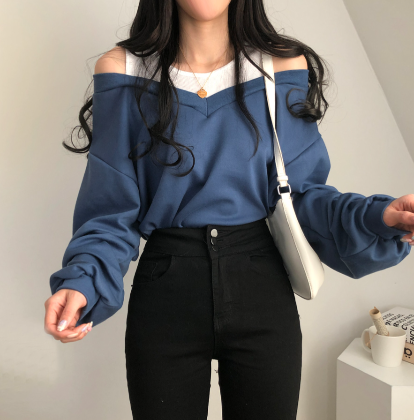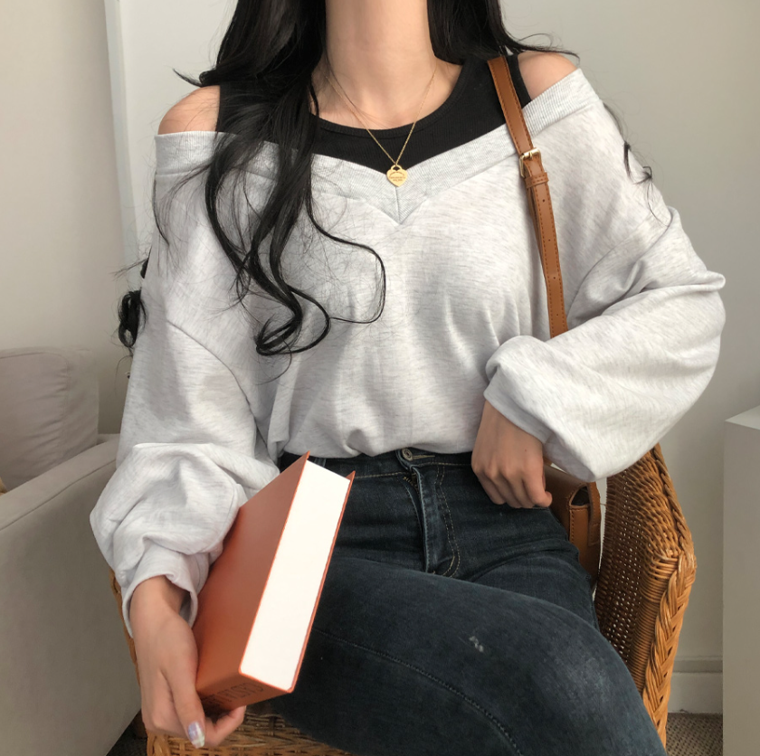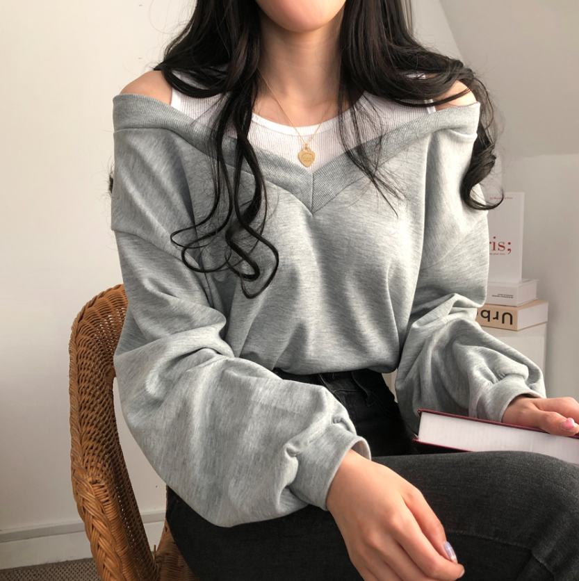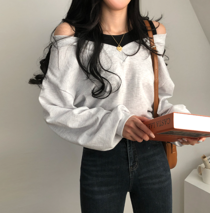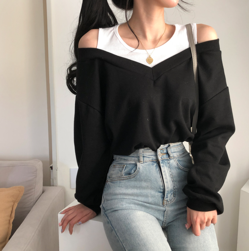 假兩件露肩長袖衛衣