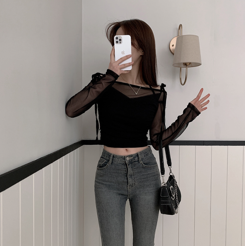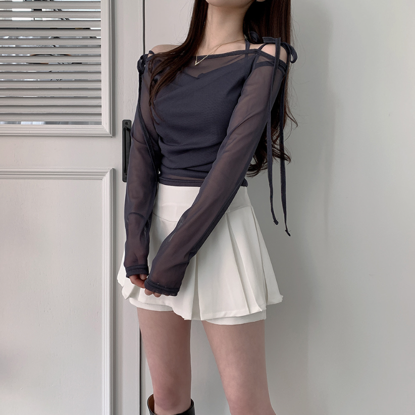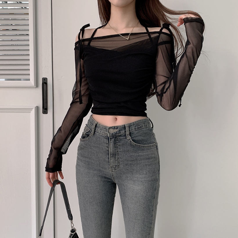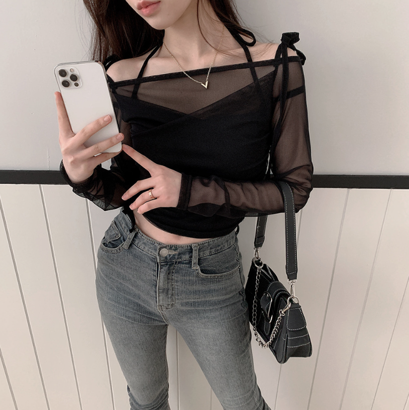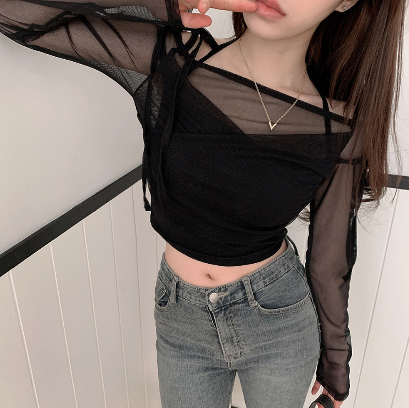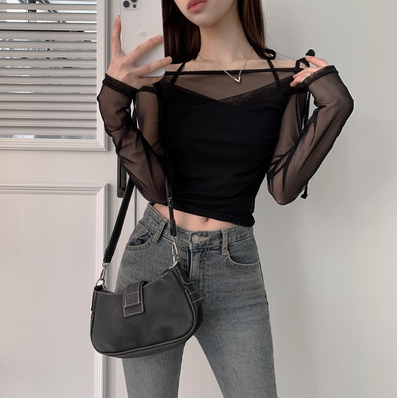 (•‾⌣‾•)一字肩透視T恤配小背心有點神秘小性感💕好適合入秋既天氣穿著❤️